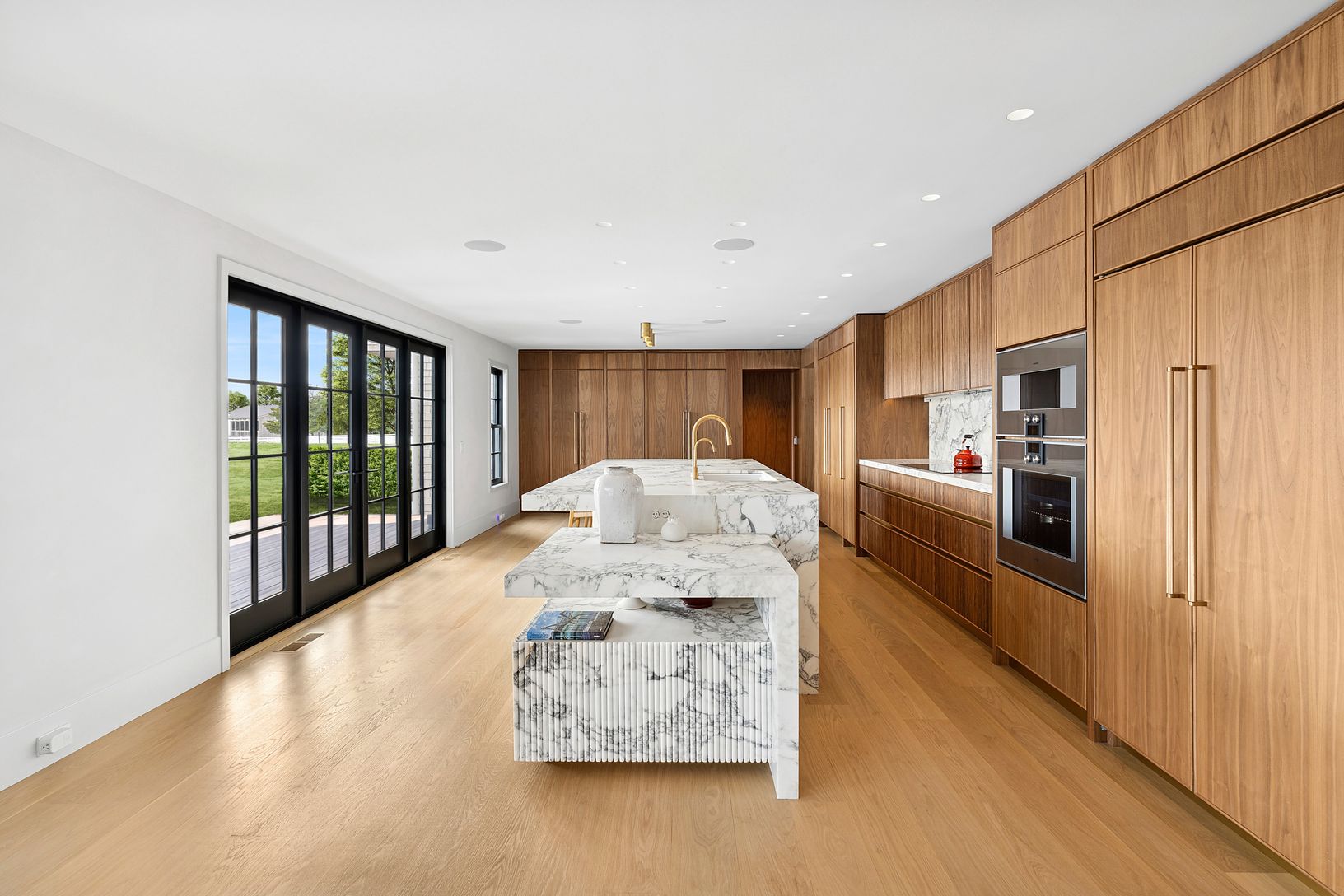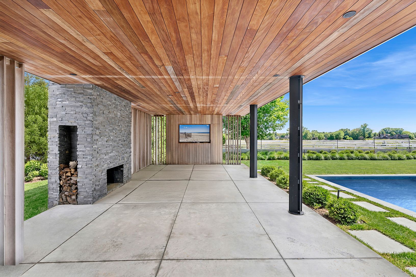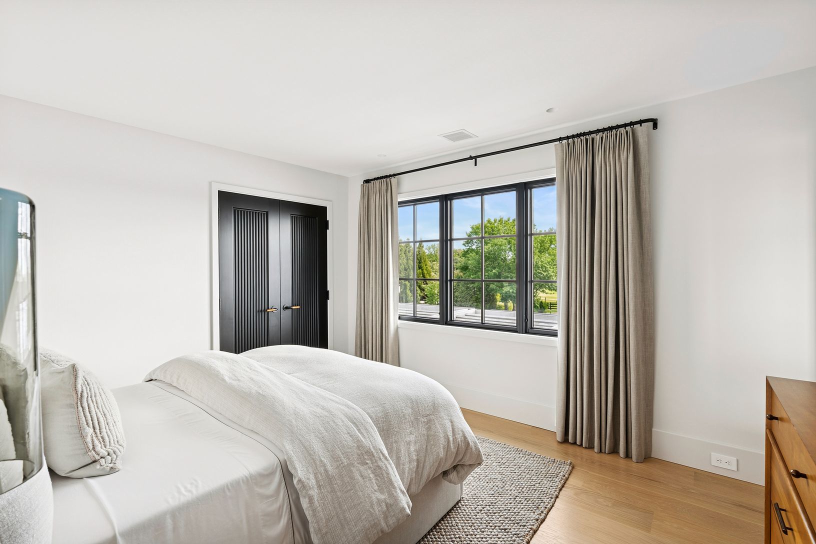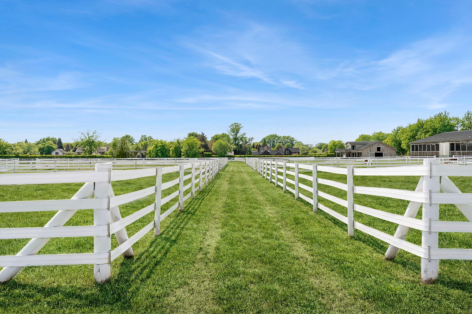 Overlooking 14 acres of agricultural reserve and open horse farm, this newly completed farmhouse delivers a rare summer offering in one of Wainscott's most coveted south-of-the-highway settings. Thoughtfully designed and impeccably executed, the home showcases exceptional craftsmanship and elevated finishes at every turn. A dramatic double-height foyer with limewash walls sets the tone, leading to a gracious living room with gas fireplace, sun