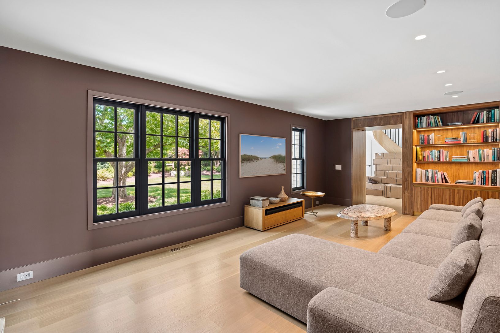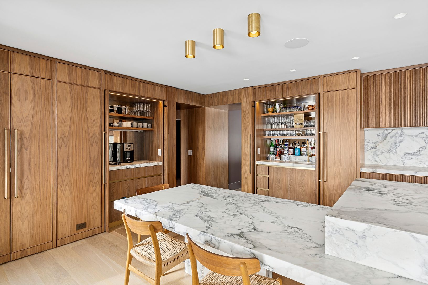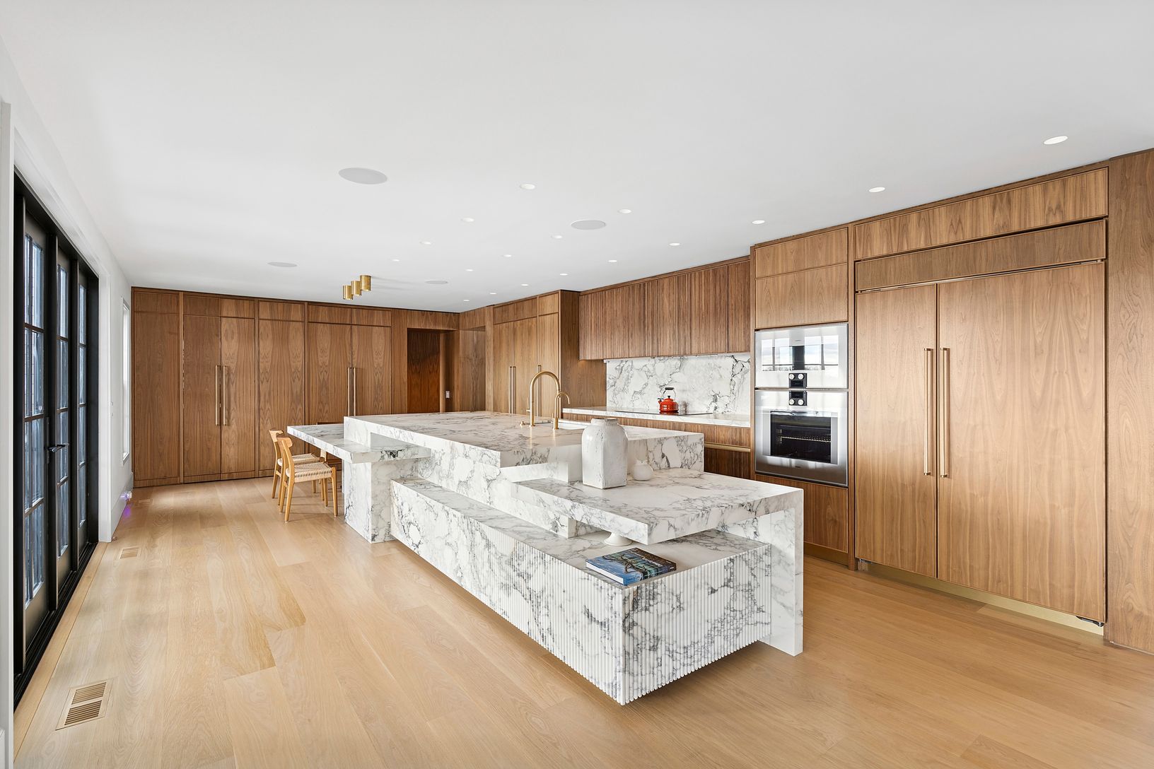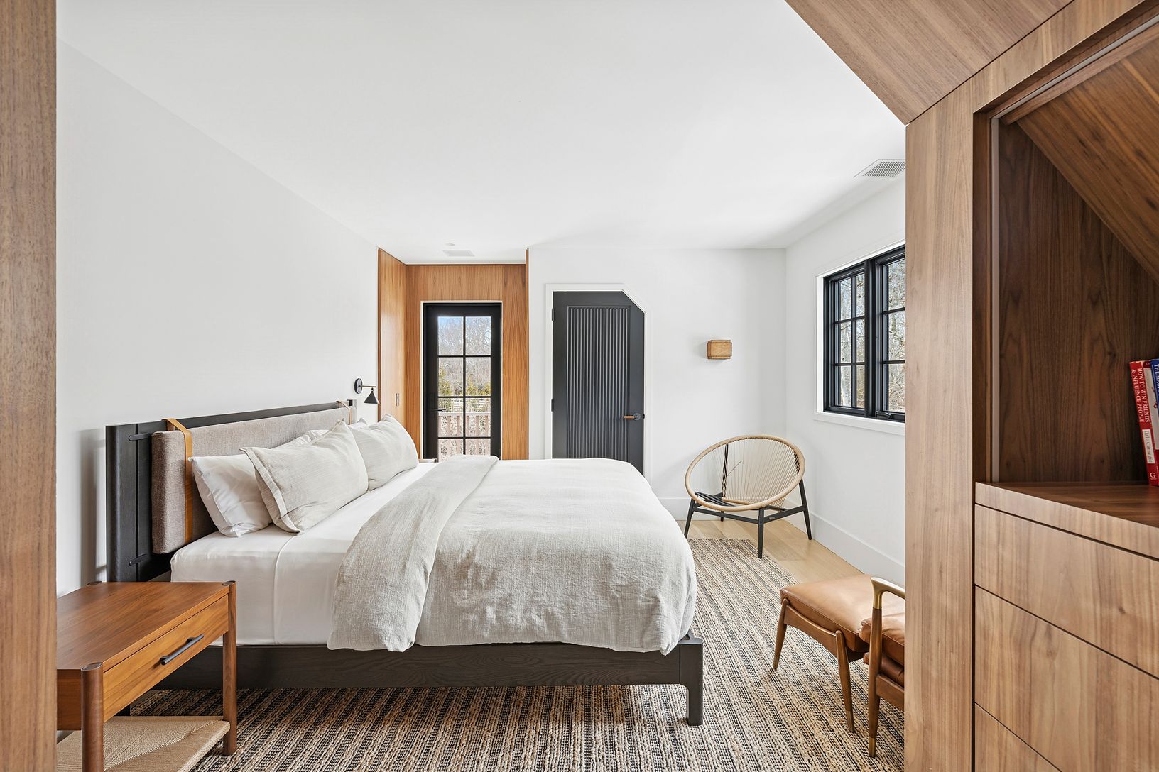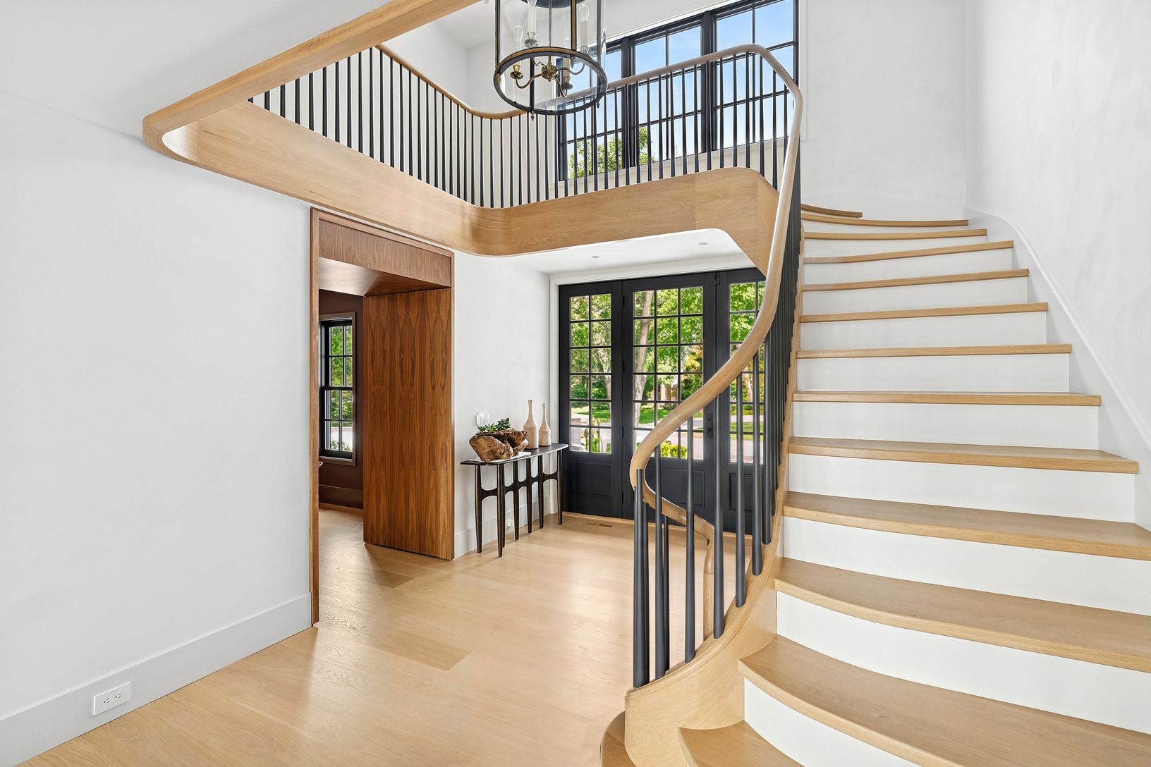 Overlooking 14 acres of agricultural reserve and open horse farm, this newly completed farmhouse delivers a rare summer offering in one of Wainscott's most coveted south-of-the-highway settings. Thoughtfully designed and impeccably executed, the home showcases exceptional craftsmanship and elevated finishes at every turn. A dramatic double-height foyer with limewash walls sets the tone, leading to a gracious living room with gas fireplace, sun