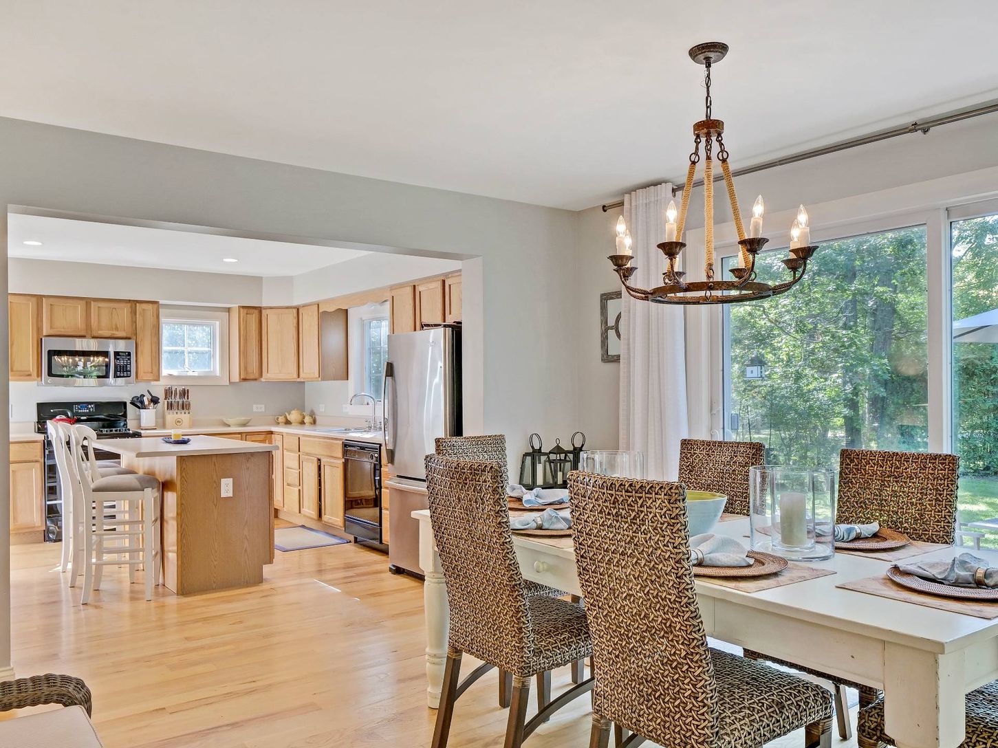 Welcome to this charming Hamptons cottage, ideally situated just steps away from waterfront dining, marinas, and a short drive to the village. This expansive 2,400 sq ft home offers a perfect blend of comfort and elegance, featuring four spacious bedrooms and two and a half baths. The inviting living room, complete with a cozy fireplace, sets the tone for relaxation, while the generous kitchen, equipped with a center island, is perfect for cul