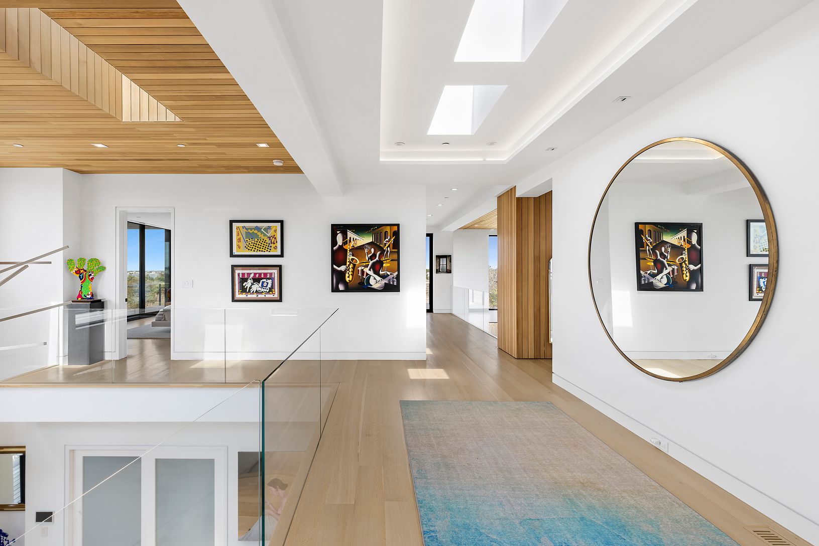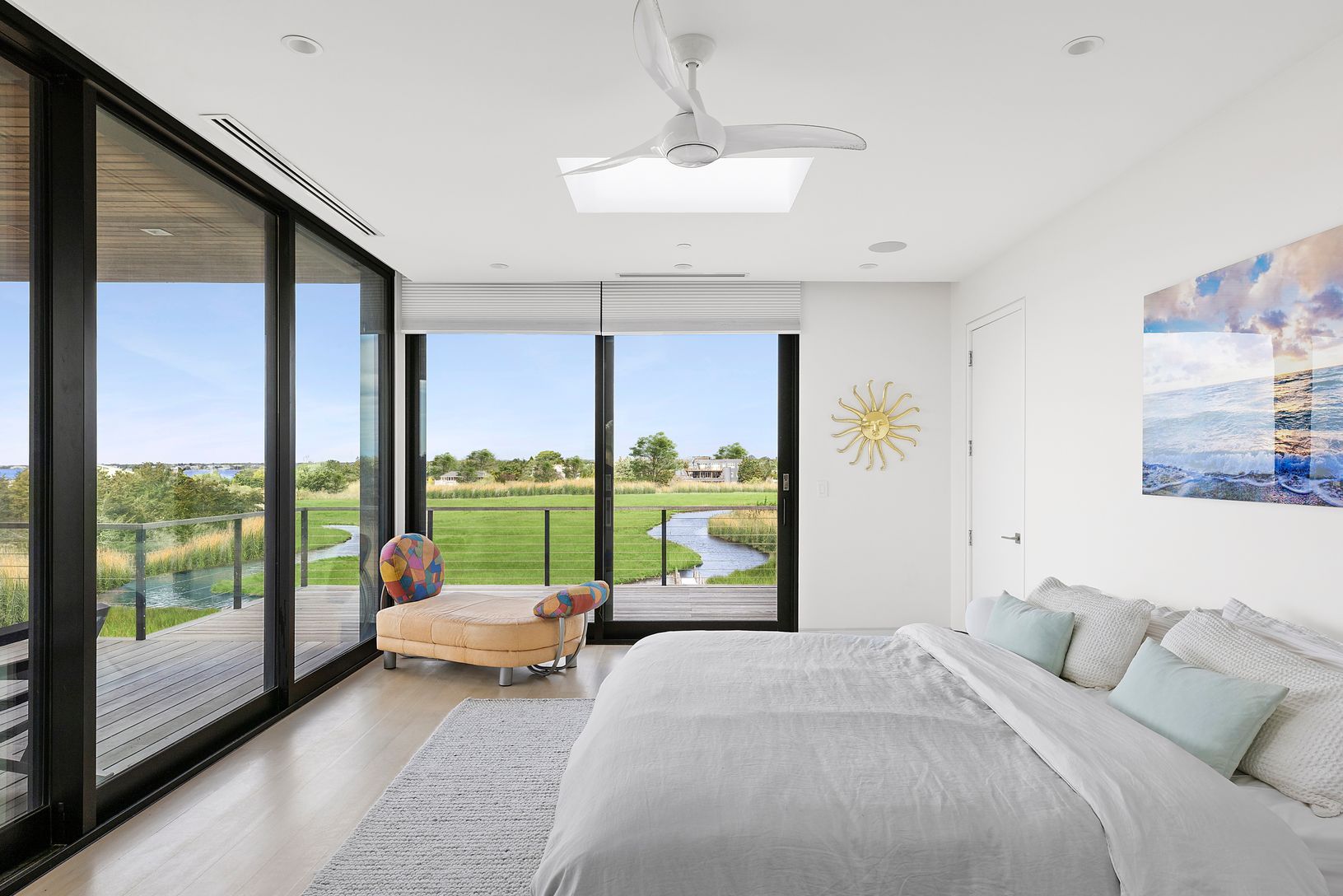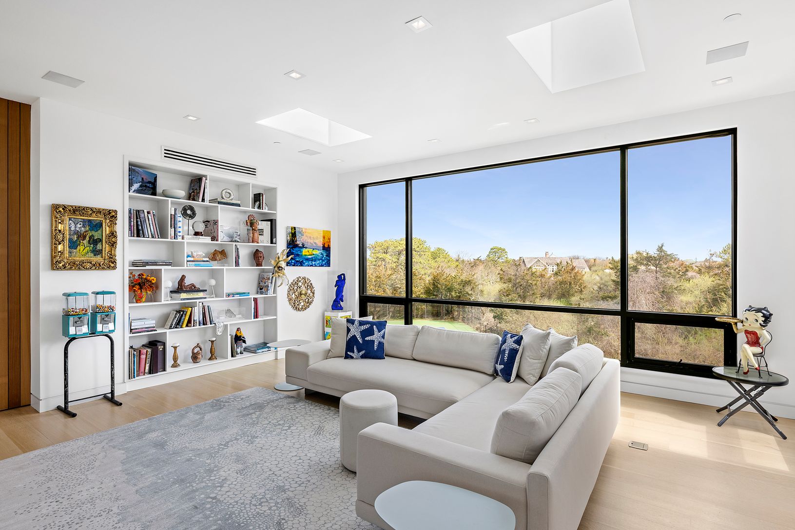 This recently-built house in Westhampton Beach boasts 5 bedrooms and 6.5 bathrooms and was designed by Josh Manes Architecture with sustainability at the forefront. Surrounded by preserved wetlands, this home offers stunning sunset views and a serene natural setting. The house features a double-height fireplace clad in cedar and large-format tiles, which creates a dramatic focal point i