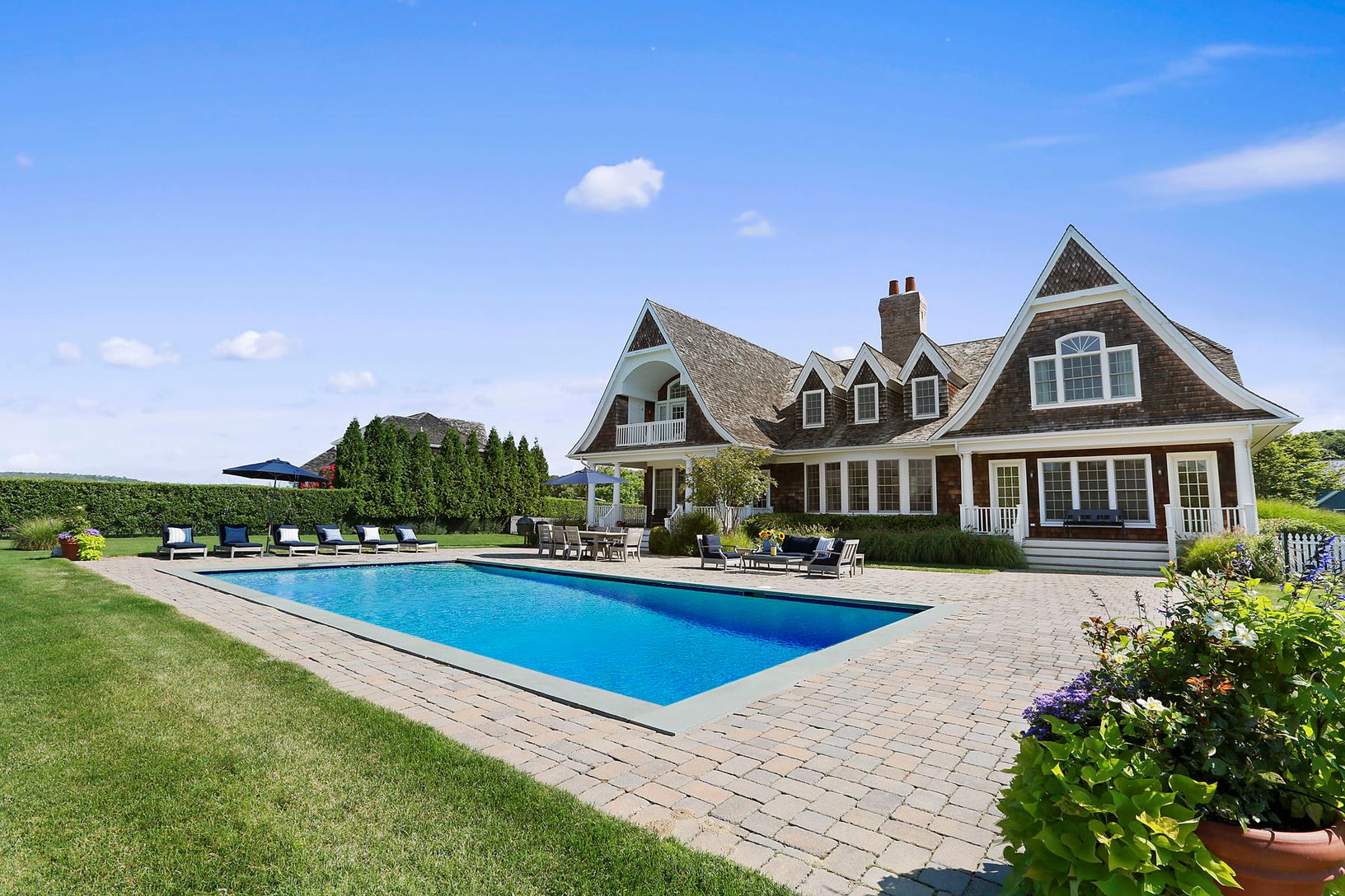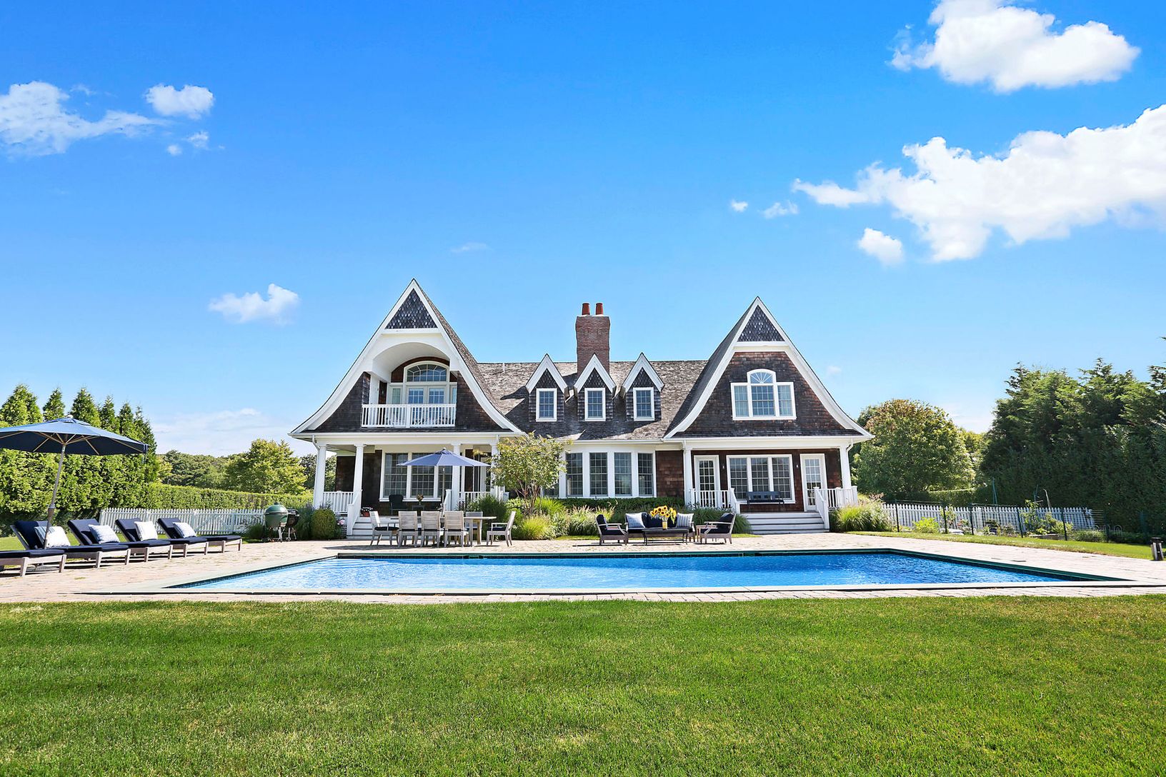 This striking shingled traditional, set upon pristine manicured grounds at a desirable Water Mill address, offers 6 bedrooms and 6.5 baths, including master bedroom suites on the first and second floors. Professional chef's kitchen, open formal dining room, butler's pantry, and family room create the perfect space to entertain. A double height living room with floor to ceiling windows overlooks a gracious pool area and a 12+/- acre agricultura