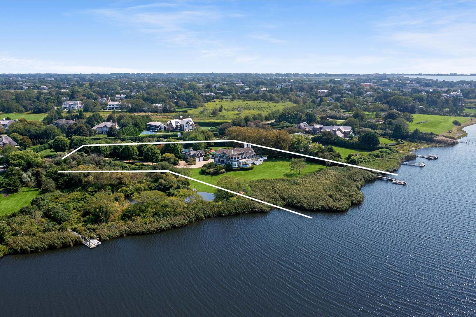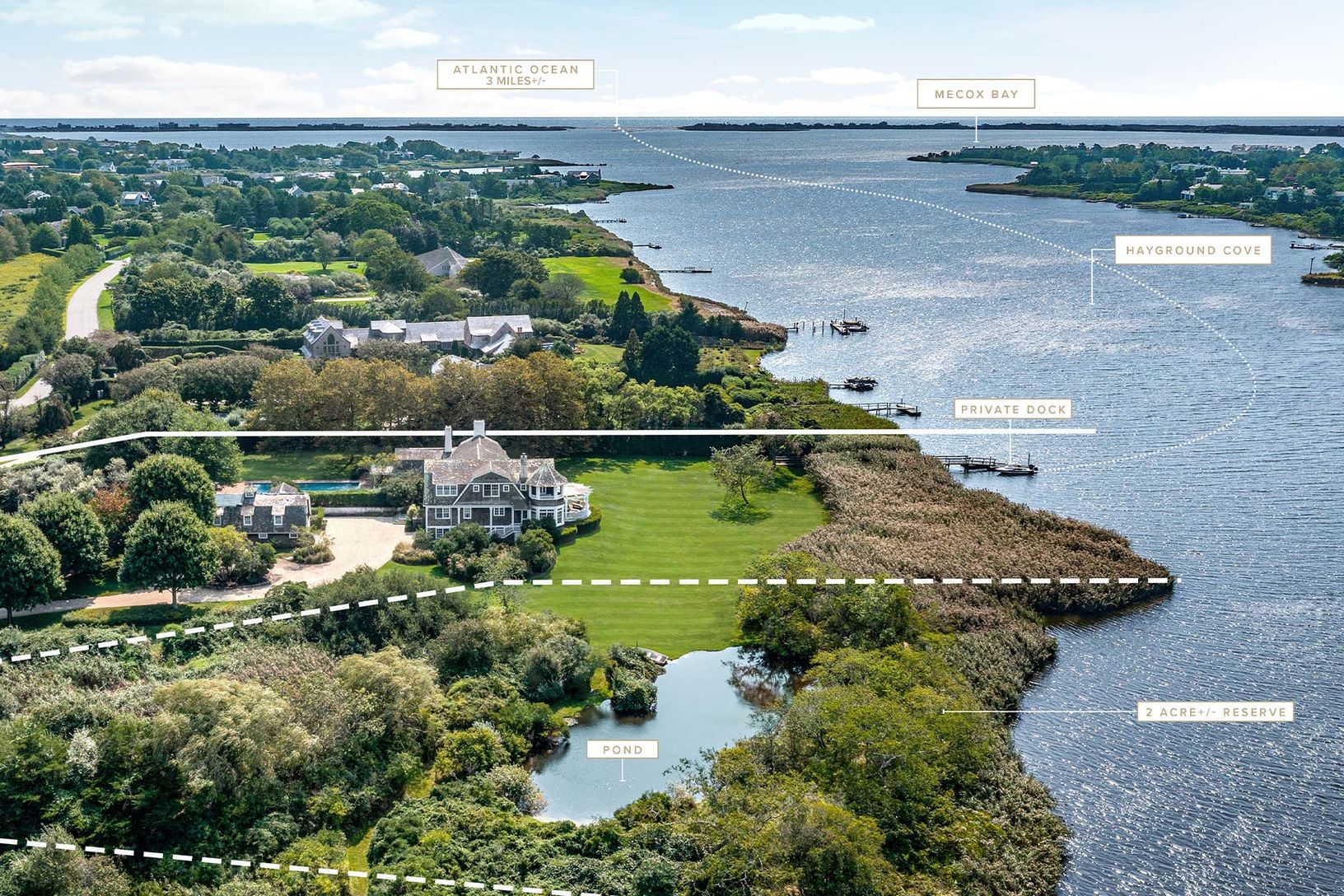This distinguished waterfront retreat presides over 2.8 acres+/- of bayfront property abutting reserve to the north, with impressive water frontage and sweeping views of Hayground Cove and Mecox Bay. The generous 6,000 SF+/- main residence comprises 5 bedrooms, 6 full and 2 half bathrooms, a private dock, heated gunite pool, tennis court, and carriage house. Meticulous landscaping, ample lawn space, and captivating southwesterly sunset views o