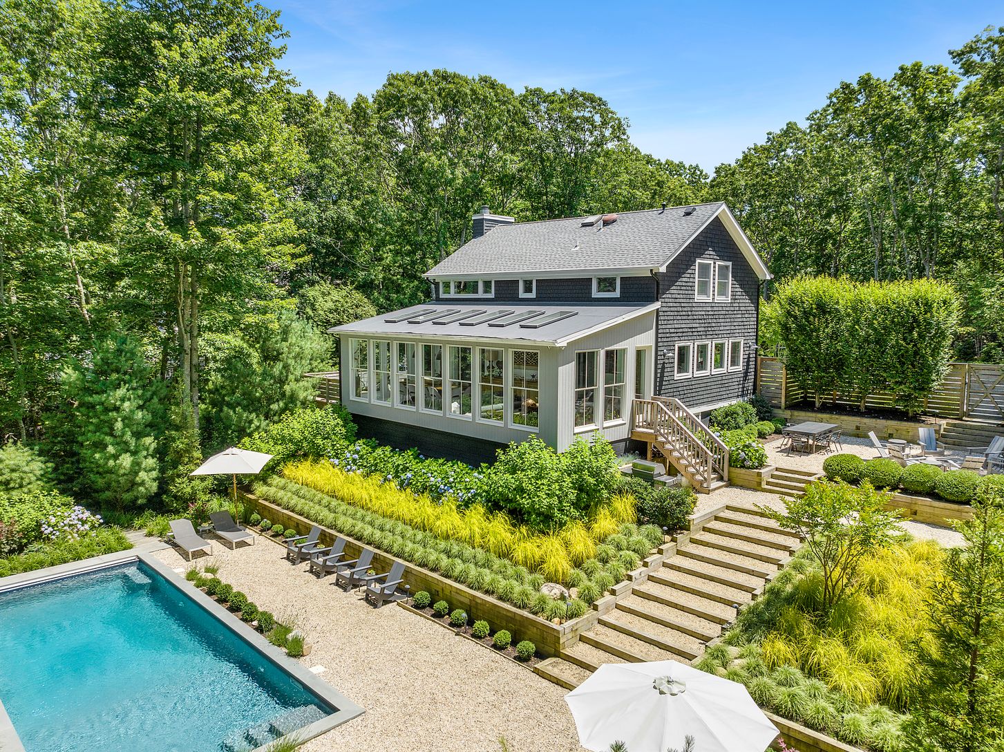 Make summer memories in this idyllic modern home in Sag Harbor, completely renovated with sophisticated, understated furnishings and a heated saltwater pool. Set amid lush landscaping on a full acre down a long, private drive, the property exudes an air of creativity and tranquility that perfectly captures the essence of Hamptons living. Impeccably finished with beautiful décor and art throughout, this home lends itself to festive group gather