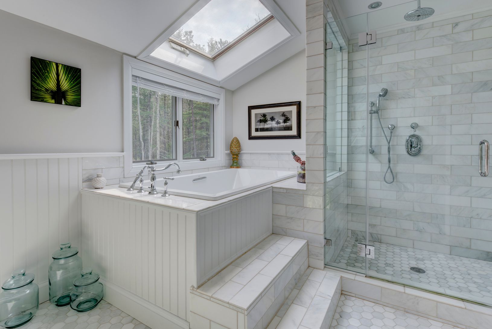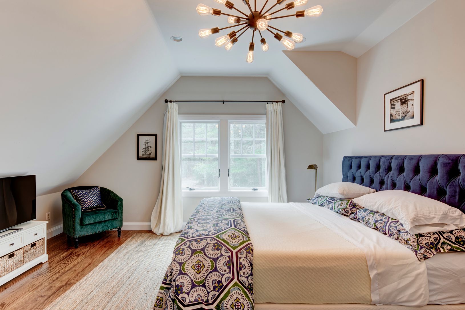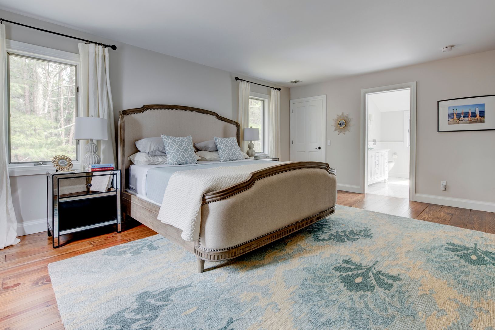 Travel down a long drive through majestic white pines to arrive at this impressive 4000 sf shingled traditional on 2.2 acres of privacy. Walk through a welcoming covered porch to enter a spacious foyer that leads to an open chef's kitchen with Sub-Zero and Wolf appliances, dining area and great room with cathedral beamed ceiling and gas fireplace. The open den/family room with bay window can be made private using a custom designed sliding barn