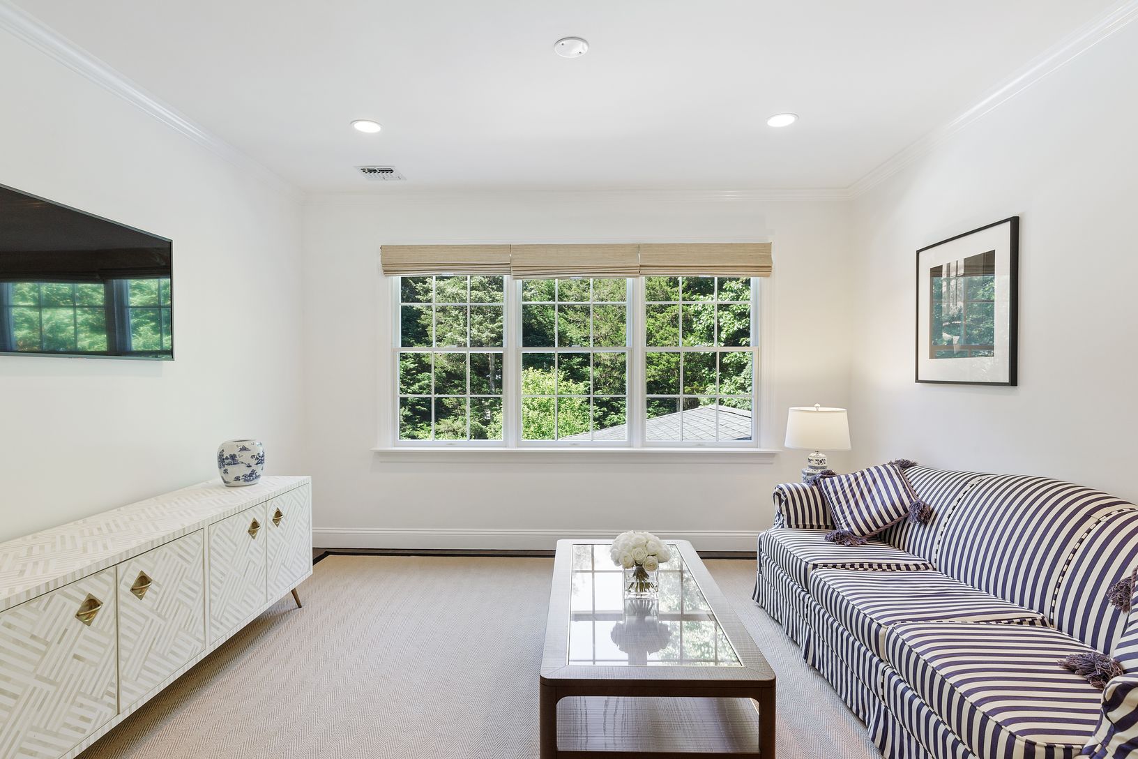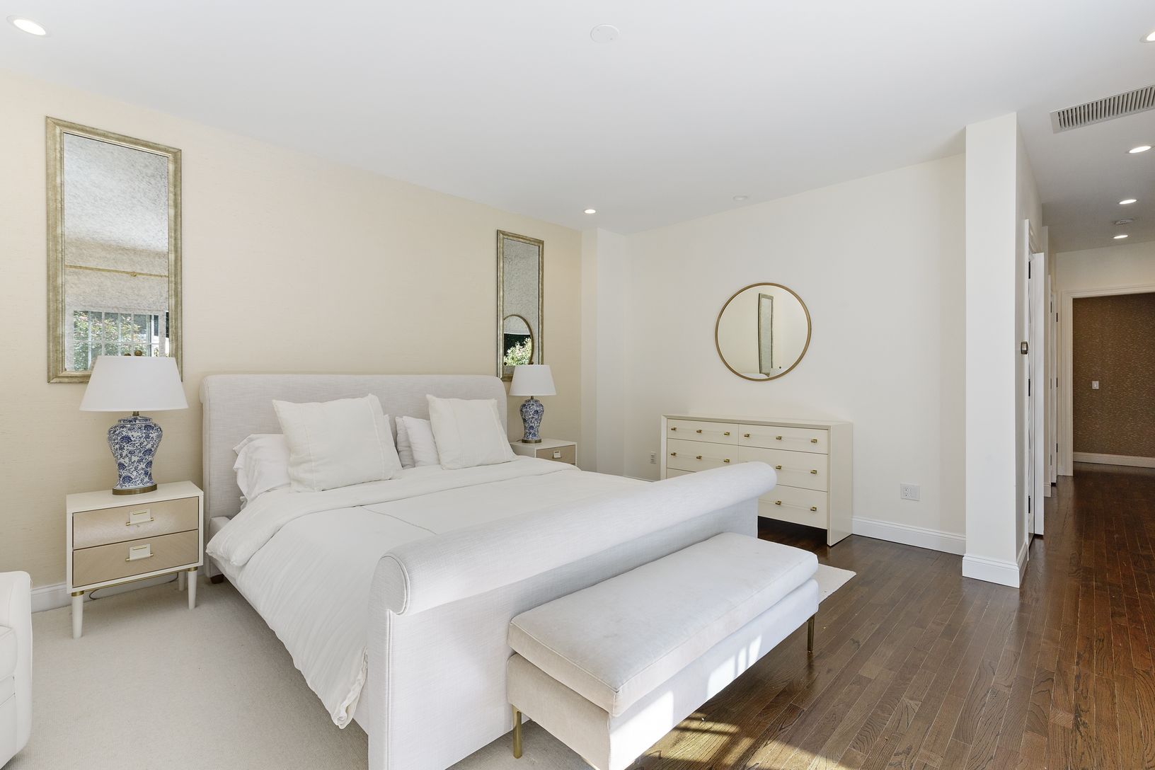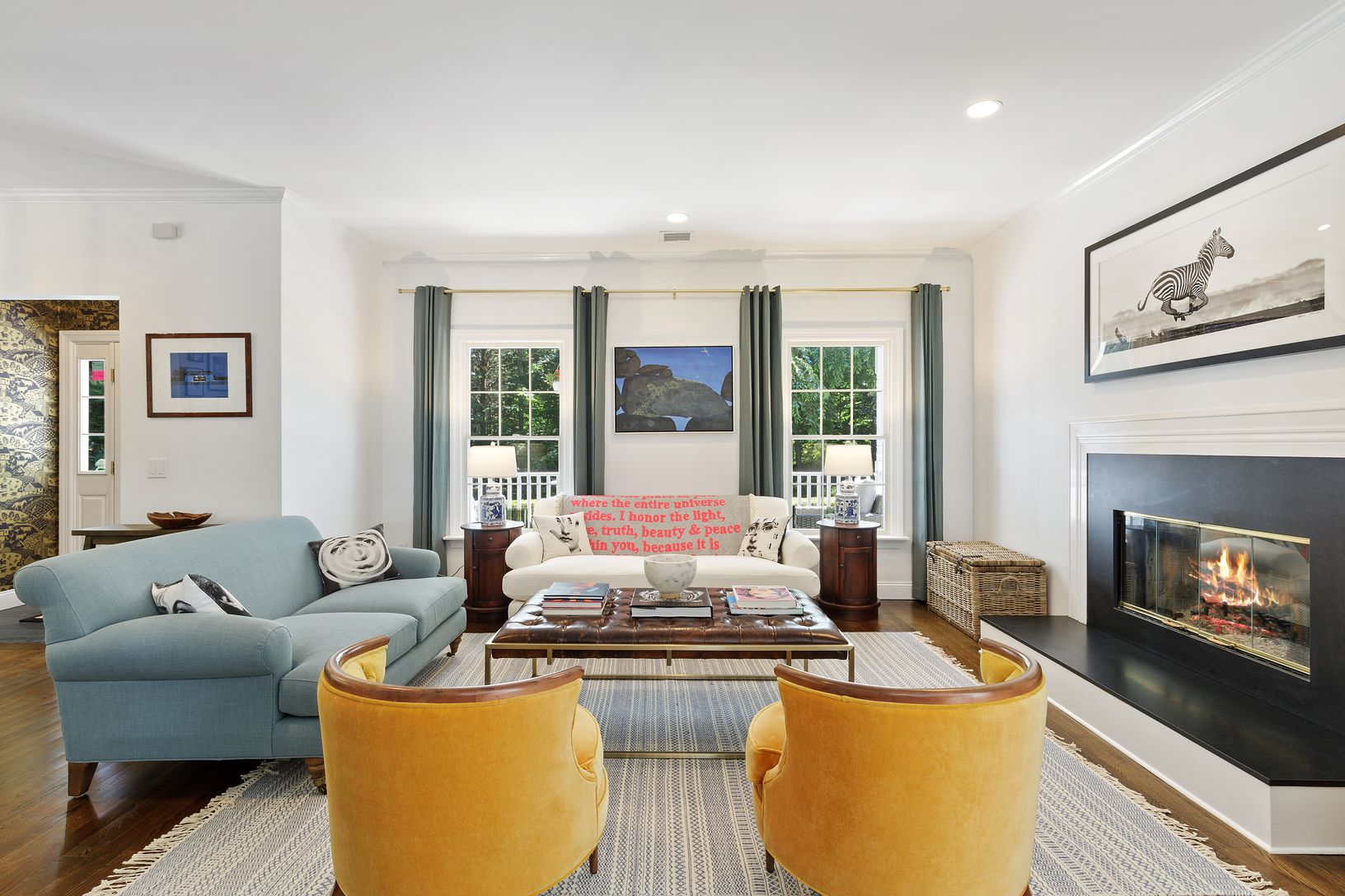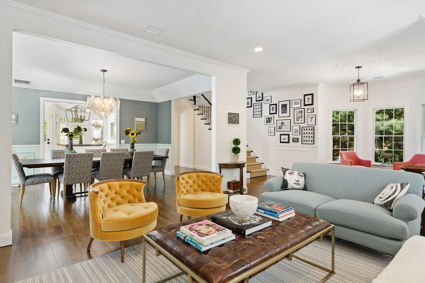 Living room with fireplace opening to formal dining room which leads to a large state of the art kitchen with breakfast nook and large island and on to a patio. The master suite is on the main floor with French doors into the garden.