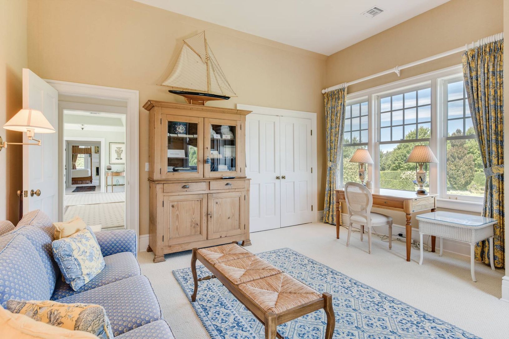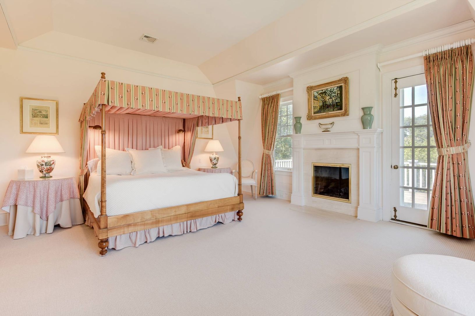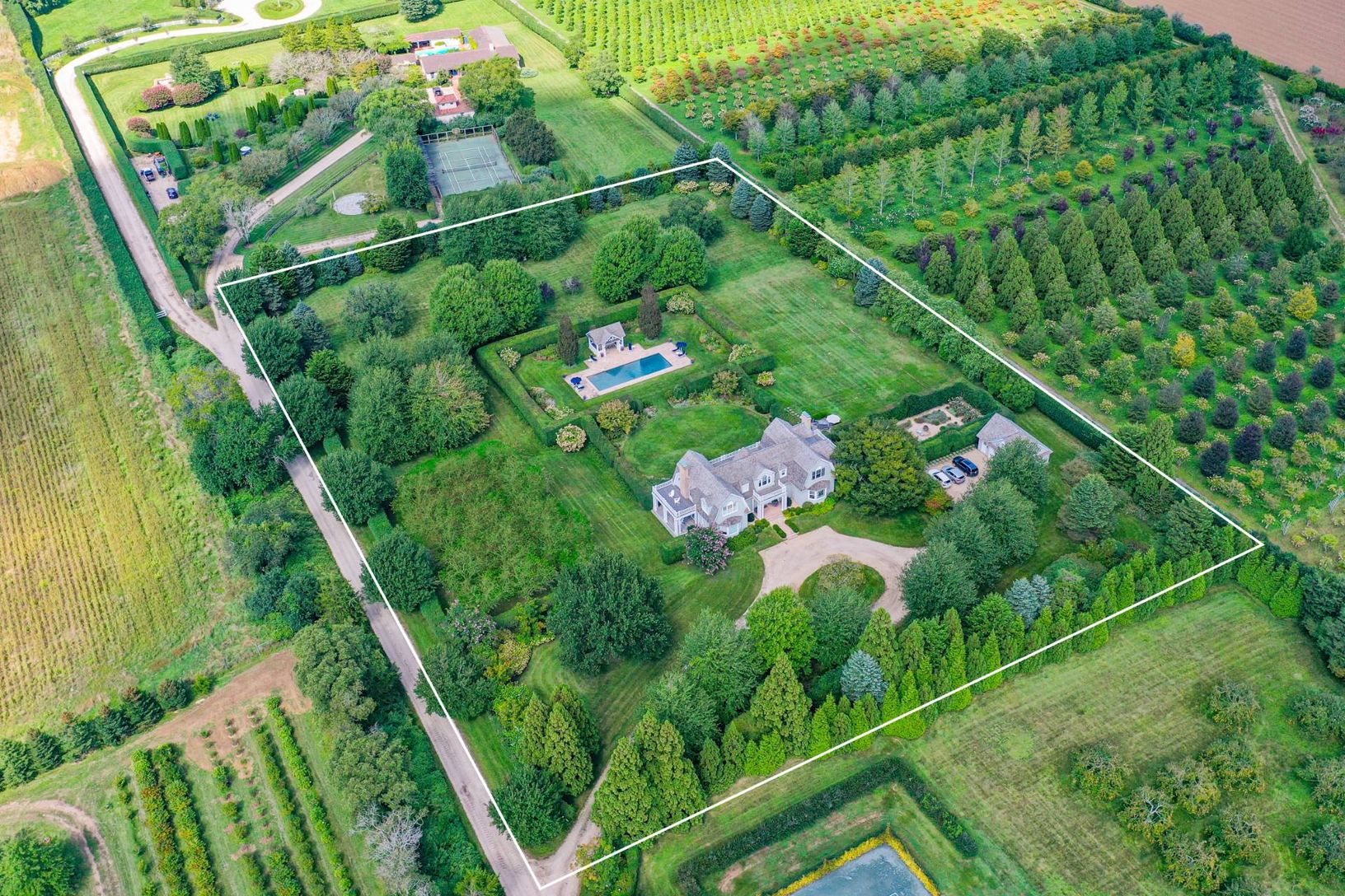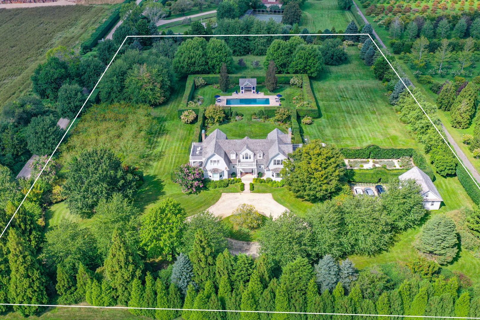 Sun-filled four bedroom home on five glorious acres available for two or three-week rentals this summer. Totally private property has manicured English Herb Garden, perennial flower beds, sweeping lawns, and an orchard. There is an oversized 50' heated gunite pool and pool pavilion. The house has a huge back porch, covered side porches and balconies off every room. The living room has French doors on two sides and a fireplace. There is formal