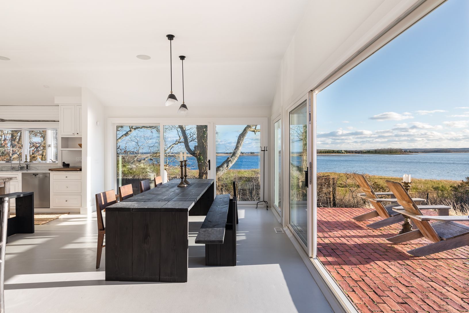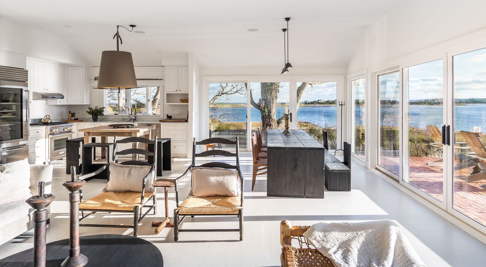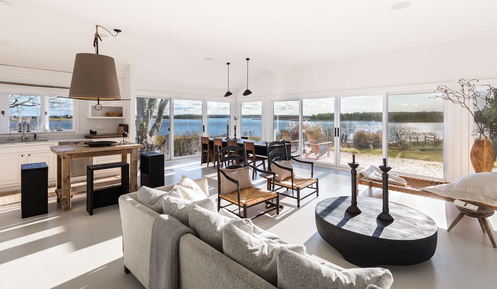 Panoramic views from both sides of the house in this beautifully renovated and stylish cottage. One side of the house has water views of Accabonac Harbor, the other side of the house has views of Gardiners Bay. Breathtaking sunsets are seen from living room, dining room ,kitchen and deck. This chic 3 bedroom 3 bath cottage has an open floor plan that leads out to a spacious patio for entertaining. There is a sandy beach in the back yard and de