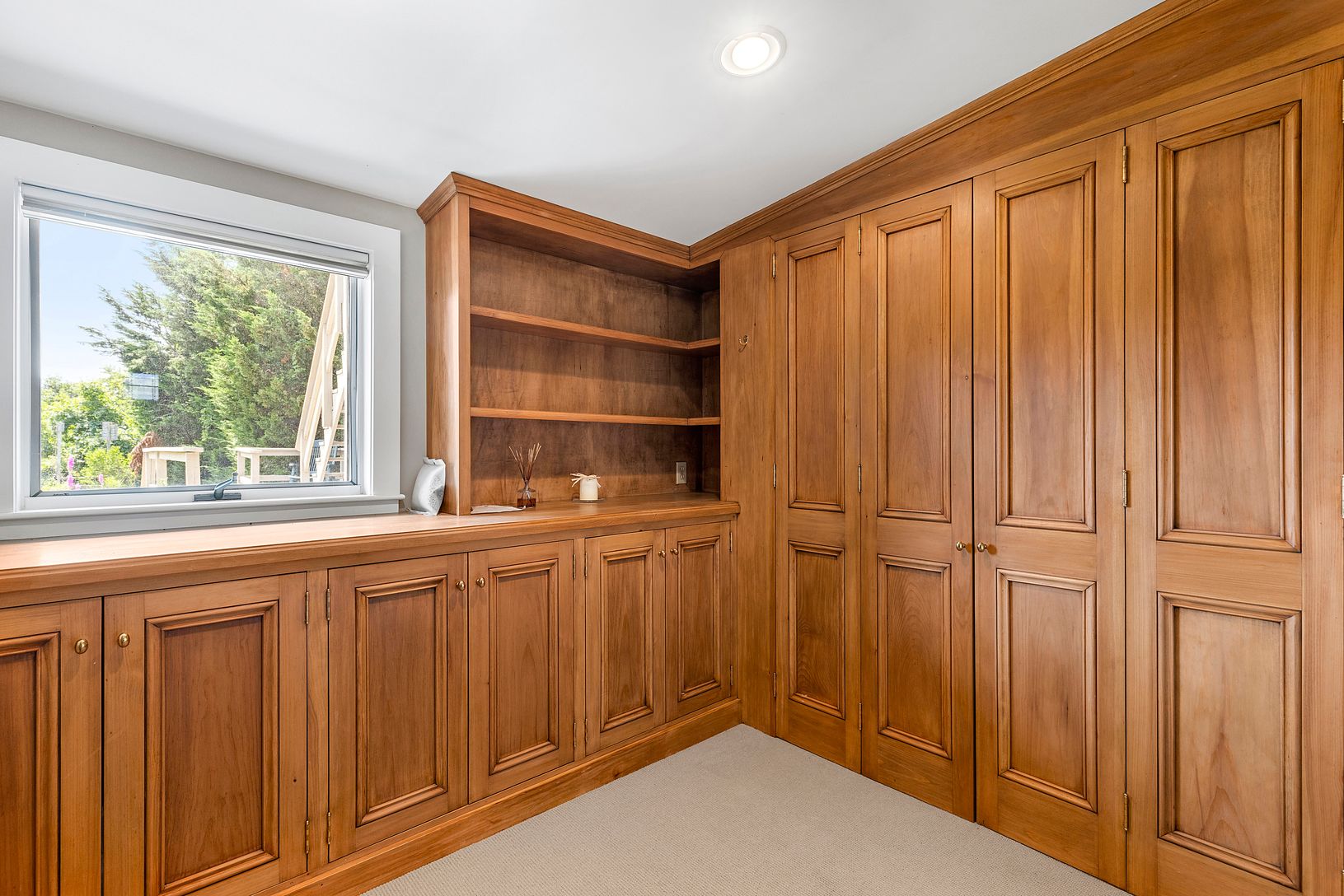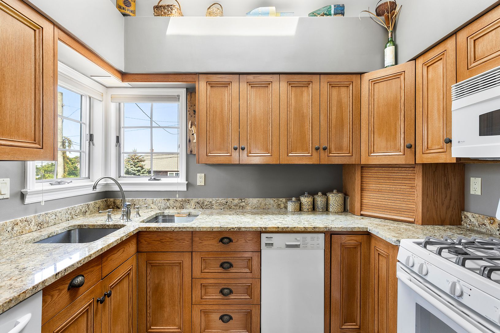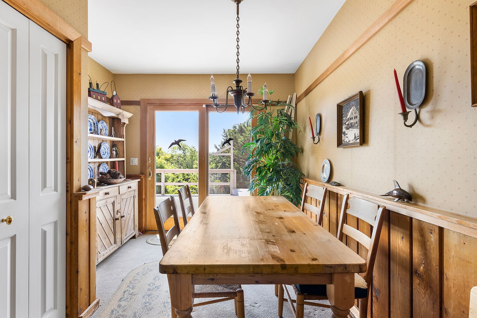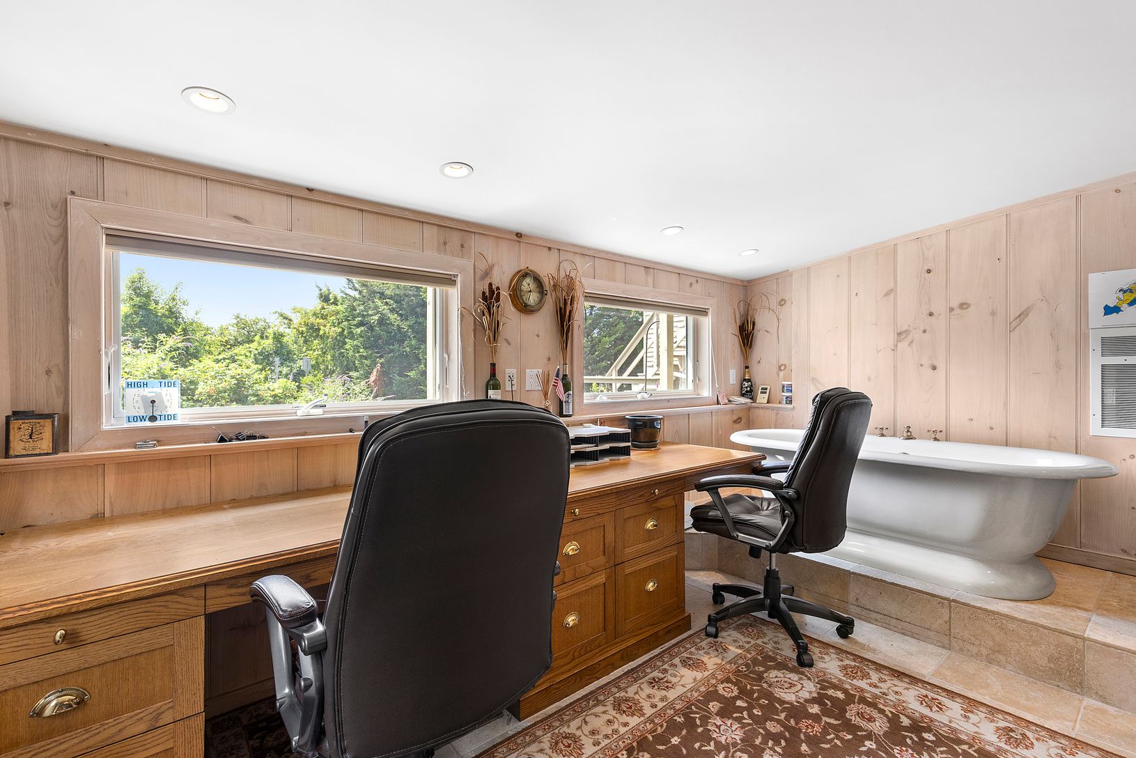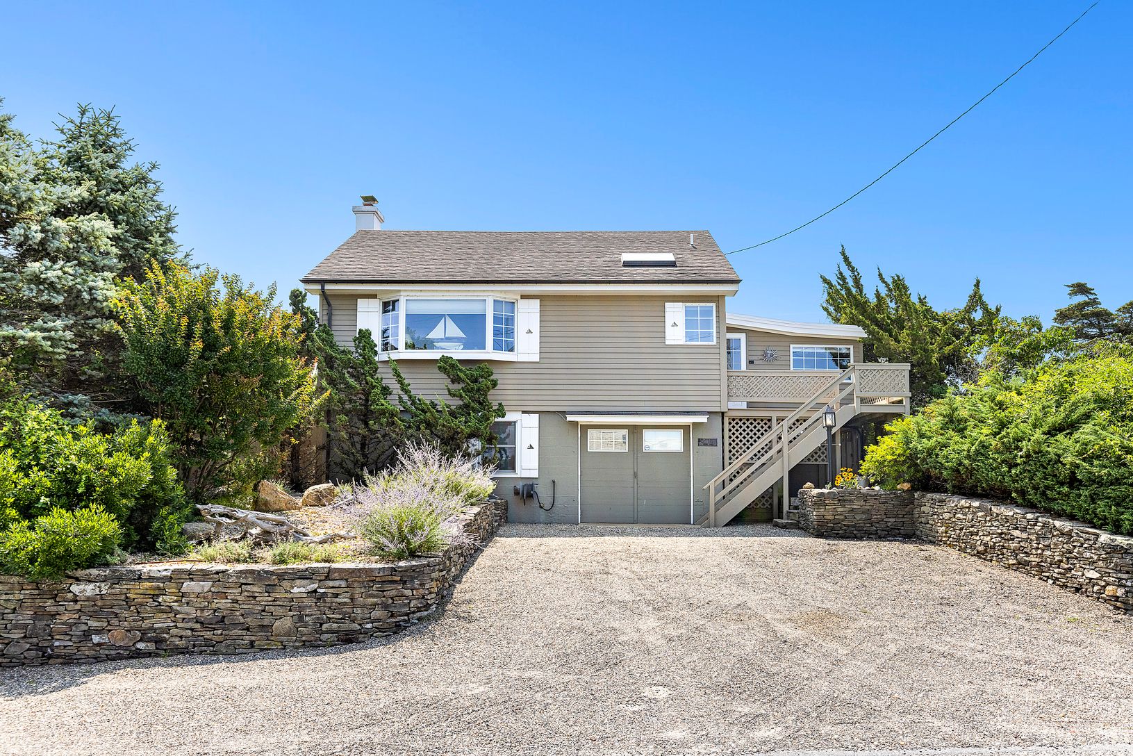This two-story upside-down style home sits across the street from Gardiner's Bay. Boasting bay views from the kitchen, living room and deck; all while being only a few steps from the water. The bottom floor consists of the primary bedroom which is en-suite and has a walk-in closet. Along with a second bedroom, office, sauna, laundry room and exercise room. Upstairs you have a full bathroom, kitchen, living room, breakfast nook and dining room.
