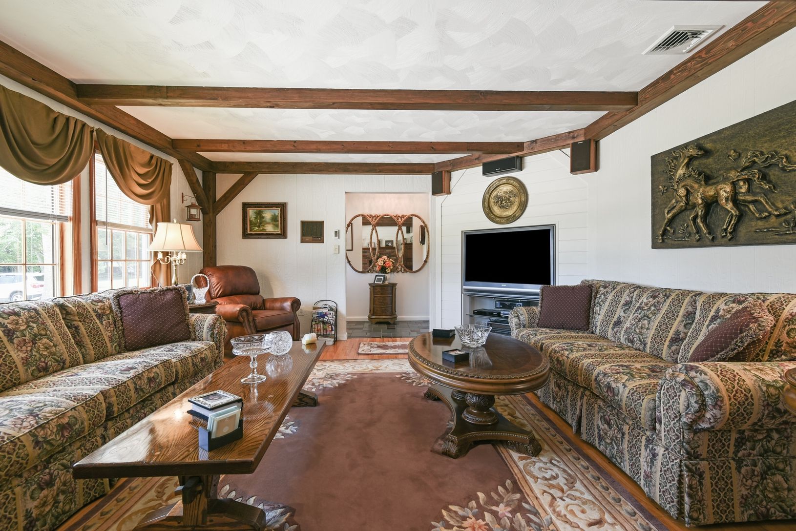 Located in the bucolic Remsenburg - Speonk area, this immaculate home has been meticulously maintained over the years. Light-filled living room with fireplace and beamed ceiling, formal dining room, large eat-in-kitchen, laundry room, Master Suite with walk-in closet and spa bath, plus two guest bedrooms and a guest bath. Large deck for entertaining, two car garage with attic, and an additional accessory structure for storage or extra garage