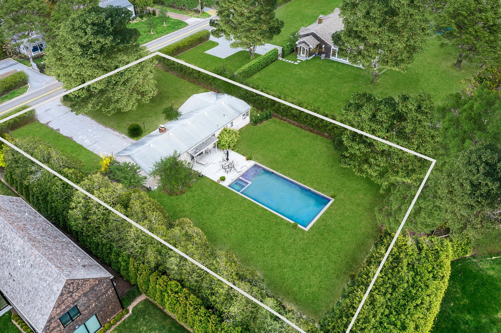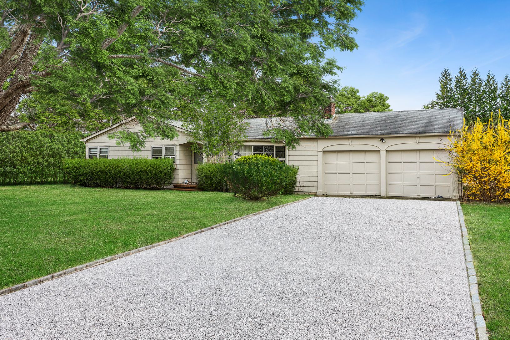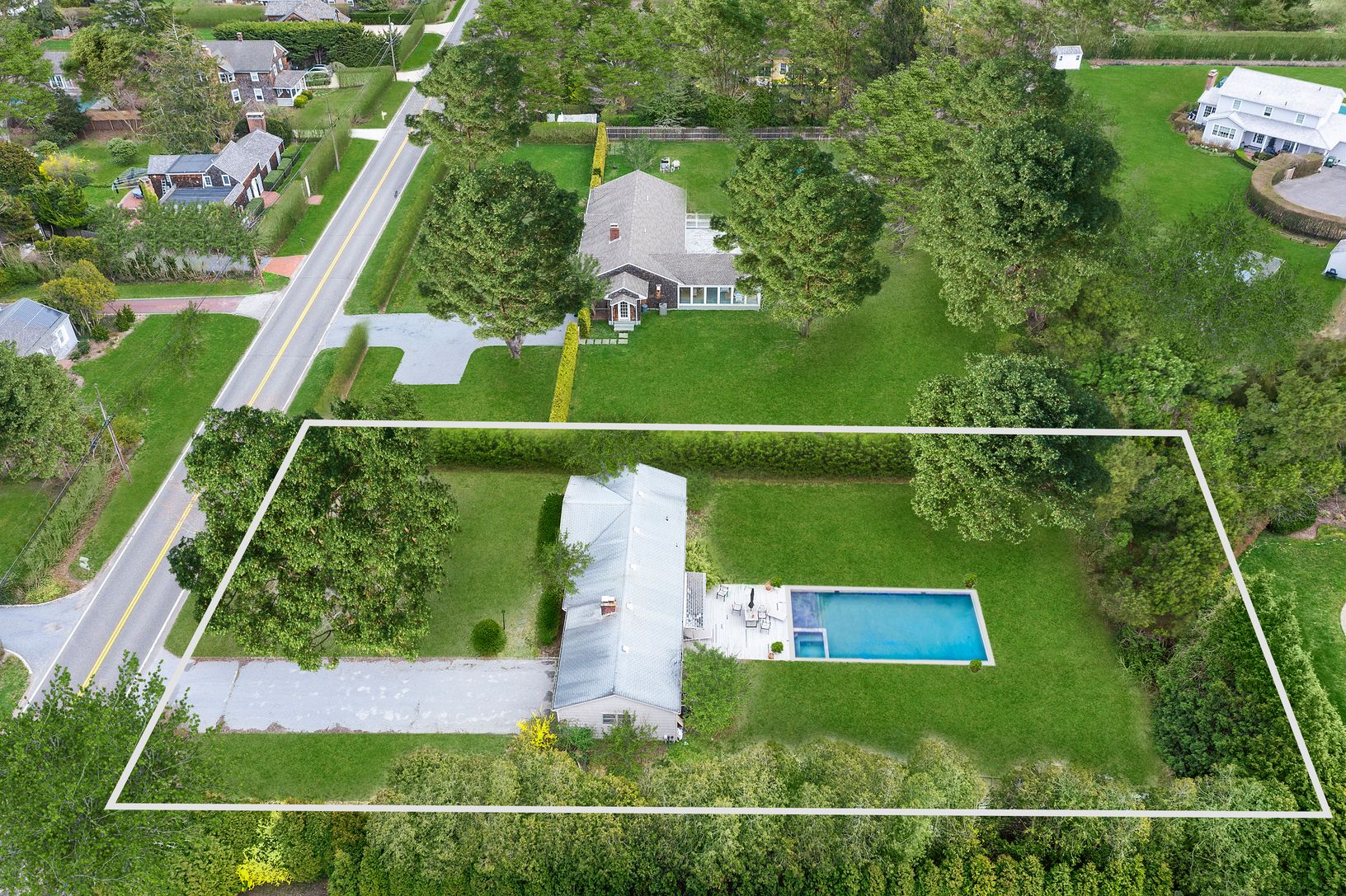 Nestled in the heart of Water Mill, this one-story home offers three bedrooms, one full and one half bath, set on a picturesque 0.51+/- acre lot with a heated gunite pool. The sunlit living room features a charming masonry fireplace and opens onto a spacious deck, ideal for outdoor entertaining overlooking the inviting pool area, all enveloped by a mature privet hedge for ultimate privacy.