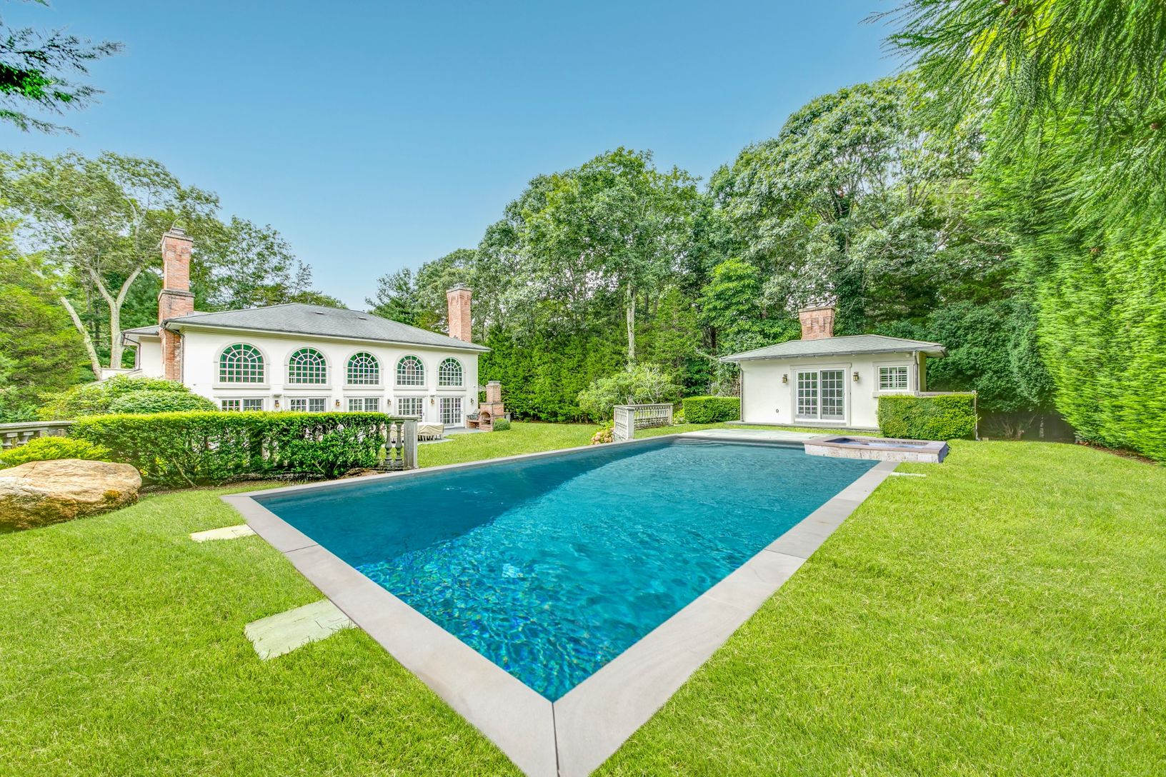 Elegant East Hampton living awaits in the private Clearwater Beach Community, moments from the bay and ready to deliver a sophisticated Hamptons lifestyle. Sited on over half an acre and renovated in 2017, this turnkey treasure has 3,110 +/- sq. ft. of living space across 2 levels, plus a fully finished walkout lower level for another 1,000 +/- sq. ft., 4 bedrooms, 6 baths, pool, and pool house with full bath and fireplace. The interiors are c