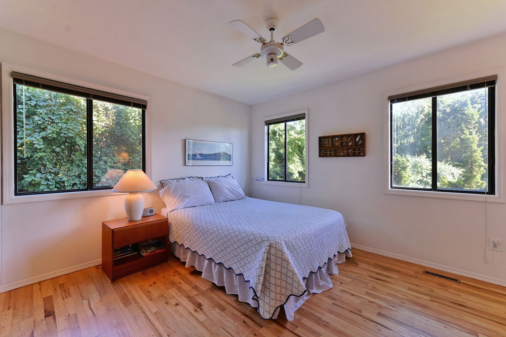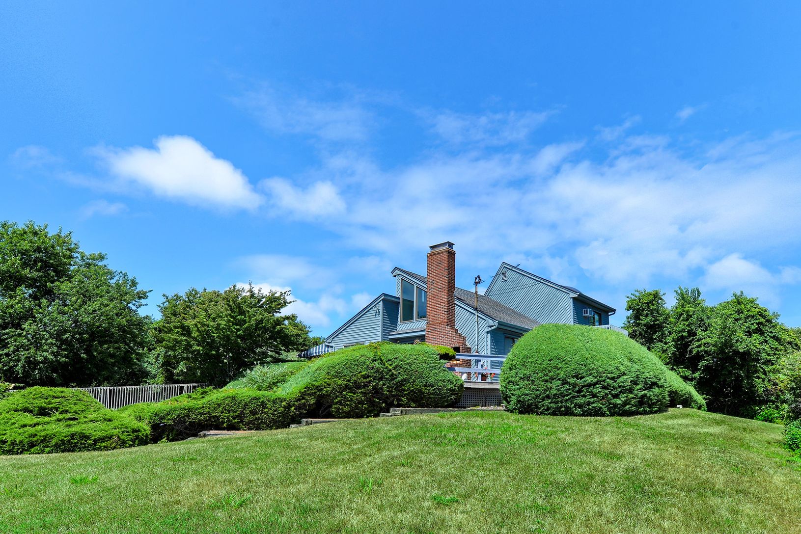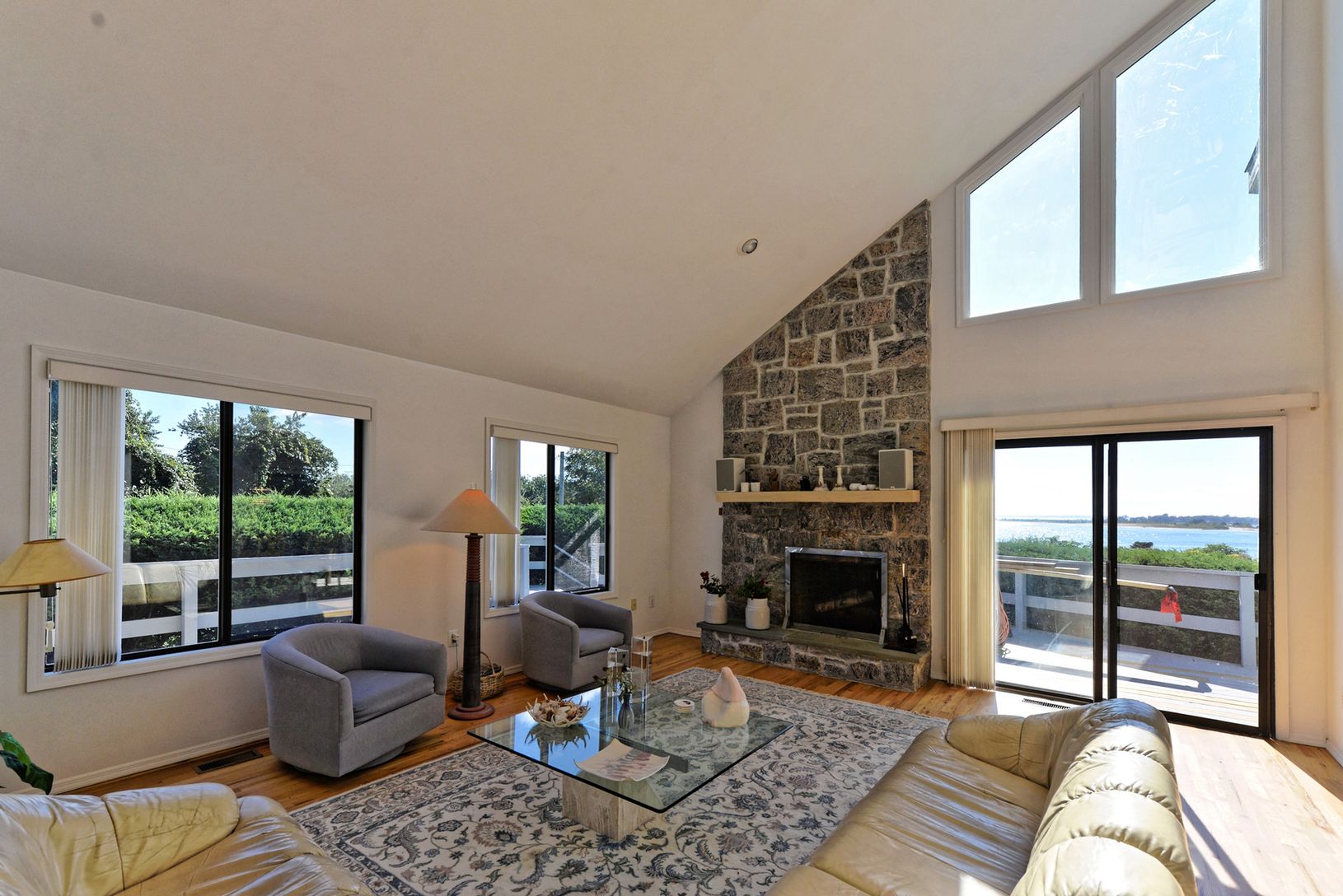 Down a hidden driveway overlooking Wades Beach, this contemporary sited on 1.2+/- acres with slight elevations looks onto inspiring saltwater, with views to Shell Beach. Double height ceilings in the living room give an immediate feeling of light and space, enjoyable during summer months with sliding doors and windows open and during the off season sitting by the fireplace. A dining area is adjacent to the kitchen which has a breakfast bar. Do