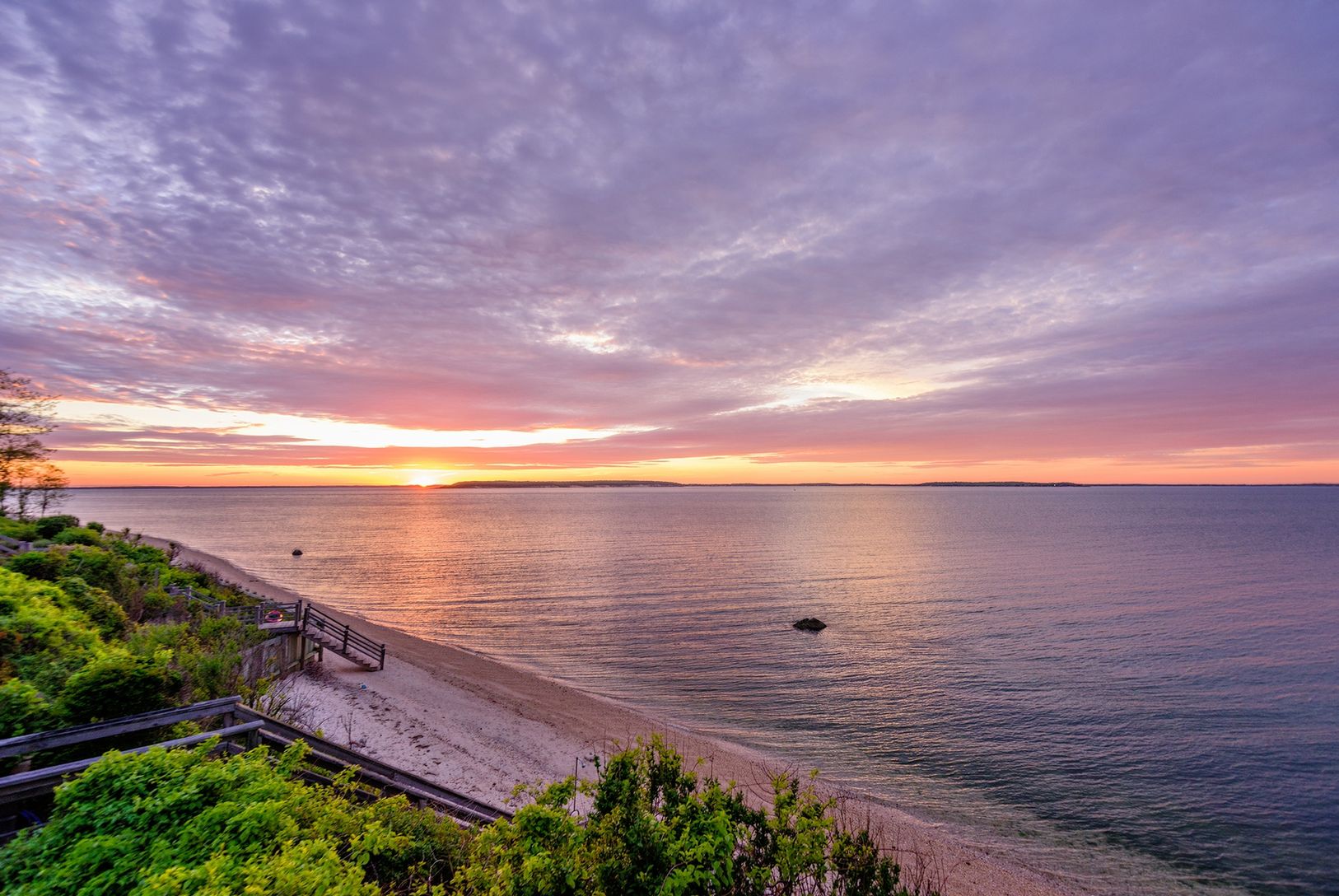 North Sea Beach Colony compound, Southampton waterfront, spectacular Western sunsets from high on a bluff. Four bedroom main house, offers private beach access, staircase down to a sandy beach and 2 bedroom guest cottage on .46 +/- acres. Panoramic Little Peconic Bay views from this sought- after enclave, bordering a nature reserve and minutes to Southampton Village. The property is neatly manicured and features 102 +/- ft of beach frontage on