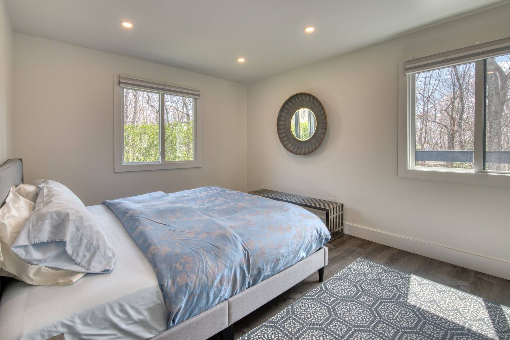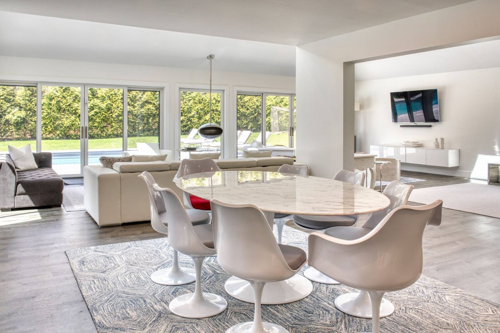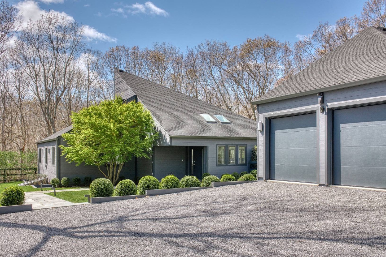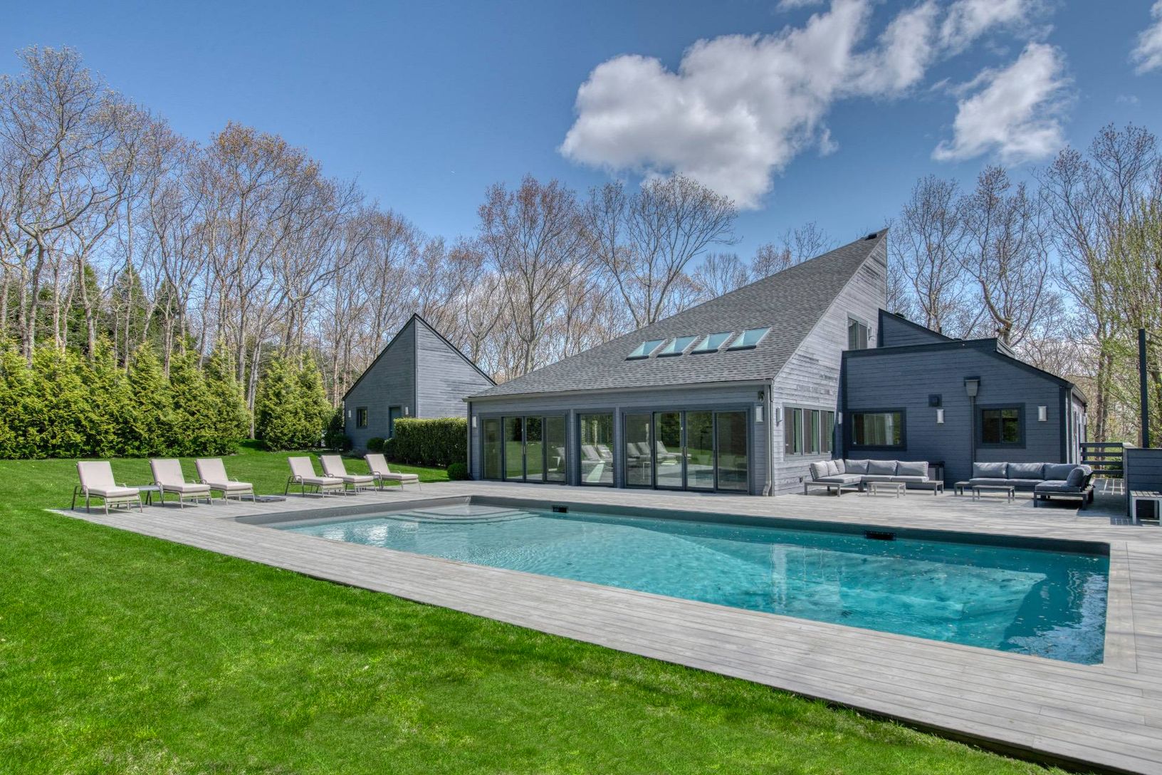 This four-bedroom, four-bath contemporary is set on a private acre in one of Water Mill's most sought-after areas. With clean lines and a flowing open layout, the home is designed for effortless indoor/outdoor living. The streamlined kitchen opens to an alfresco dining area, perfect for relaxed gatherings and summer meals. A double-height living room with French doors connects seamlessly to the pool deck, creating an airy, expansive feel. High