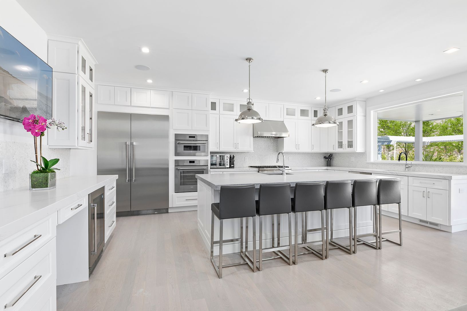 living environment with its oversized windows and the great room's 20' ceilings. High-end finishes adorn the 7-bedroom, 8.5 bath dwelling to create an