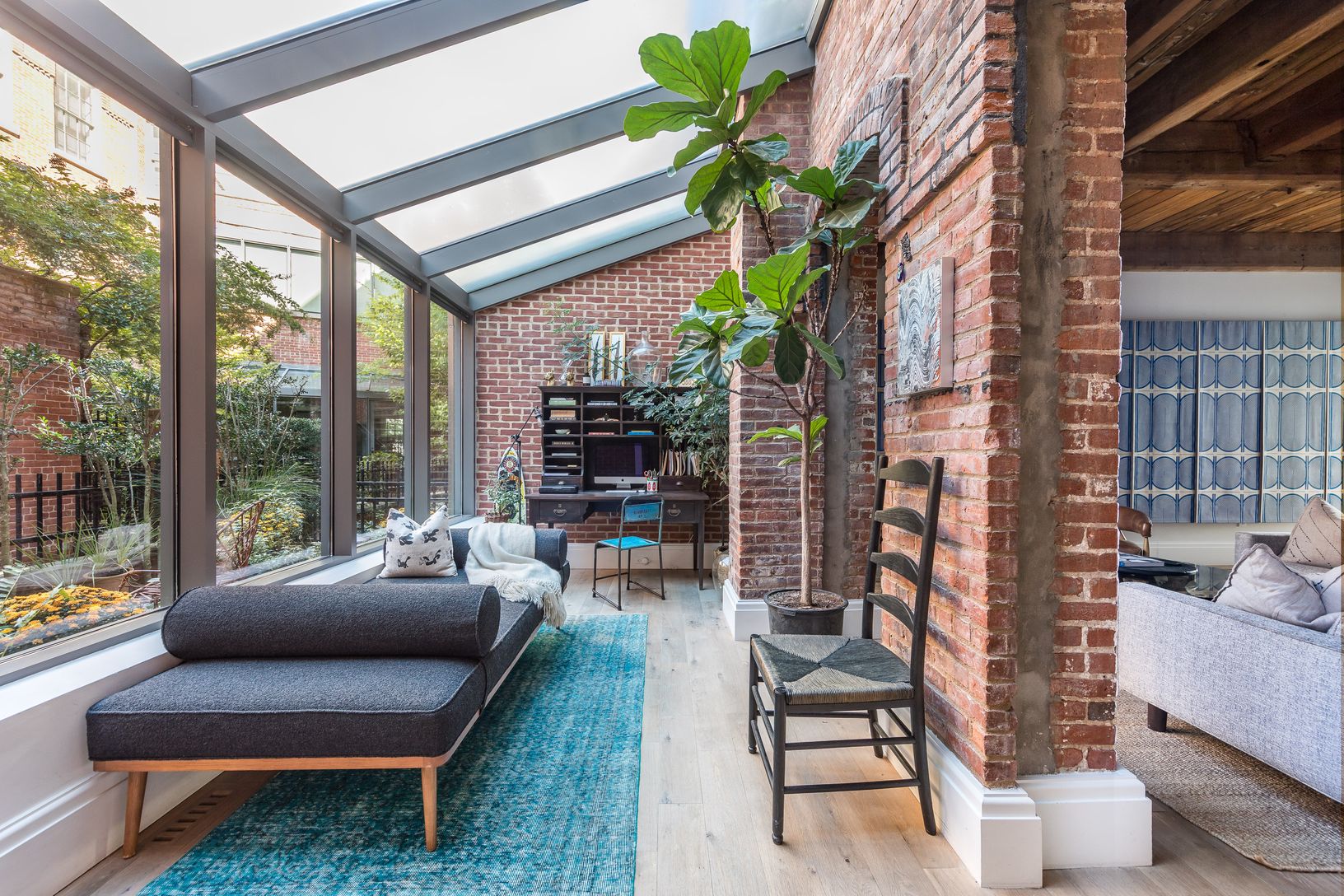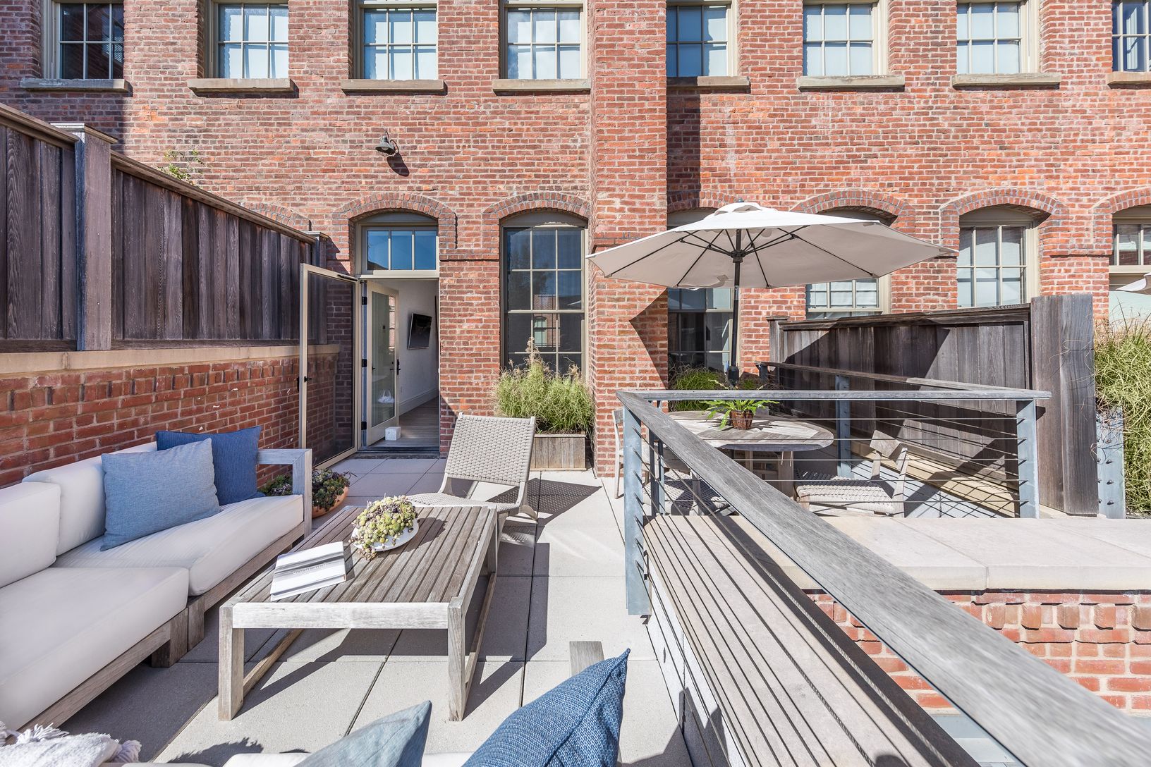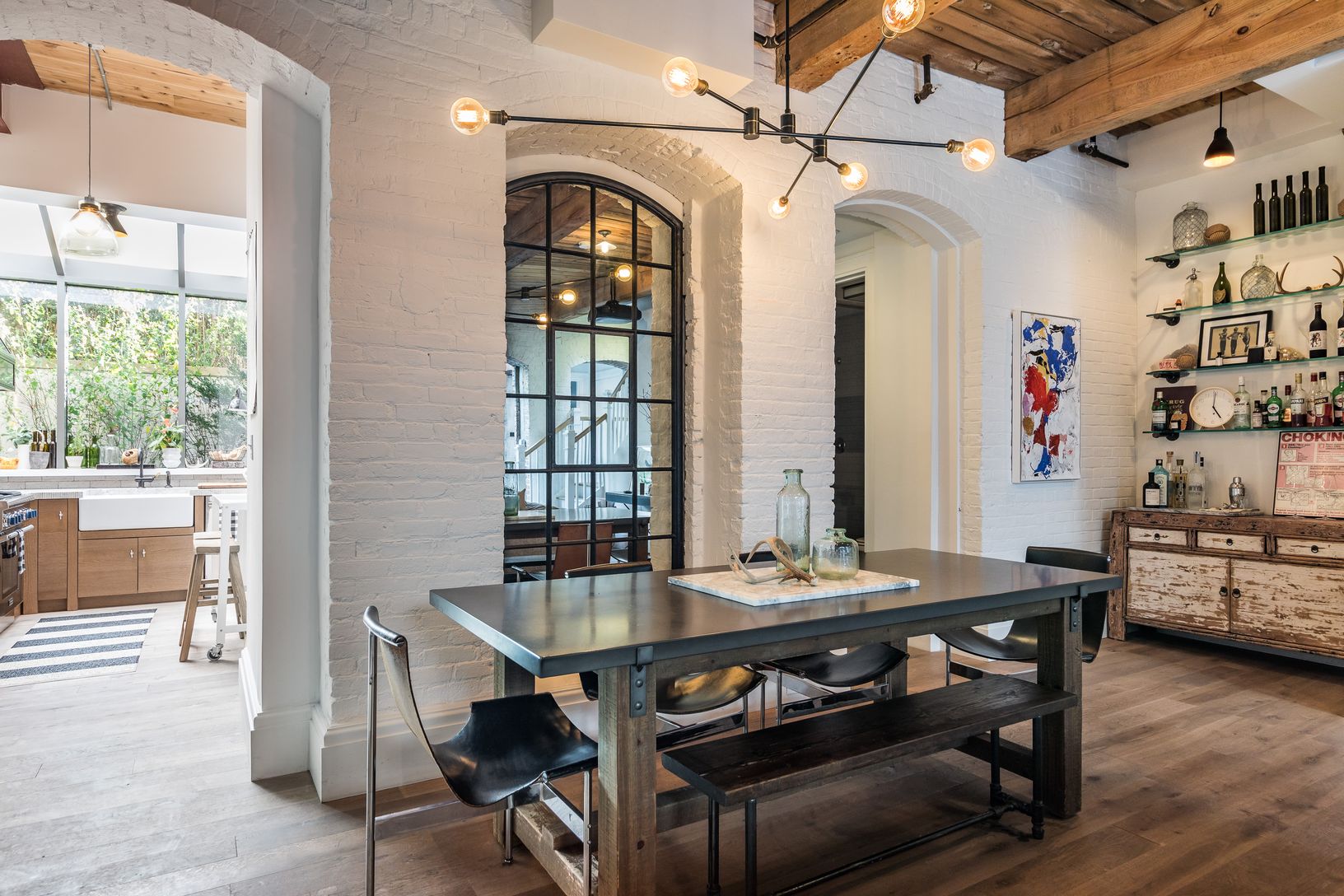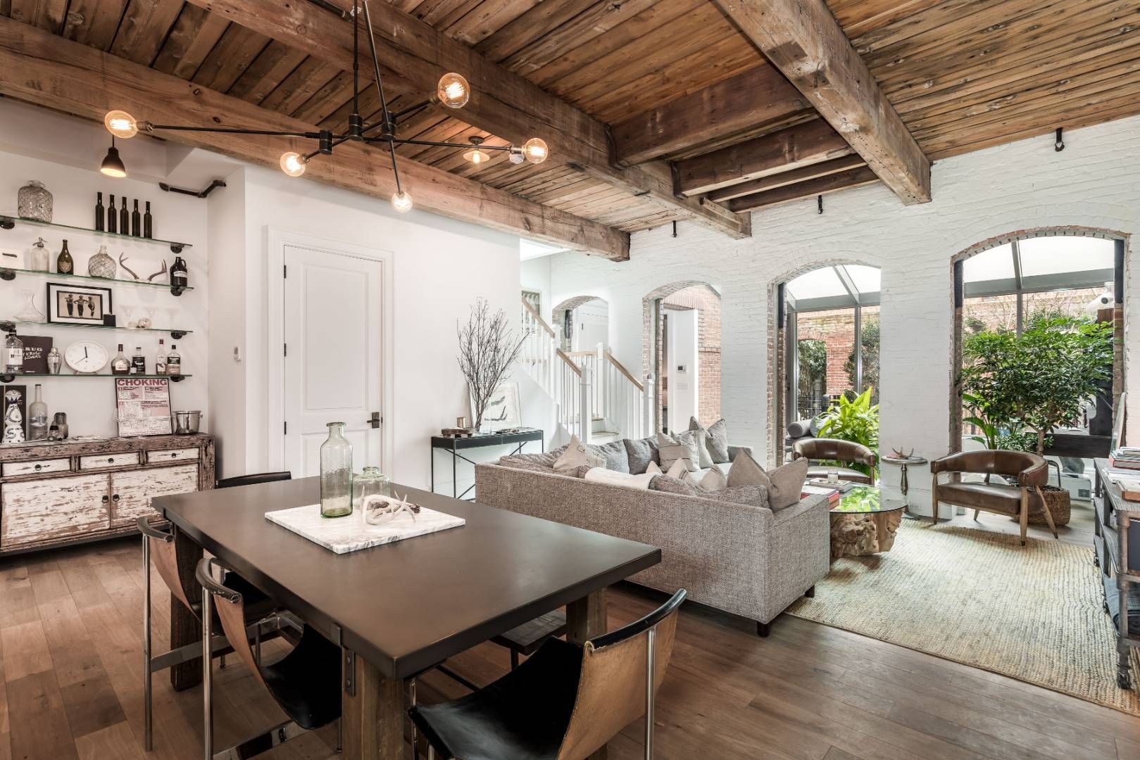 On the garden and second level of Watchcase, this elegant, well-proportioned, north/south-facing 3-bedroom, 3-bath factory apartment offers a charming private garden entry at The Historic Watchcase Factory in Sag Harbor Village. The gracious pine-beamed 11'+ ceilings and exposed brick details complement the large living space with a projection entertainment system along a sophisticated art wall. A separate L-shaped kitchen provides an ideal la
