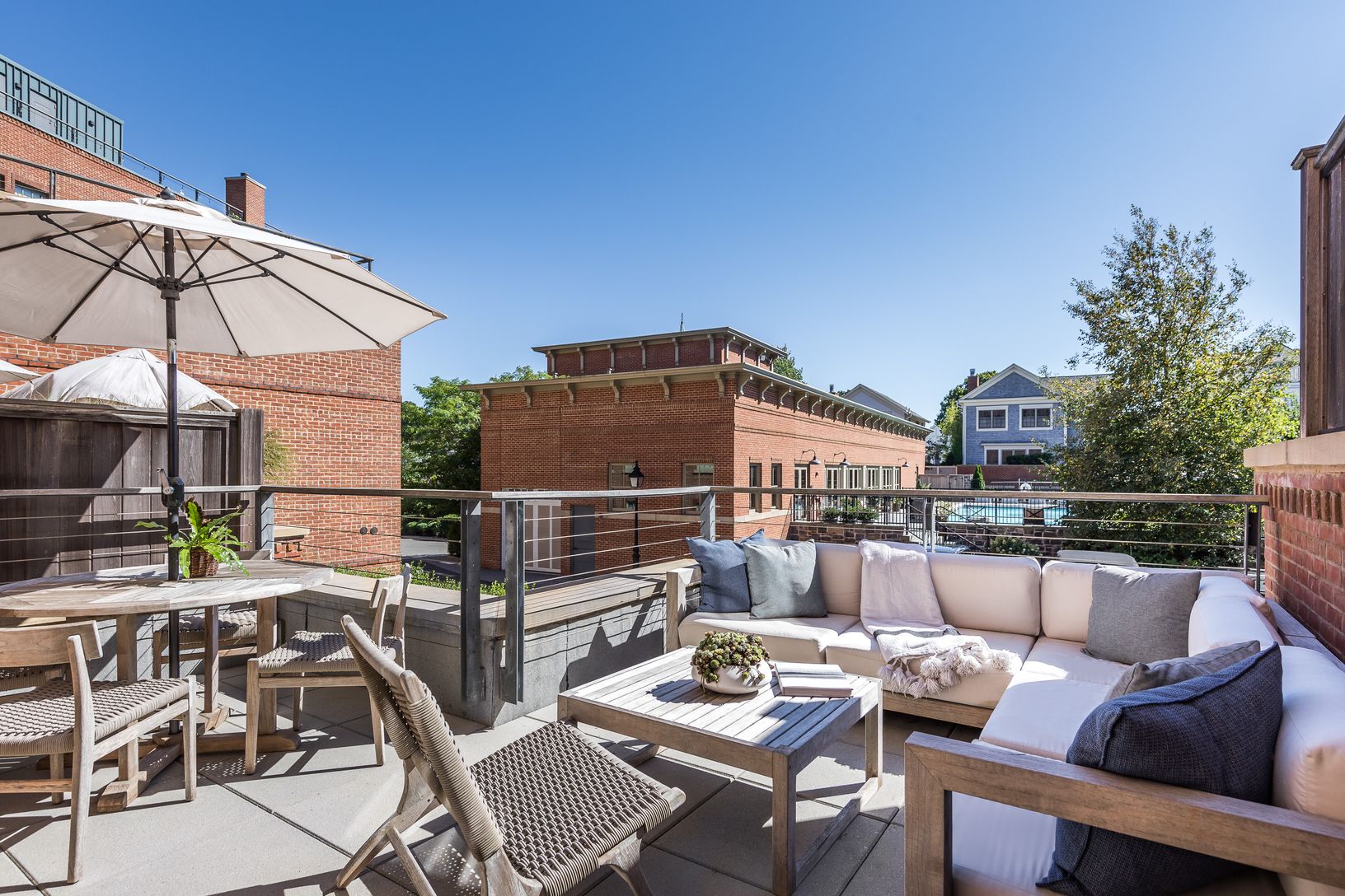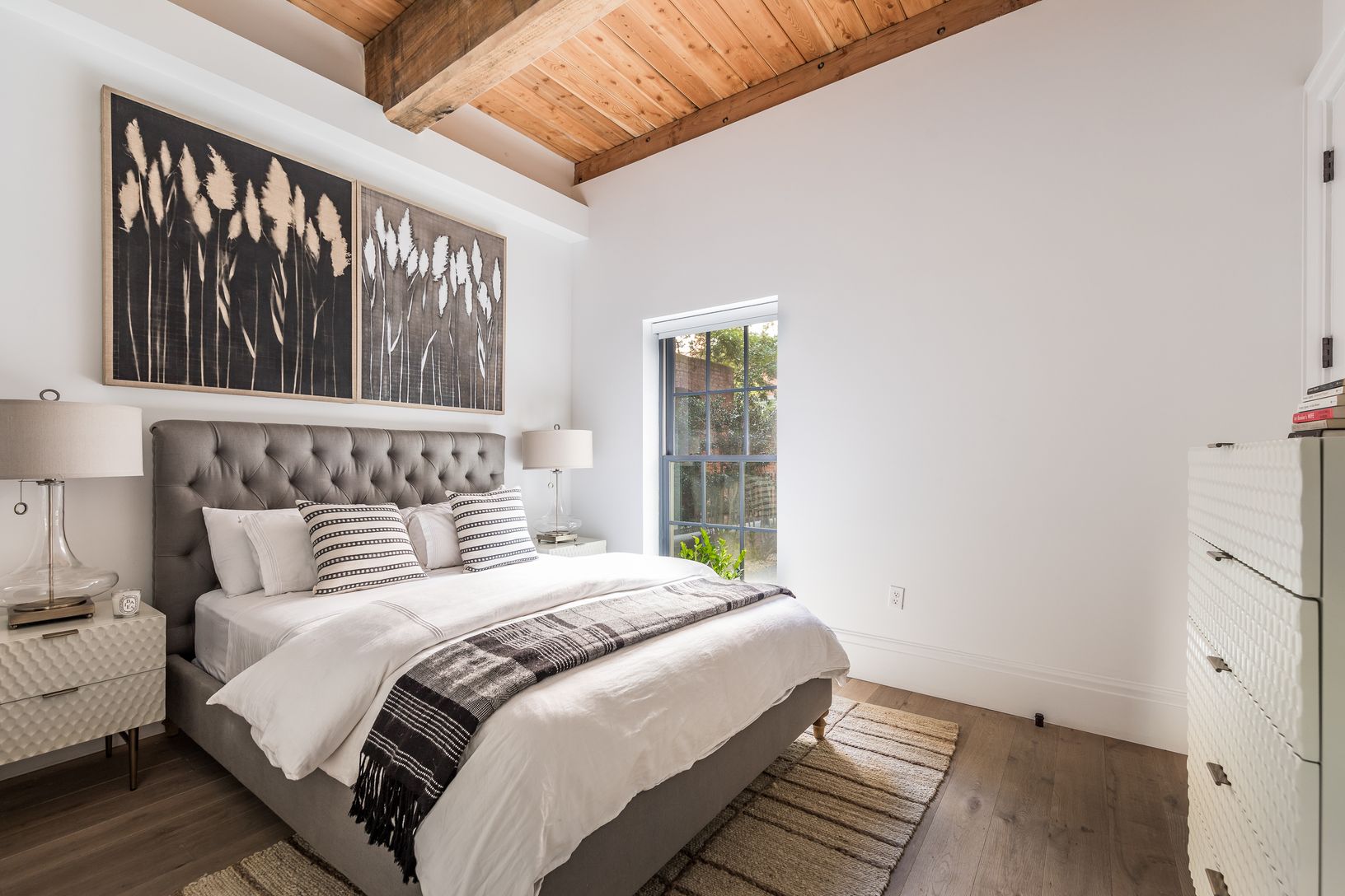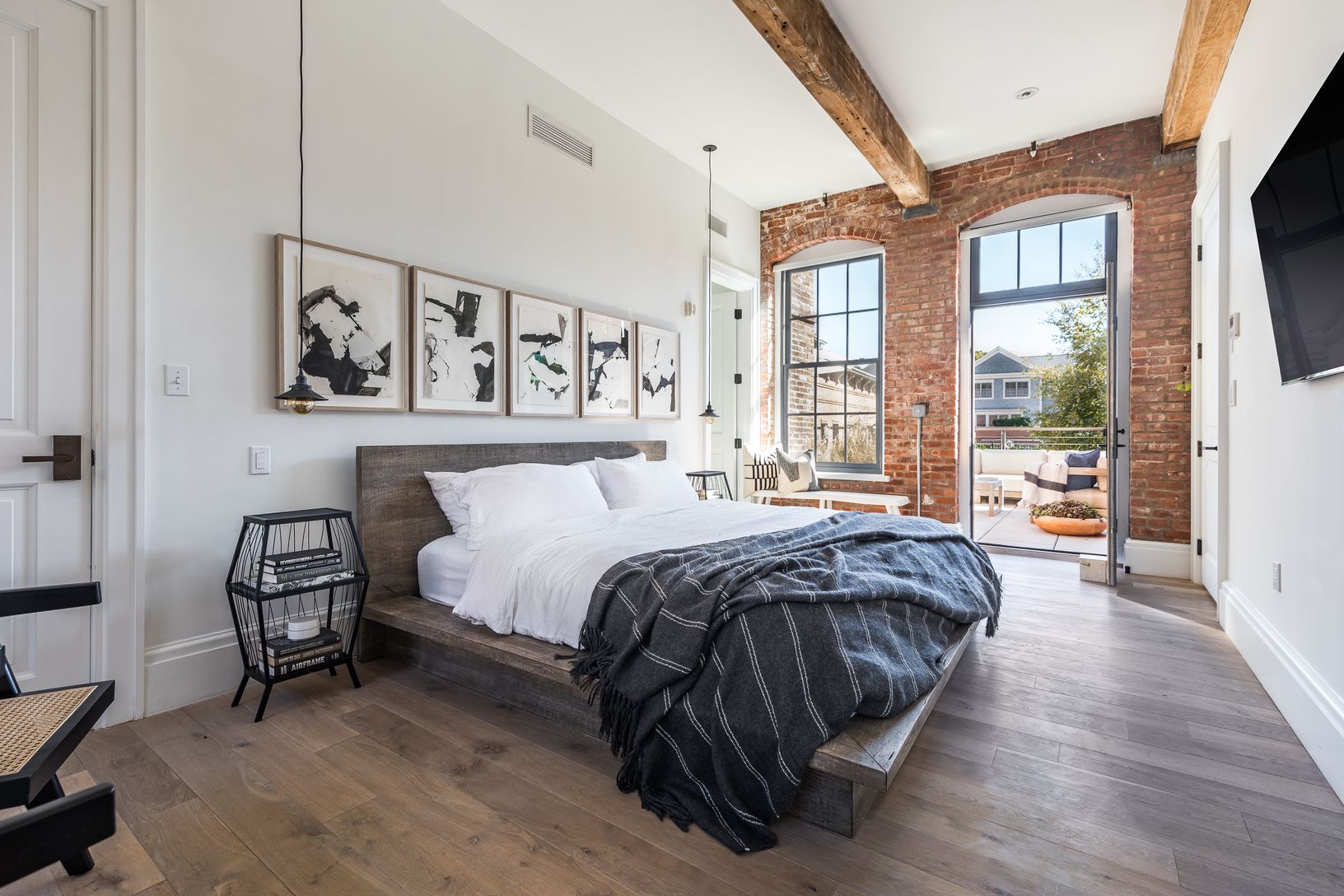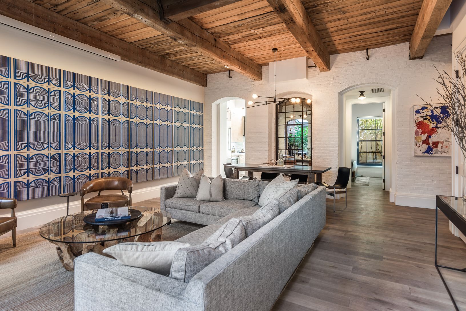 On the garden and second level of Watchcase, this elegant, well-proportioned, north/south-facing 3-bedroom, 3-bath factory apartment offers a charming private garden entry at The Historic Watchcase Factory in Sag Harbor Village. The gracious pine-beamed 11'+ ceilings and exposed brick details complement the large living space with a projection entertainment system along a sophisticated art wall. A separate L-shaped kitchen provides an ideal la
