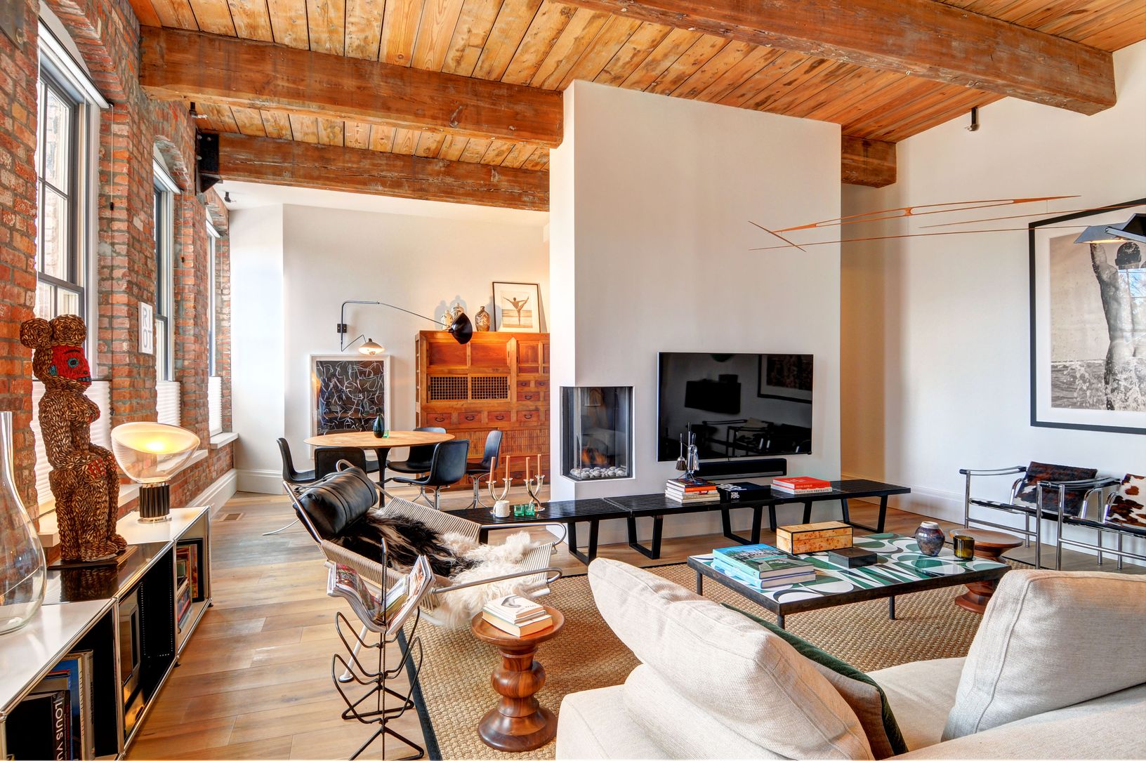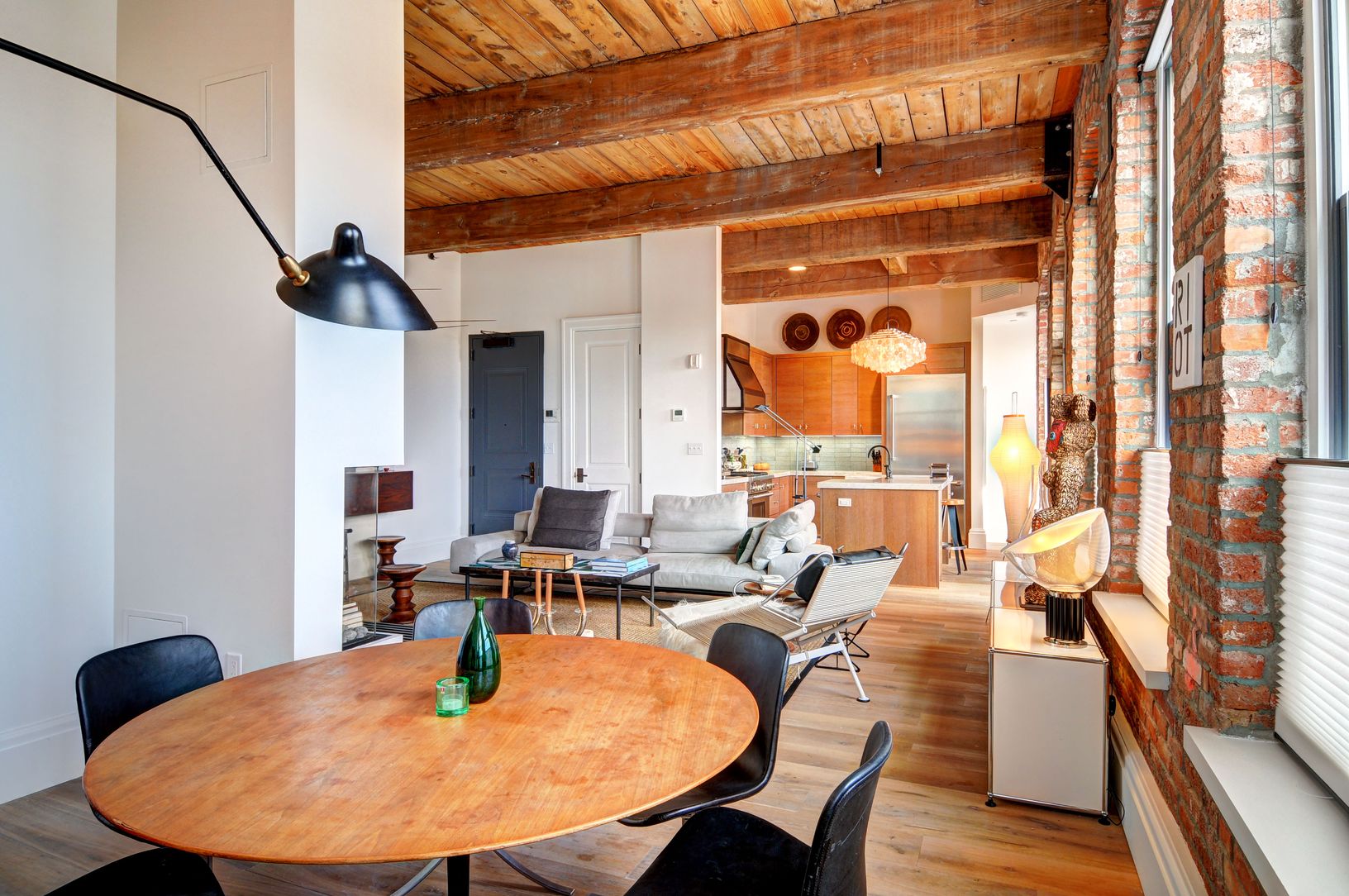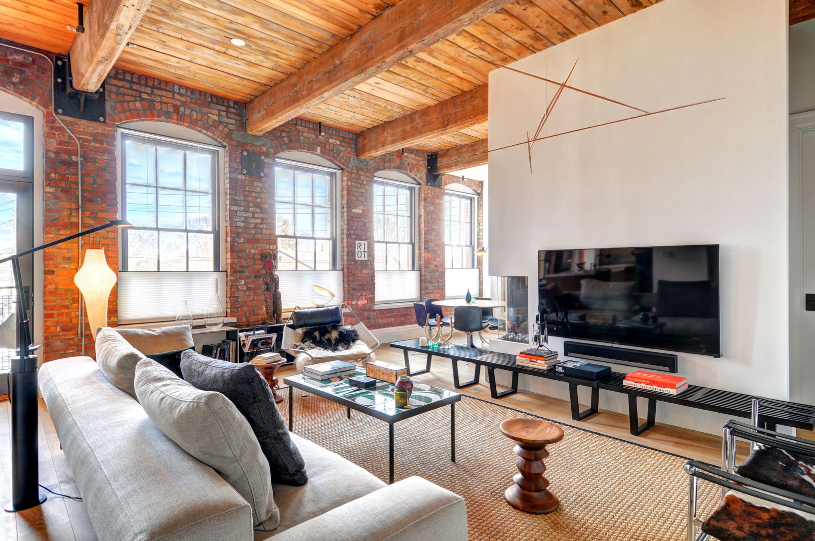 W-202, a 1175 s.f. condominium, located on the second floor of the factory building, overlooking Washington Street, offers one primary bedroom, two full baths, a gas fireplace, and a balcony with beautiful village views. Custom features include 11'2 pine-beamed ceilings, eight arched windows with North and East exposures, and exposed brick walls that add to the unique character. There is a primary bedroom wing with an en-suite 5-fixture bath w