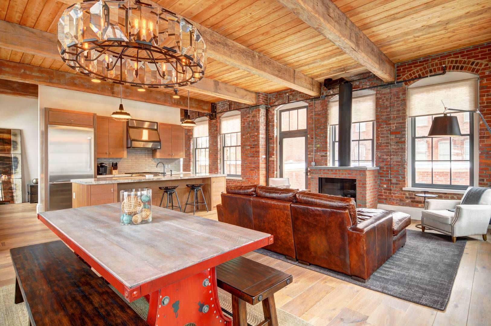 Located on the second floor of the northwest wing in the factory, this large 2 bedroom with 3 baths has 29 graciously proportioned windows, allowing sunlight to pour in from three directions. The two south-facing terraces offer both private retreat and expansive entertaining spaces. 11'+ pine-beamed ceilings and exposed brick combine to create a beautifully appointed 1,914 sf apartment. The windowed entry hallway opens up to two grand living s