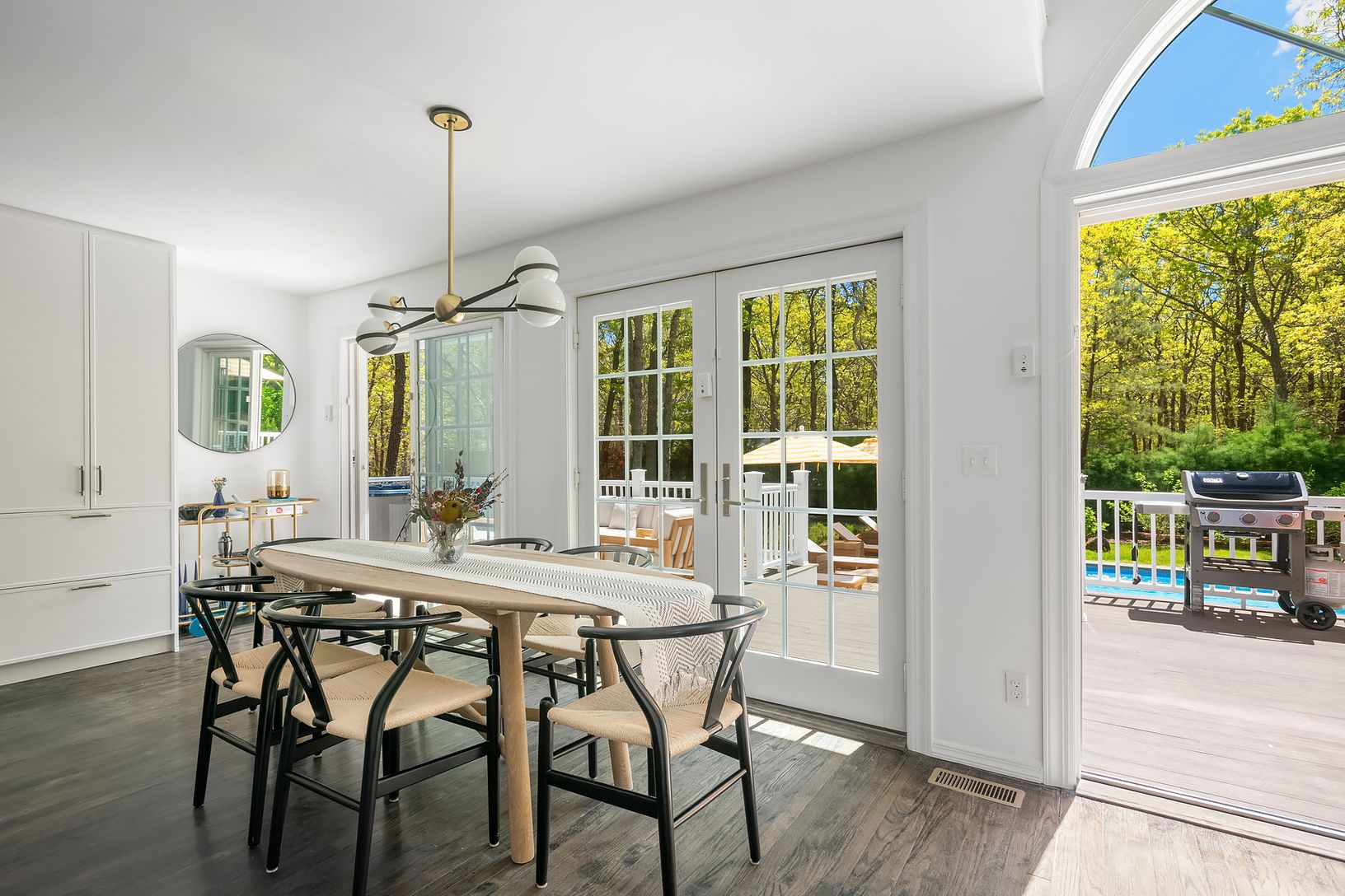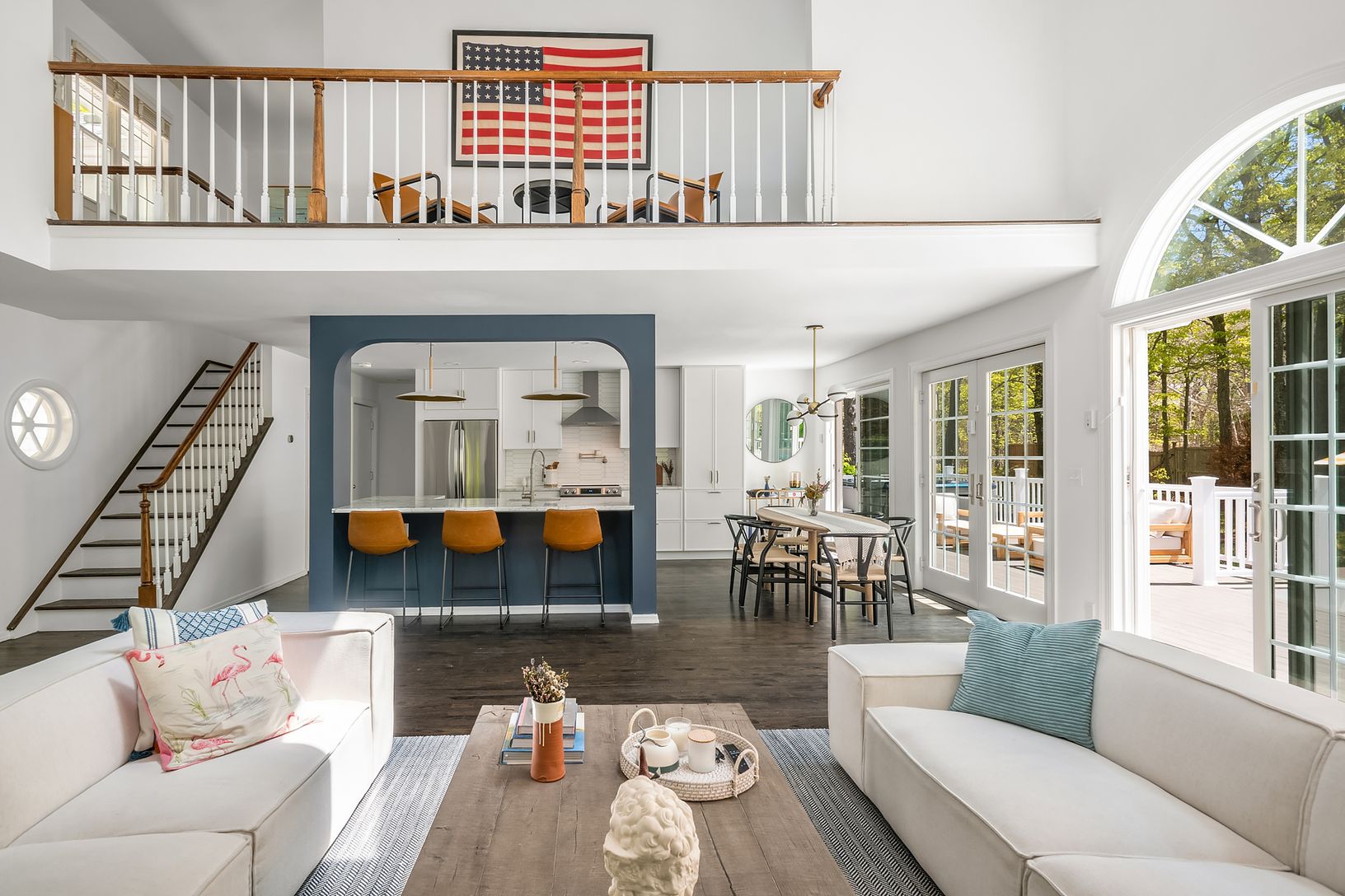 Experience a luxurious summer getaway at 15 Cosdrew Lane, where this exquisite residence awaits. Recently renovated and tucked away at the end of a peaceful cul-de-sac, this charming home boasts four bedrooms and three baths, offering an elegant and comfortable living space. The first floor welcomes you with a spacious great room featuring a vaulted ceiling, a cozy wood-burning fireplace, and an abundance of glass doors that fill the area with