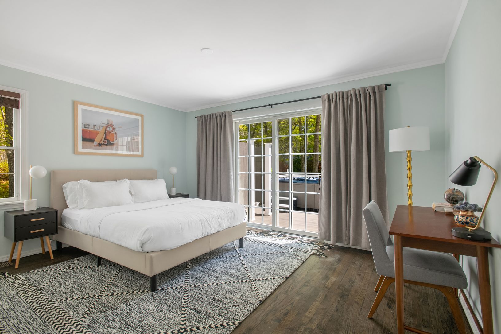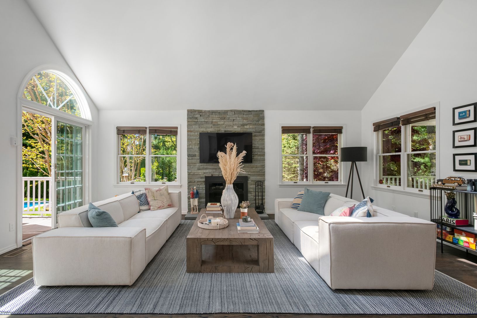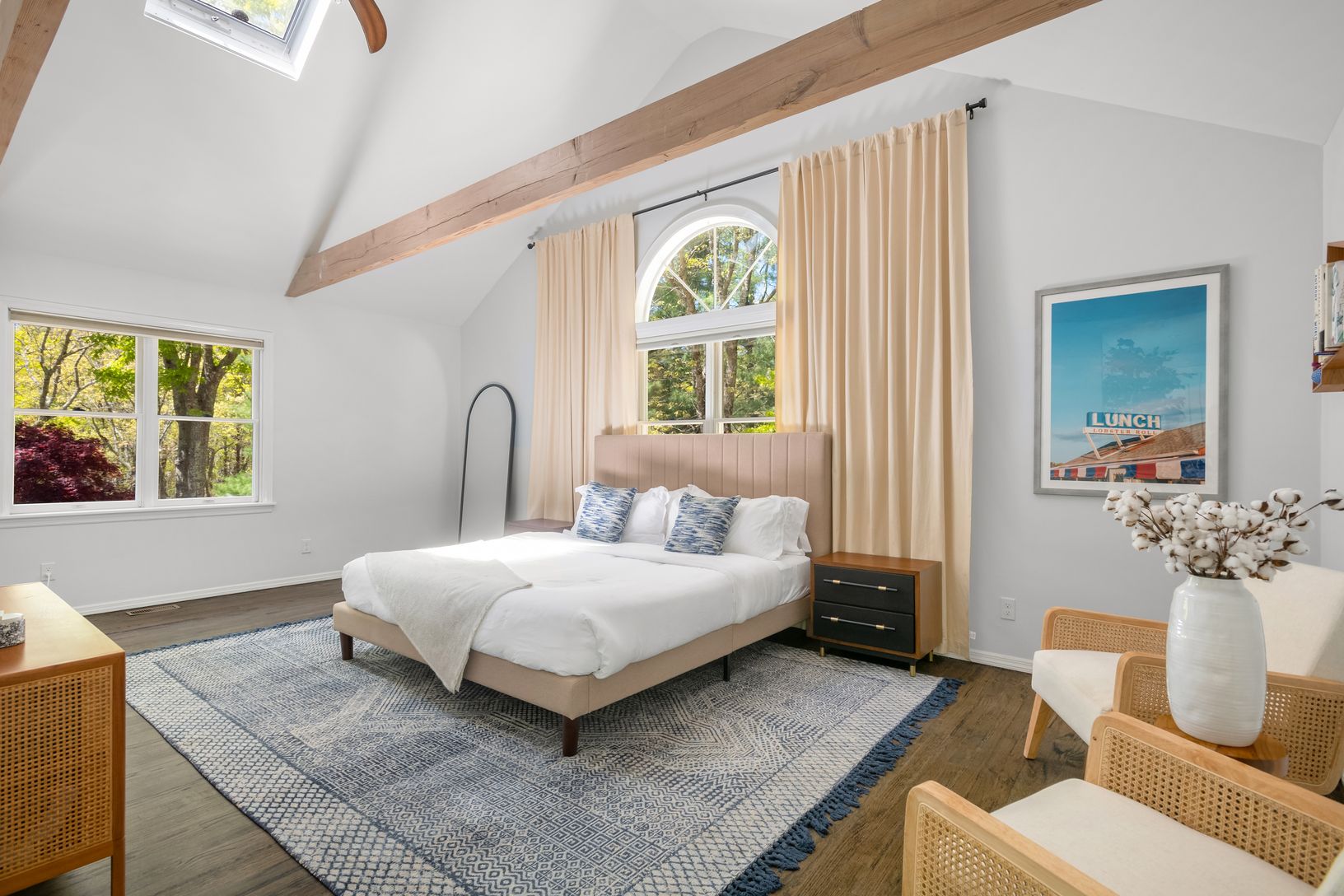 This meticulously designed home is tucked away at the end of a cul-de-sac and features 4 bedroom and 3 baths. The first floor features a spacious great room with vaulted ceilings, a cozy wood burning fireplace and an abundance of glass doors streaming with natural light which easily connects to the expansive wood deck and lush grounds. Finishing off the first level, an inviting eat-in-kitchen, bedroom and full bath. The second level has a newl