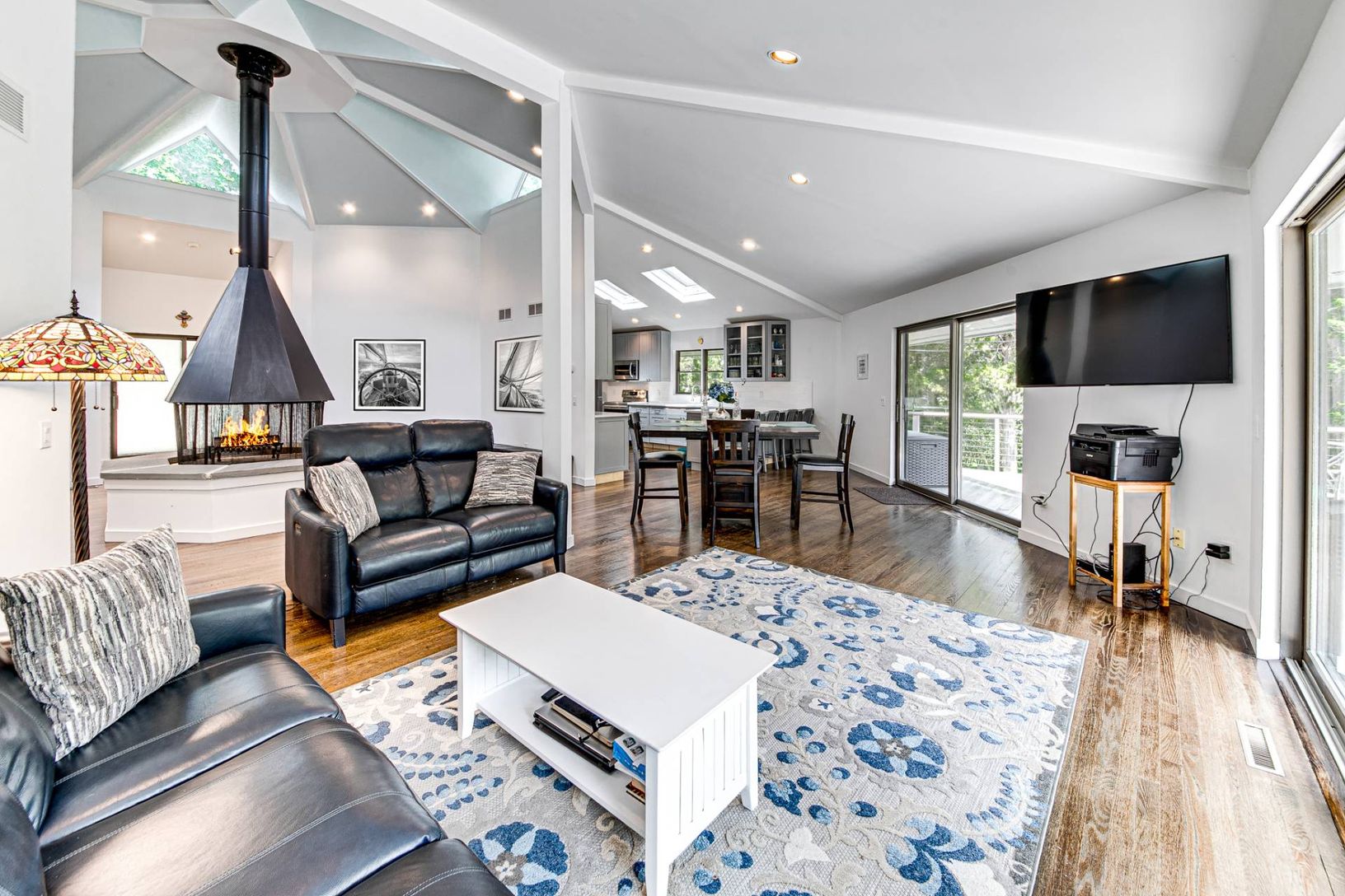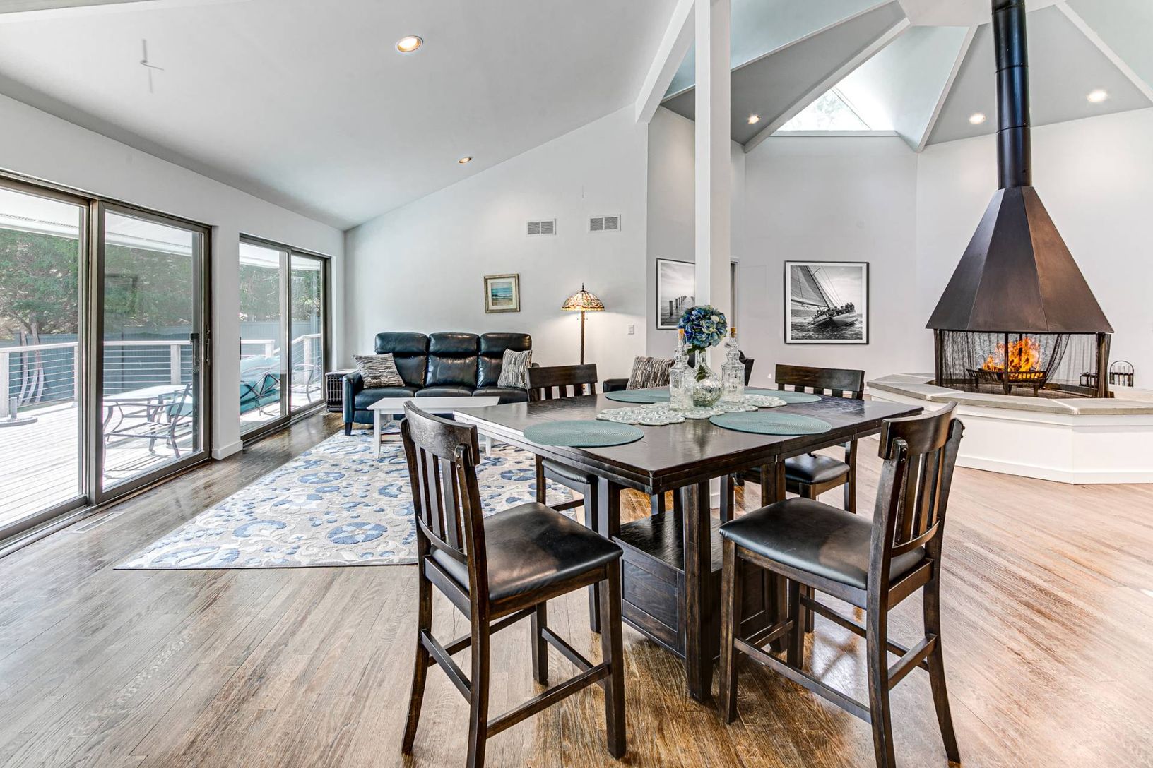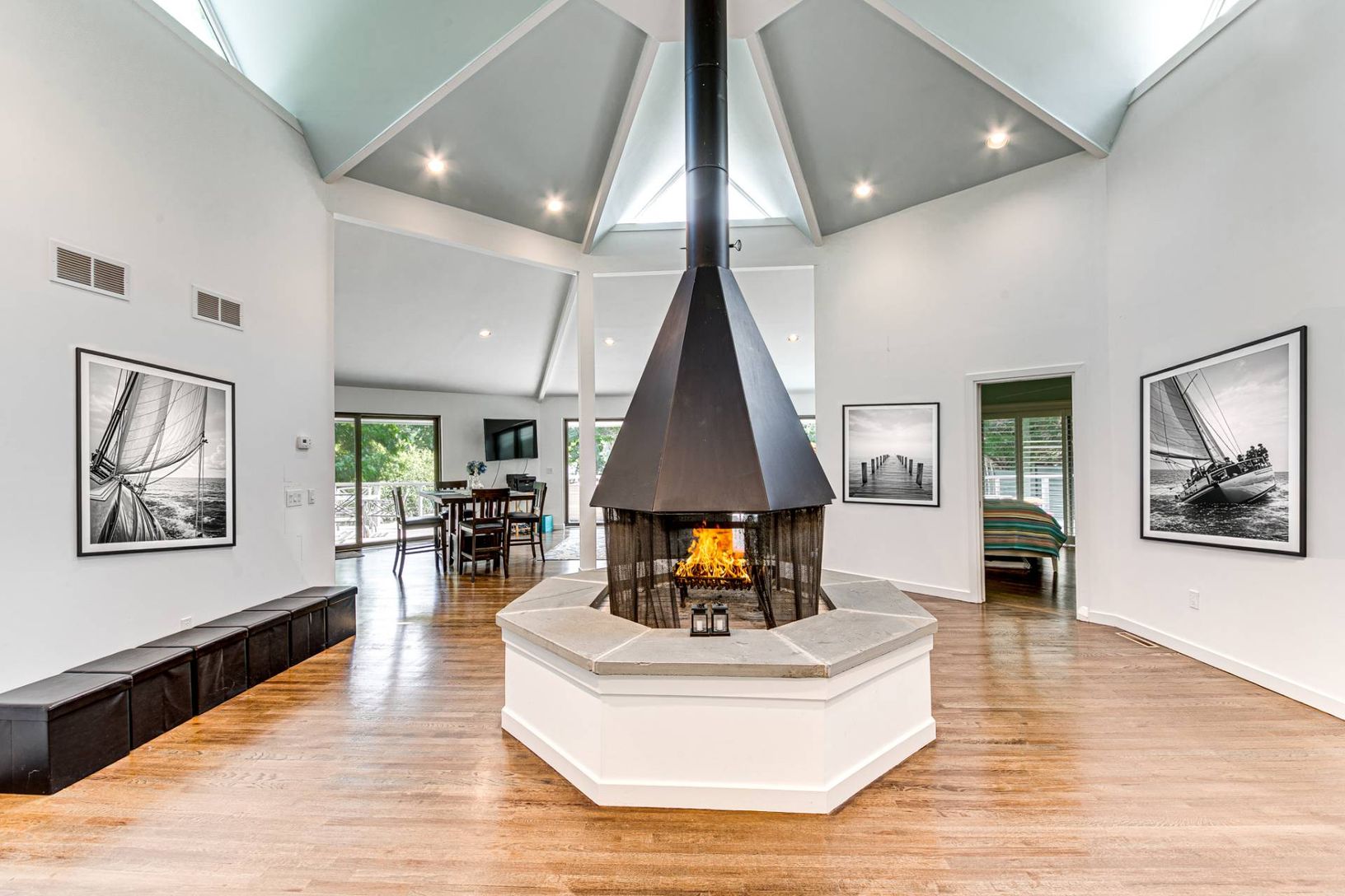 Located on protected Menantic Creek flowing into West Neck Harbor with direct access to open water, this contemporary waterfront is designed for easy summer living. Set on approximately one acre, the property offers a balance of privacy and usable waterfront space. Angular rooflines and clerestory windows bring in consistent natural light while maintaining a sense of seclusion. The main living space is centered on a sculptural fireplace that a