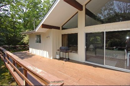the two guest rooms and bathroom on the other side. Other features are a masonry fireplace and chimney, wrap around decking, new roof, ceiling fan in bedroom, central air conditioning, and a cedar closet in full basement that has a door to walk out to side yard.<