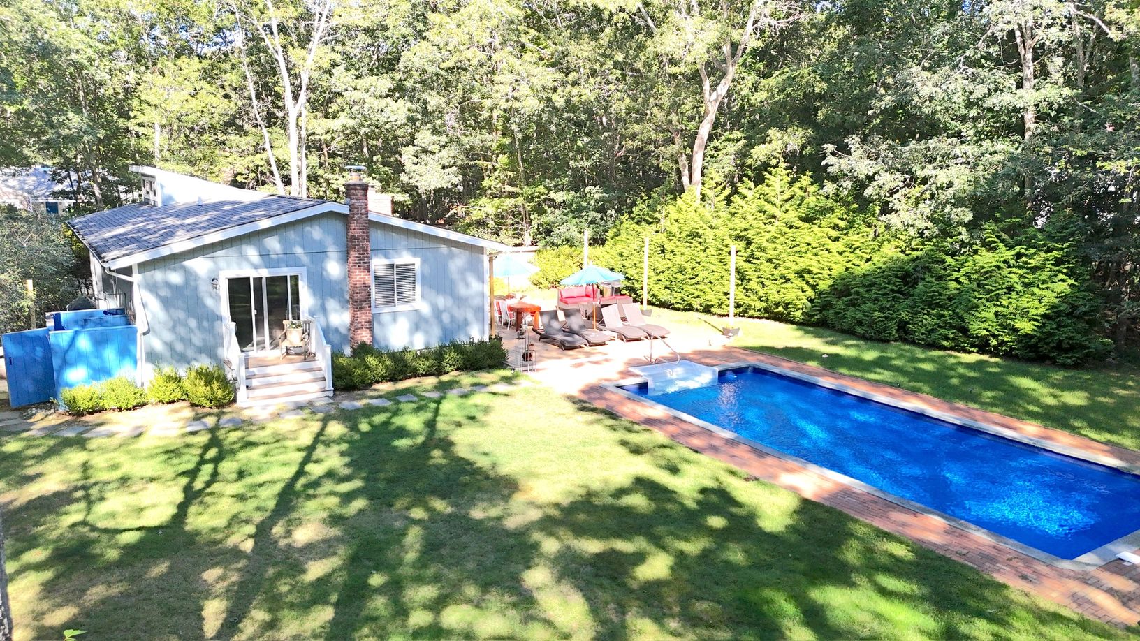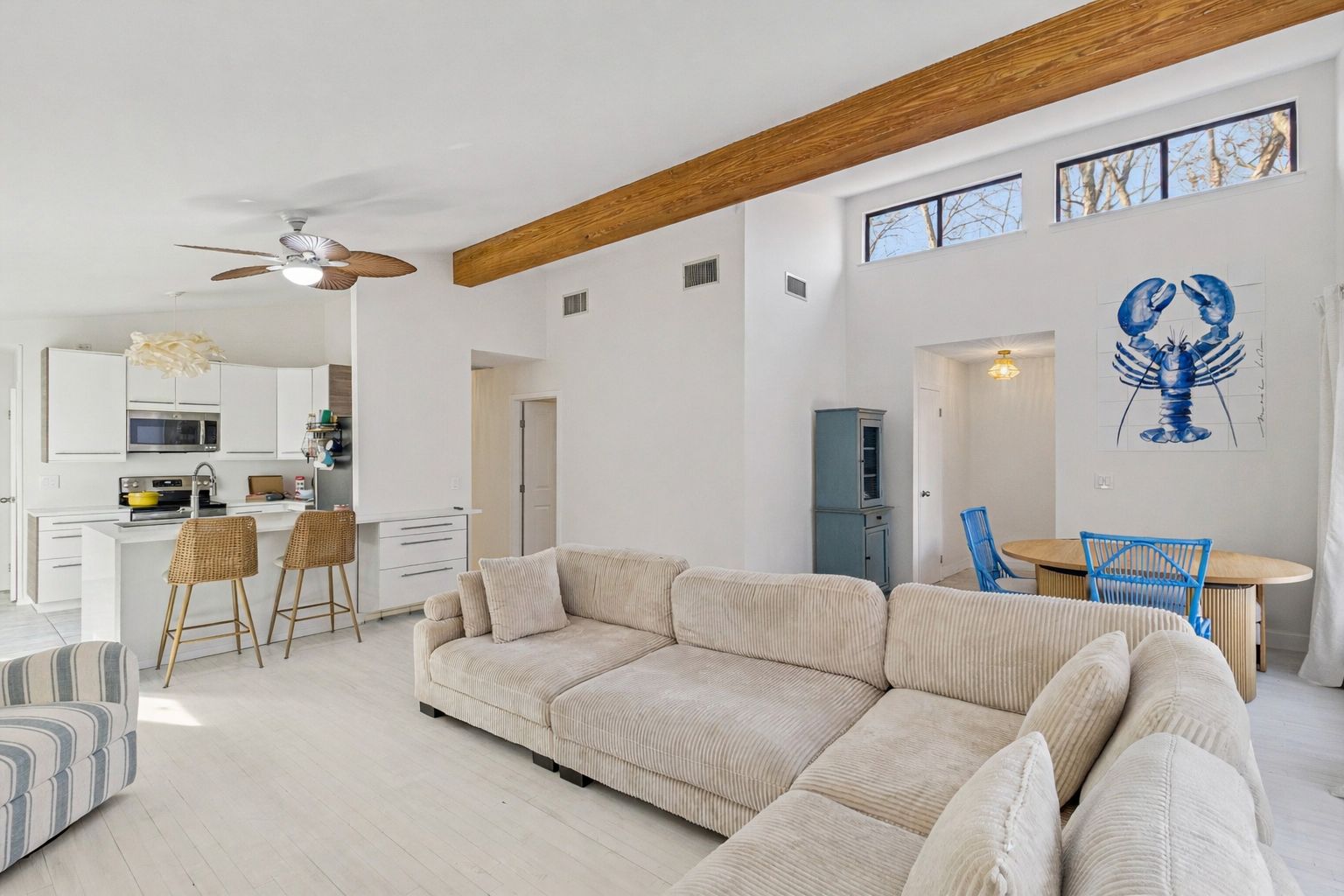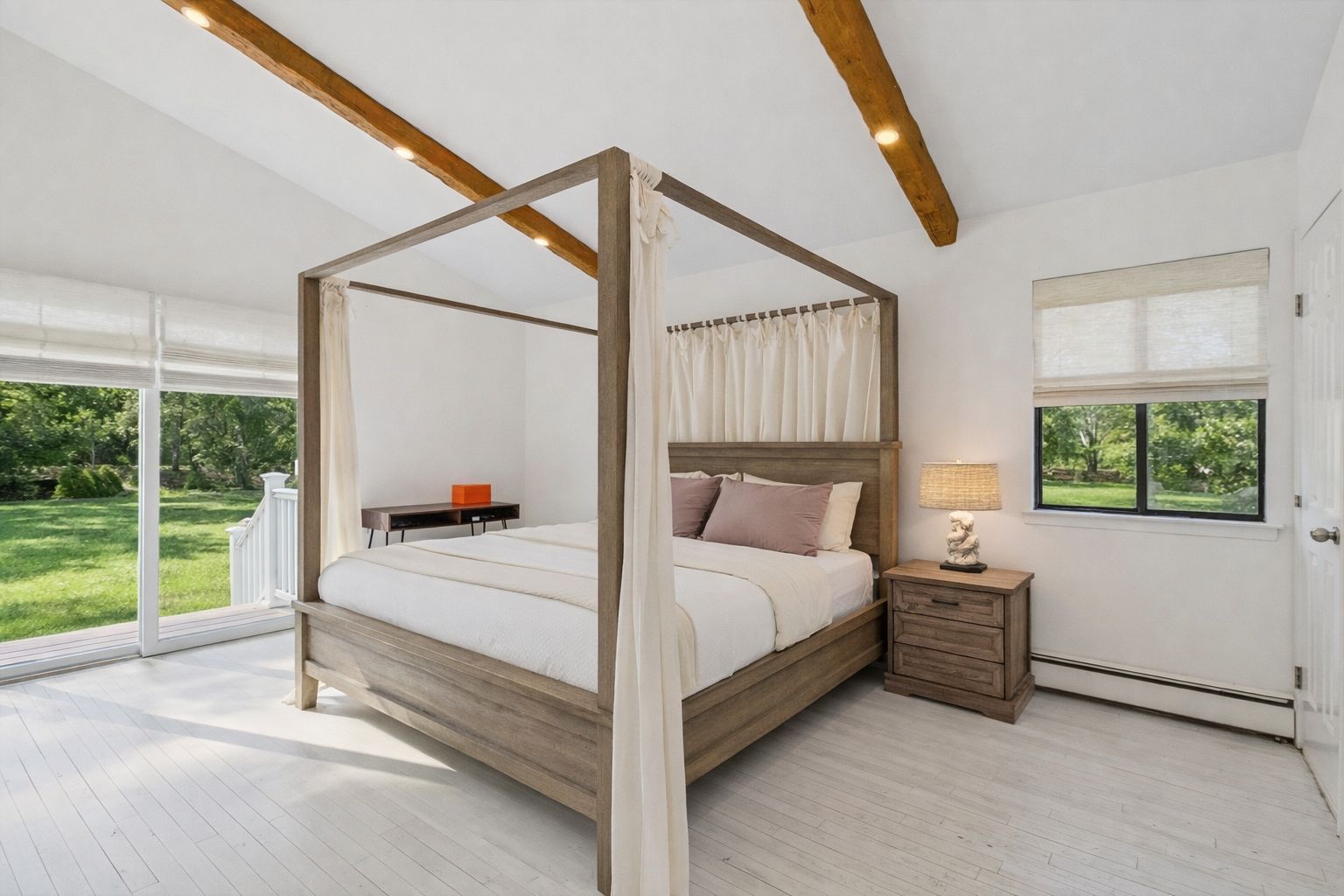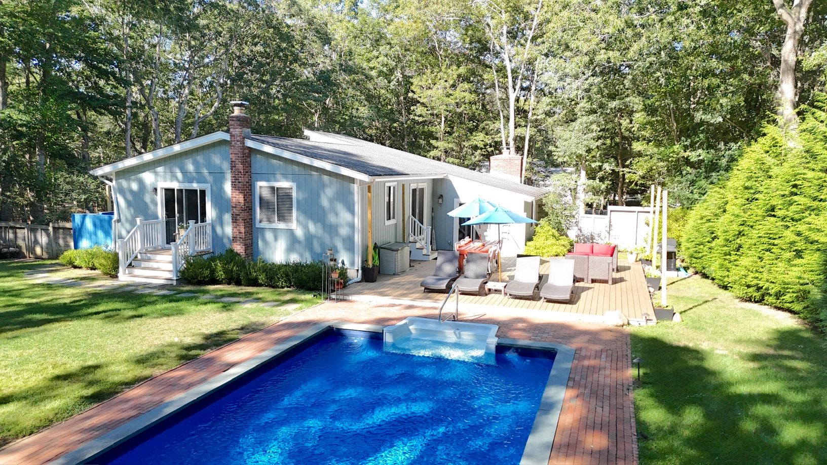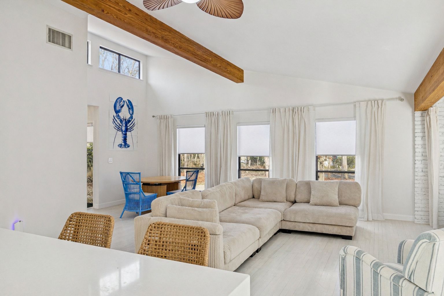 Located on a full acre in East Hampton's Springs, this bright and beautiful one-level contemporary has everything you need in a free-flowing East End home. Flooded with natural light and with modern amenities, interior features include an open living & dining space with whitewashed hardwood floors and high ceilings, a sleek kitchen with silestone counters and porcelain tile floor, separate sunken den with white brick wood burning fireplace