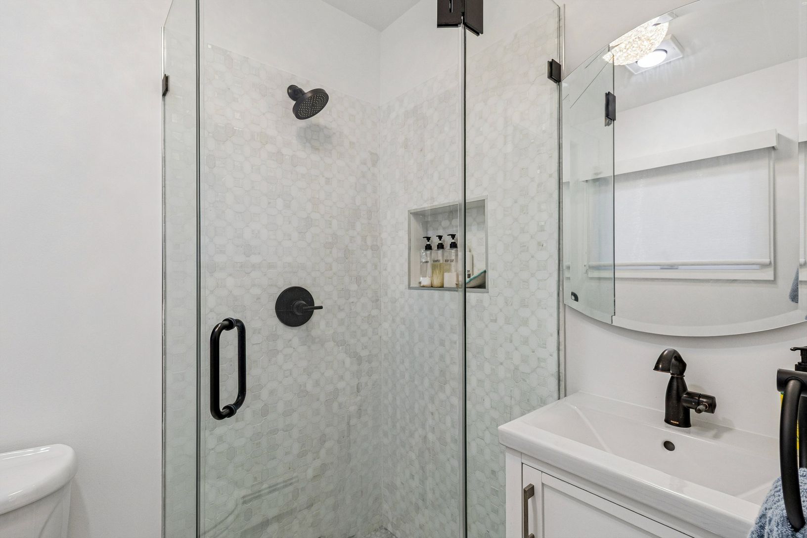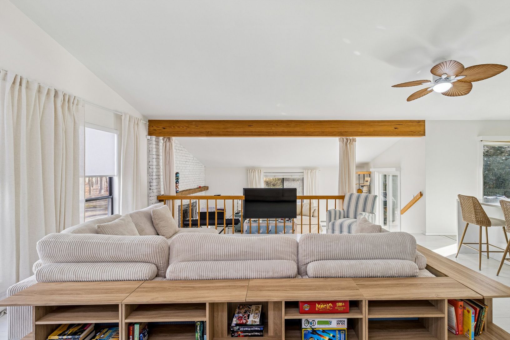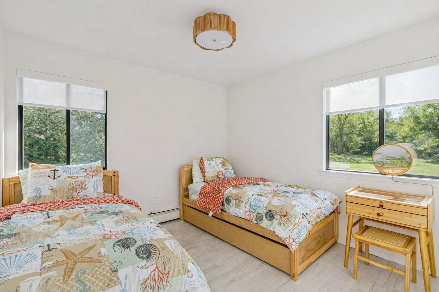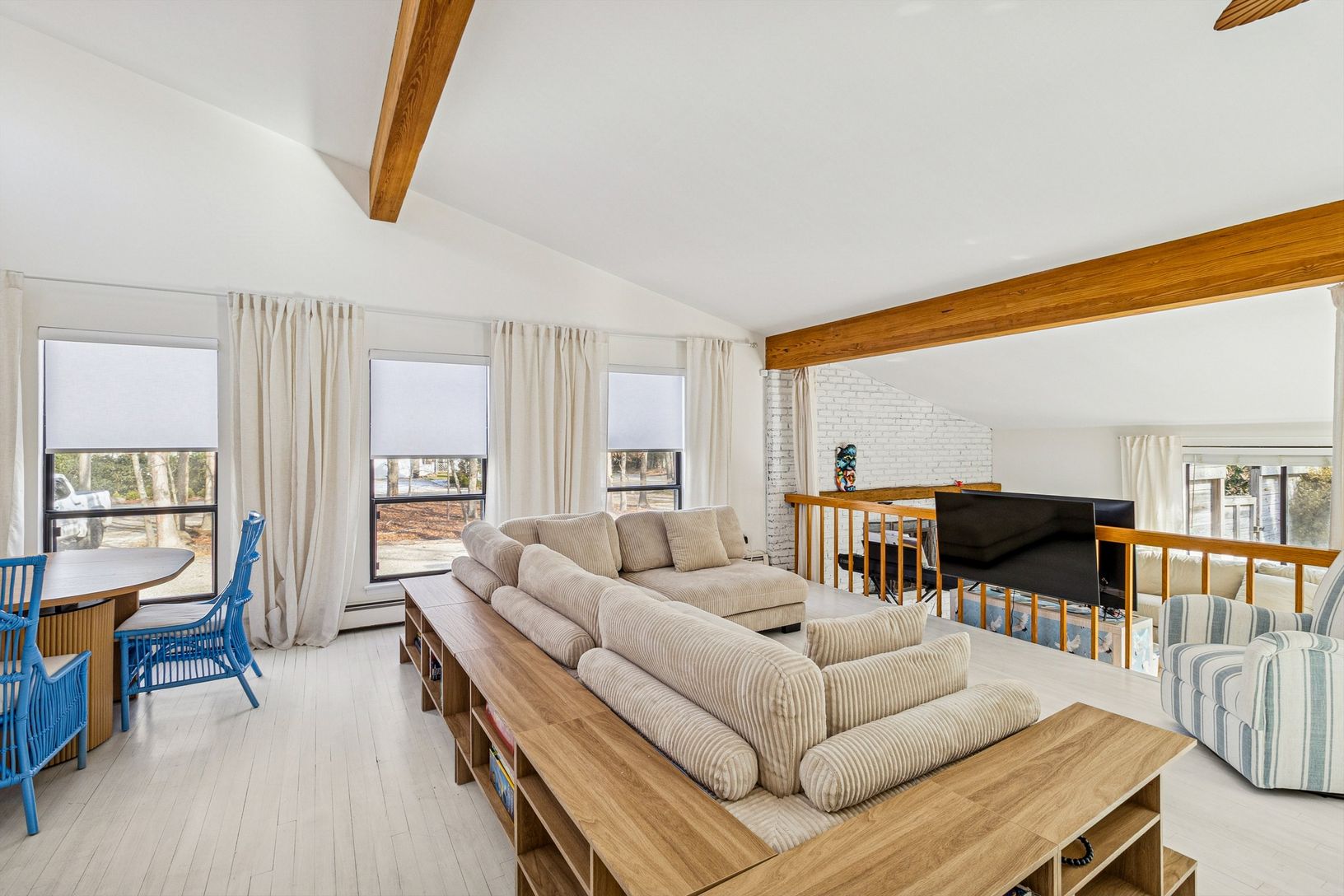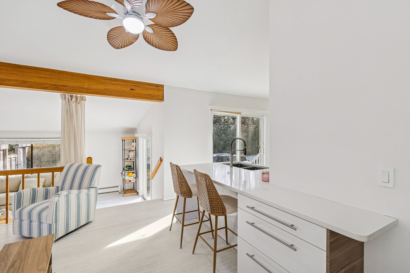 Located on a full acre in East Hampton's Springs, this bright and beautiful one-level contemporary has everything you need in a free-flowing East End home. Flooded with natural light and with modern amenities, interior features include an open living & dining space with whitewashed hardwood floors and high ceilings, a sleek kitchen with silestone counters and porcelain tile floor, separate sunken den with white brick wood burning fireplace