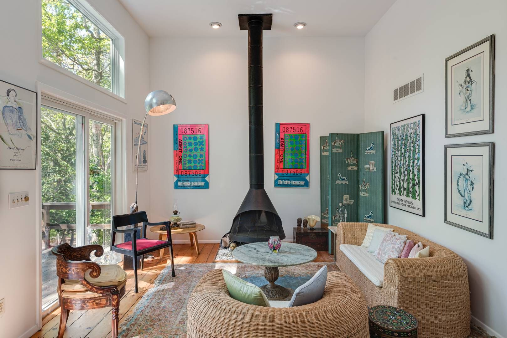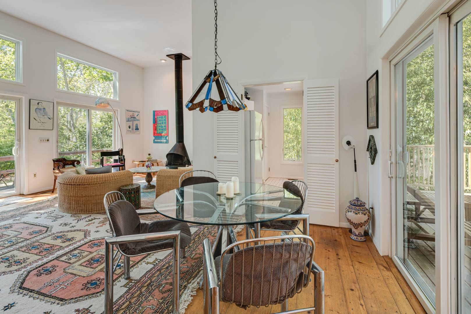 This three bedroom, two bath contemporary is located just half a mile to Three Mile Harbor access and less than two miles to beautiful Sammy’s Beach on Gardiners Bay. The first floor of this home features double height ceilings in the living room with a wood-burning stove and multiple levels of windows and sliding doors allowing sunlight to flood the room. The living room flows to the dining area and kitchen, both looking out to the back deck