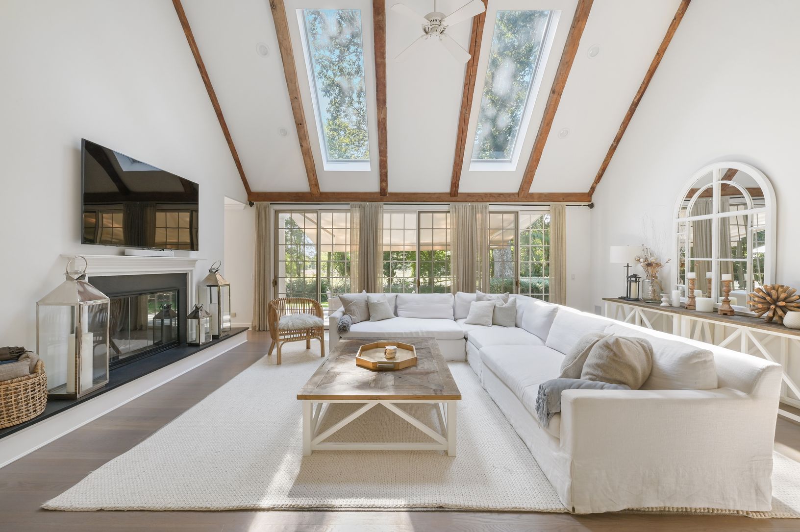 Privacy abounds on this highly coveted cul de sac just outside of East Hampton Village. Set down a long gated drive on two parklike acres, lies this 3500 +/- sq foot classic cedar shingle Fleetwood design overlooking a beautiful twelve acre meadow. A storybook bluestone patio leads to the inviting front porch with Ipe decking opening into an entry foyer which overlooks the glass lined vaulted ceiling living room with double sided fireplace. A