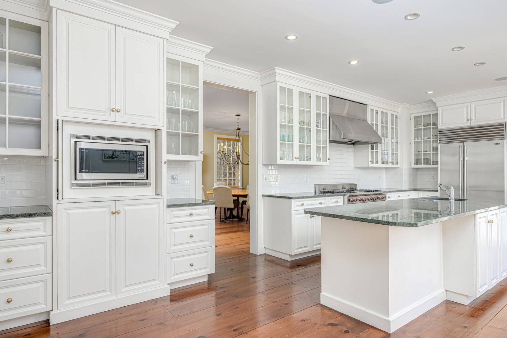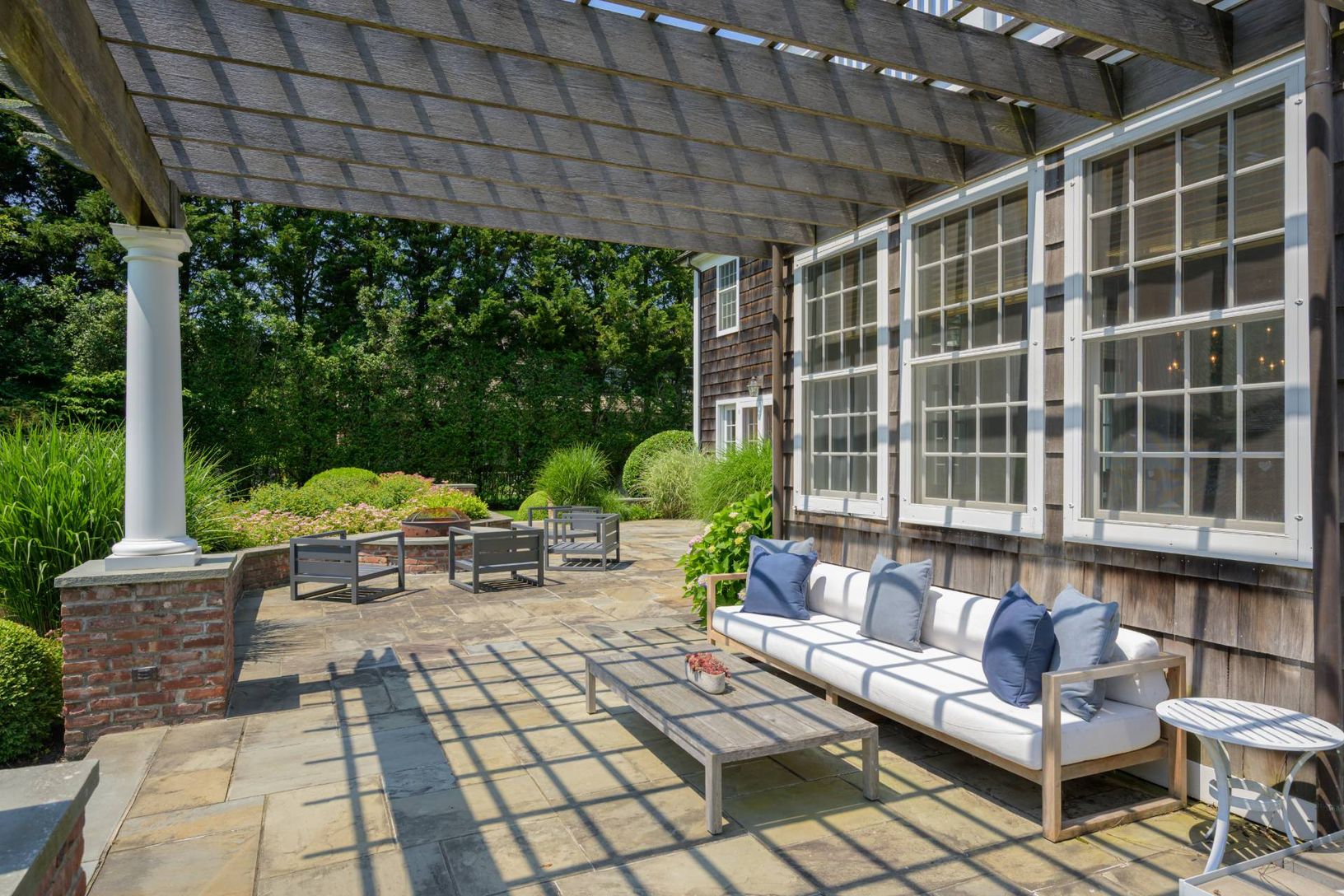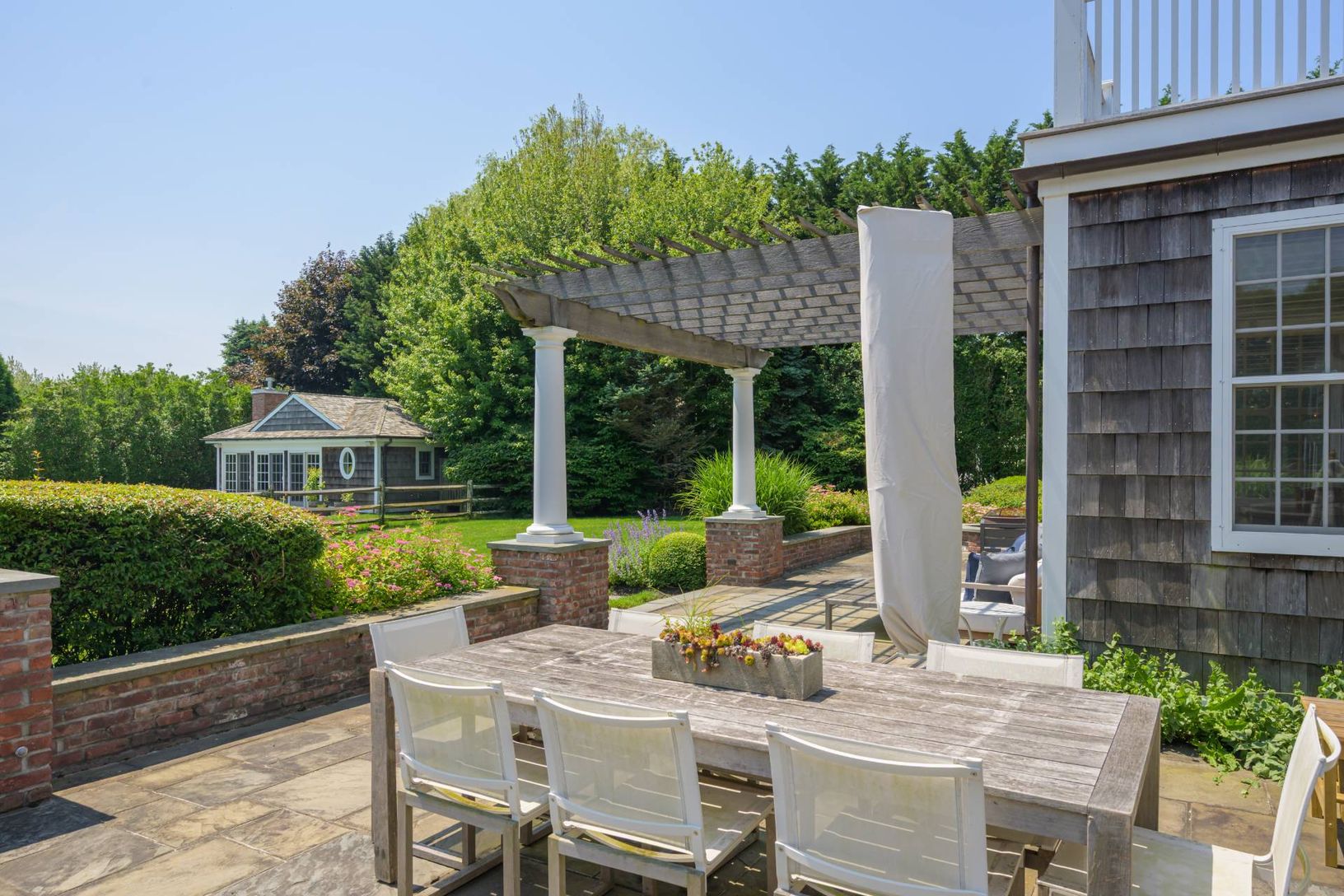 South of the Highway in Bridgehampton, on a full cleared acre, across from the 19-acre prestigious equestrian farm Khalily Stables sits this 5-bedroom, 6 1/2 bath Hamptons home. This elegant transitional home, distinguished by its high-quality exterior brickwork, features 5800 sq ft of beautifully maintained interiors spread over two levels. The main level features generous proportions and abundant natural light, with a thoughtfully designed f