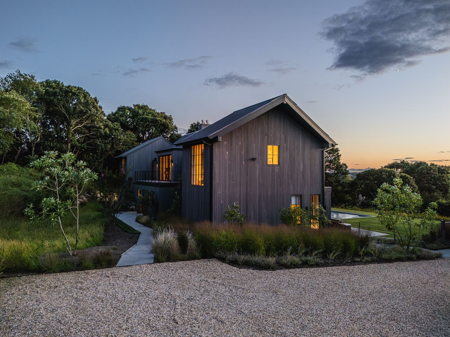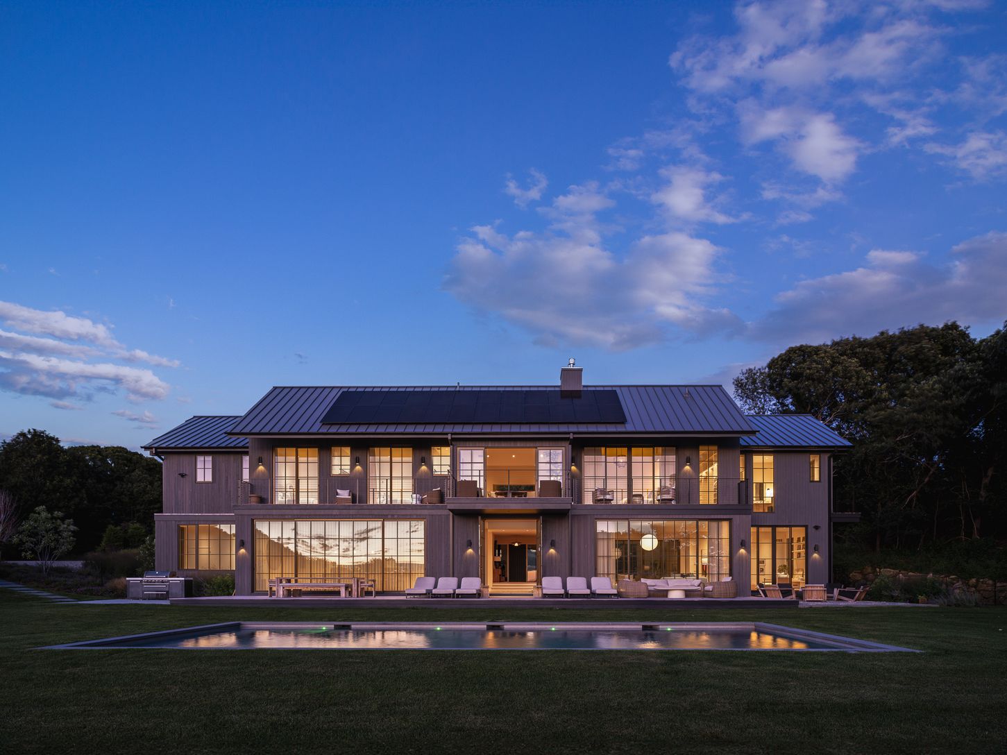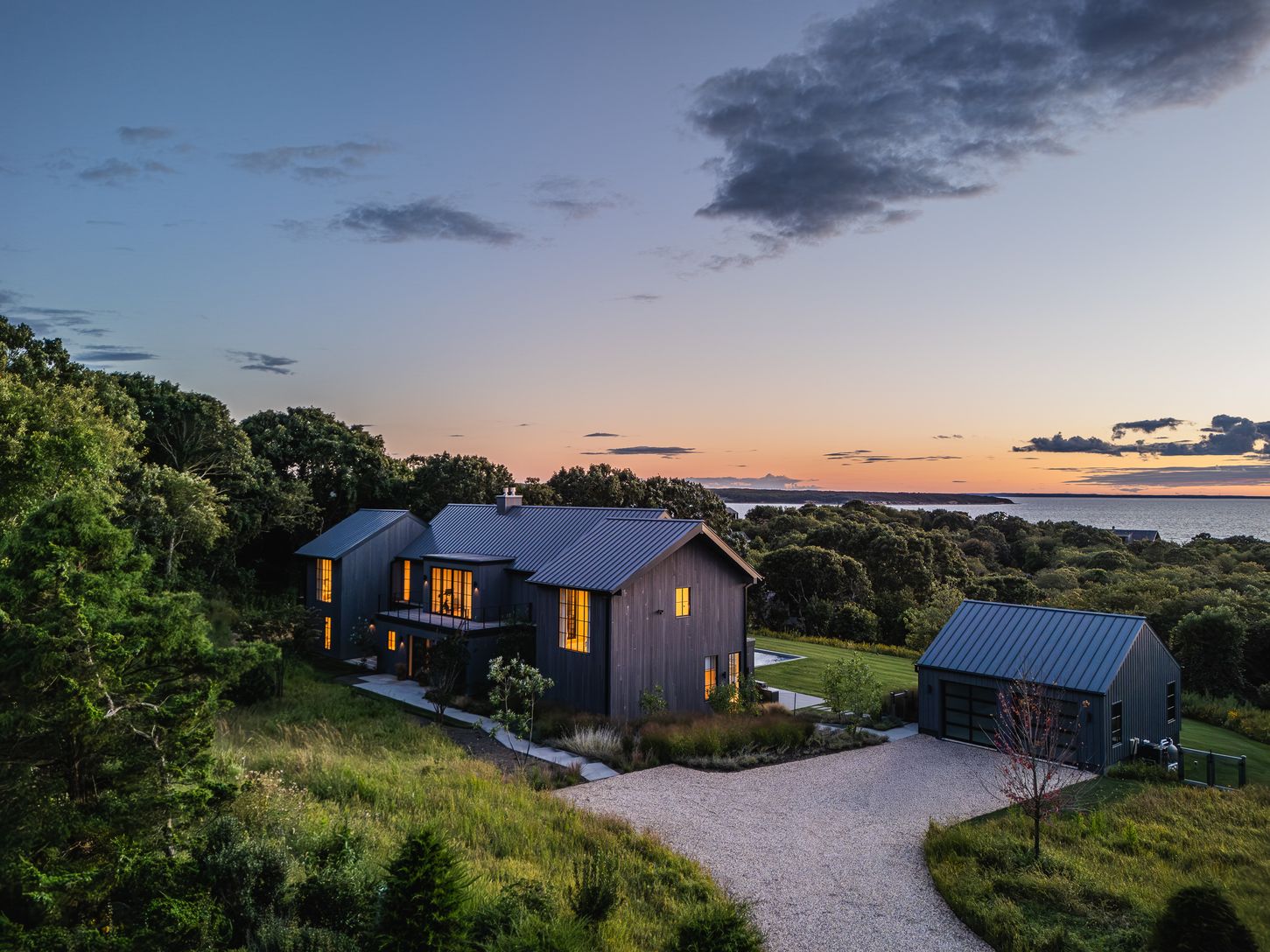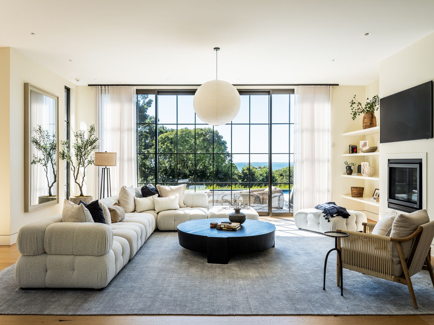 Designed by Michaelis Boyd, the home blends modern architecture with farmhouse warmth. Floor-to-ceiling glass frames sweeping sunset views across the bay to Gardiners Island, blurring indoor and outdoor living.