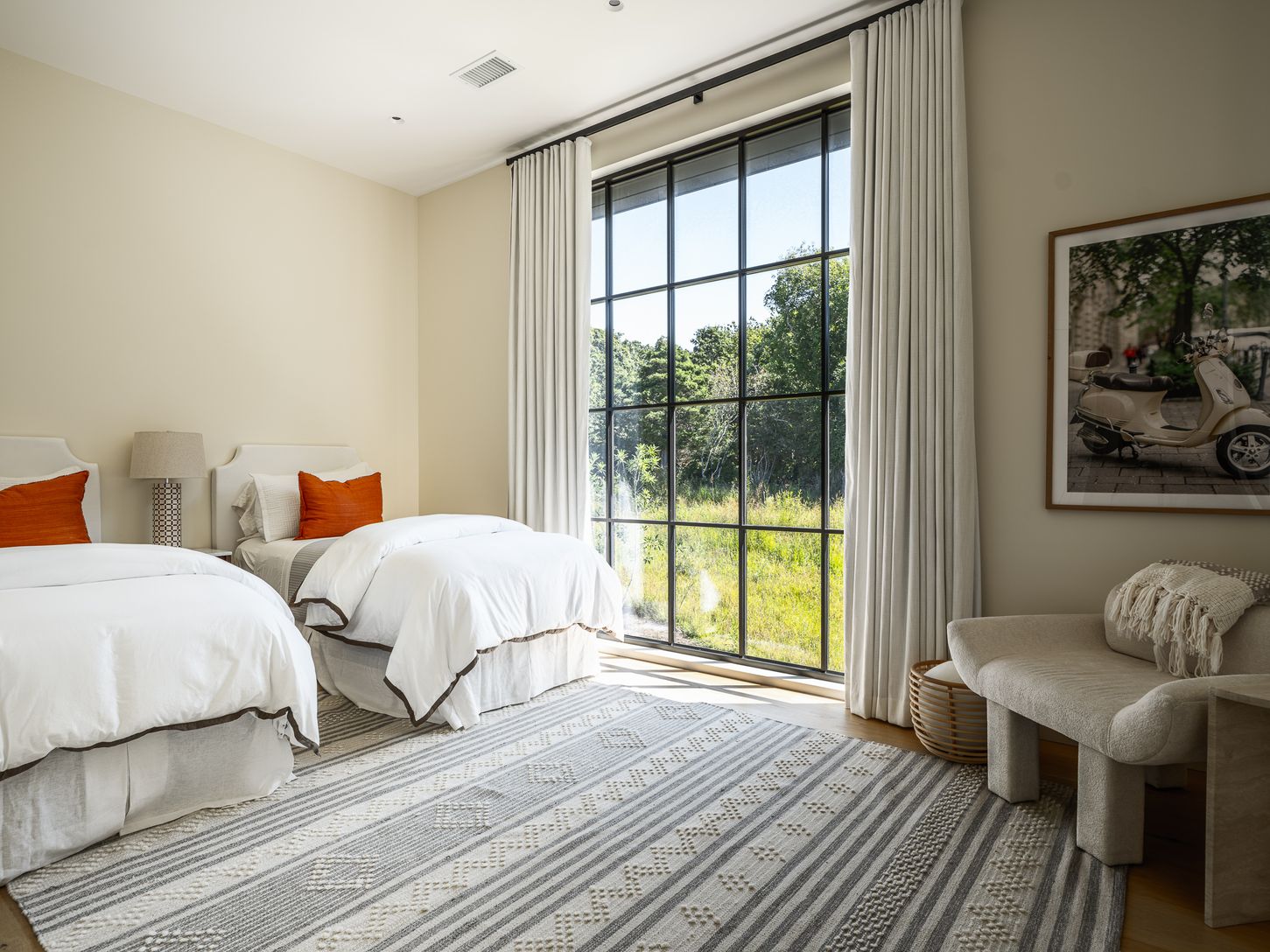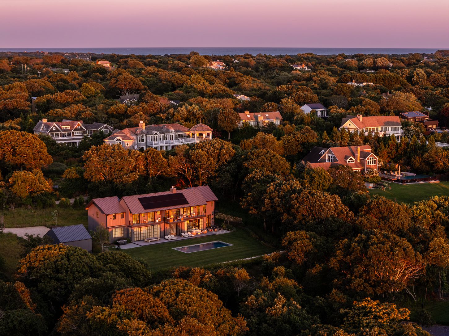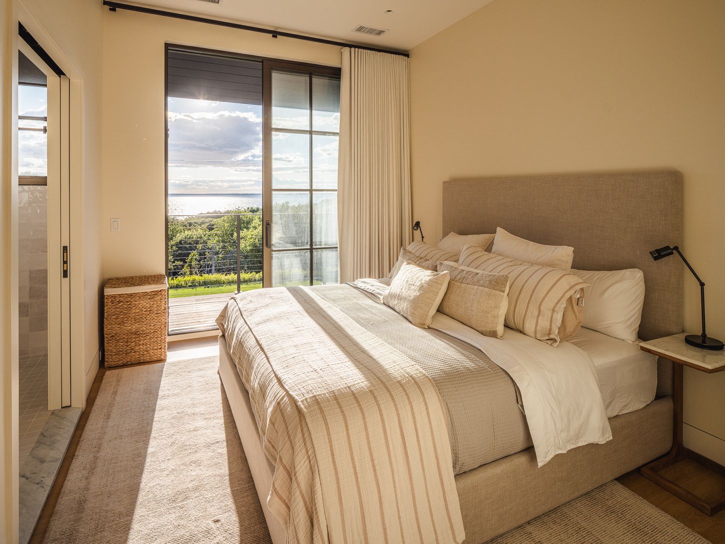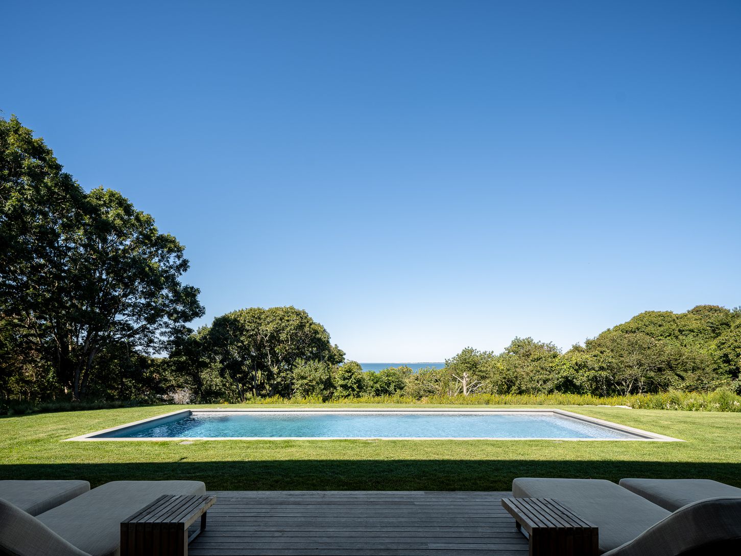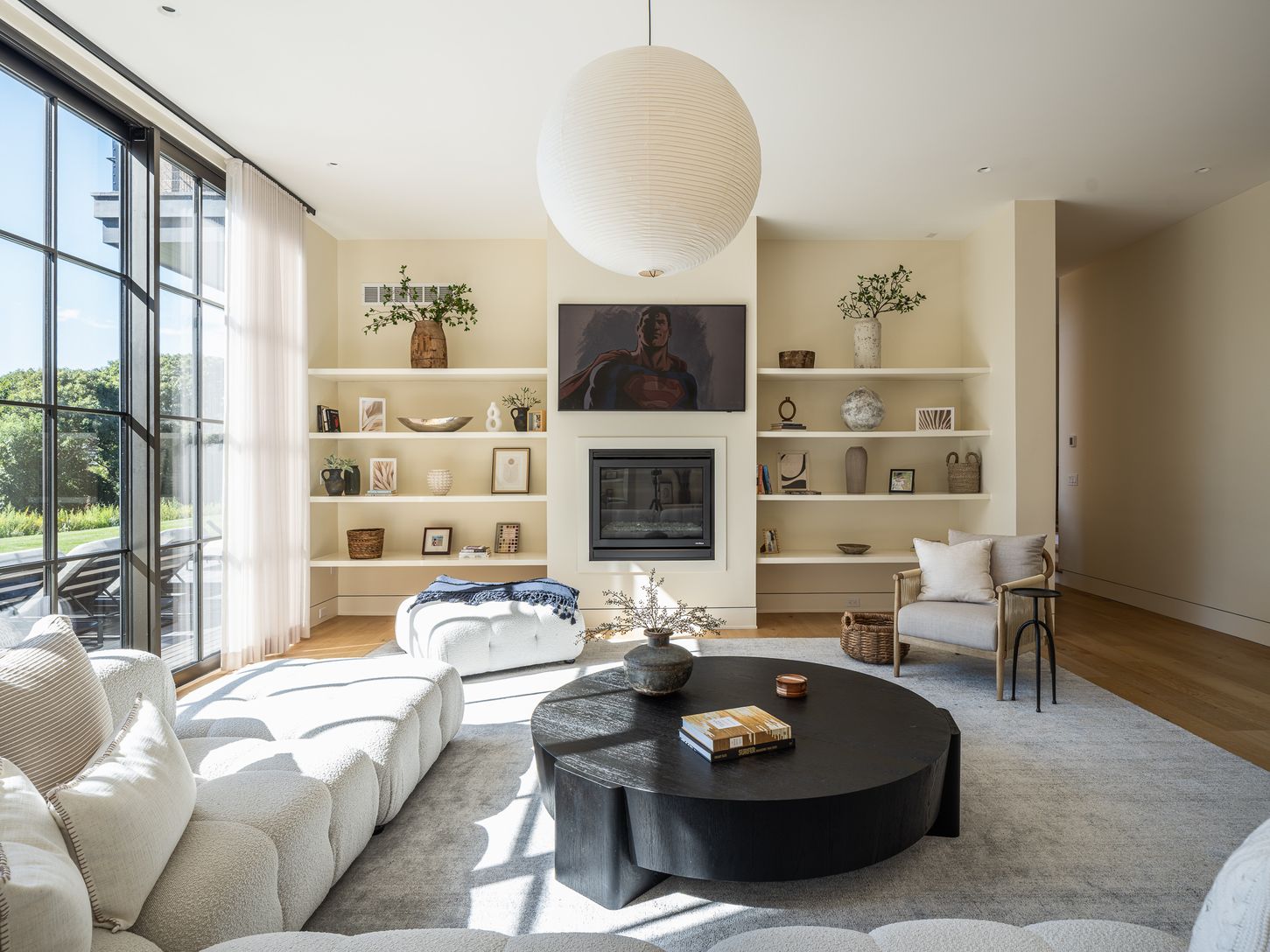 Designed by Michaelis Boyd, the home blends modern architecture with farmhouse warmth. Floor-to-ceiling glass frames sweeping sunset views across the bay to Gardiners Island, blurring indoor and outdoor living.