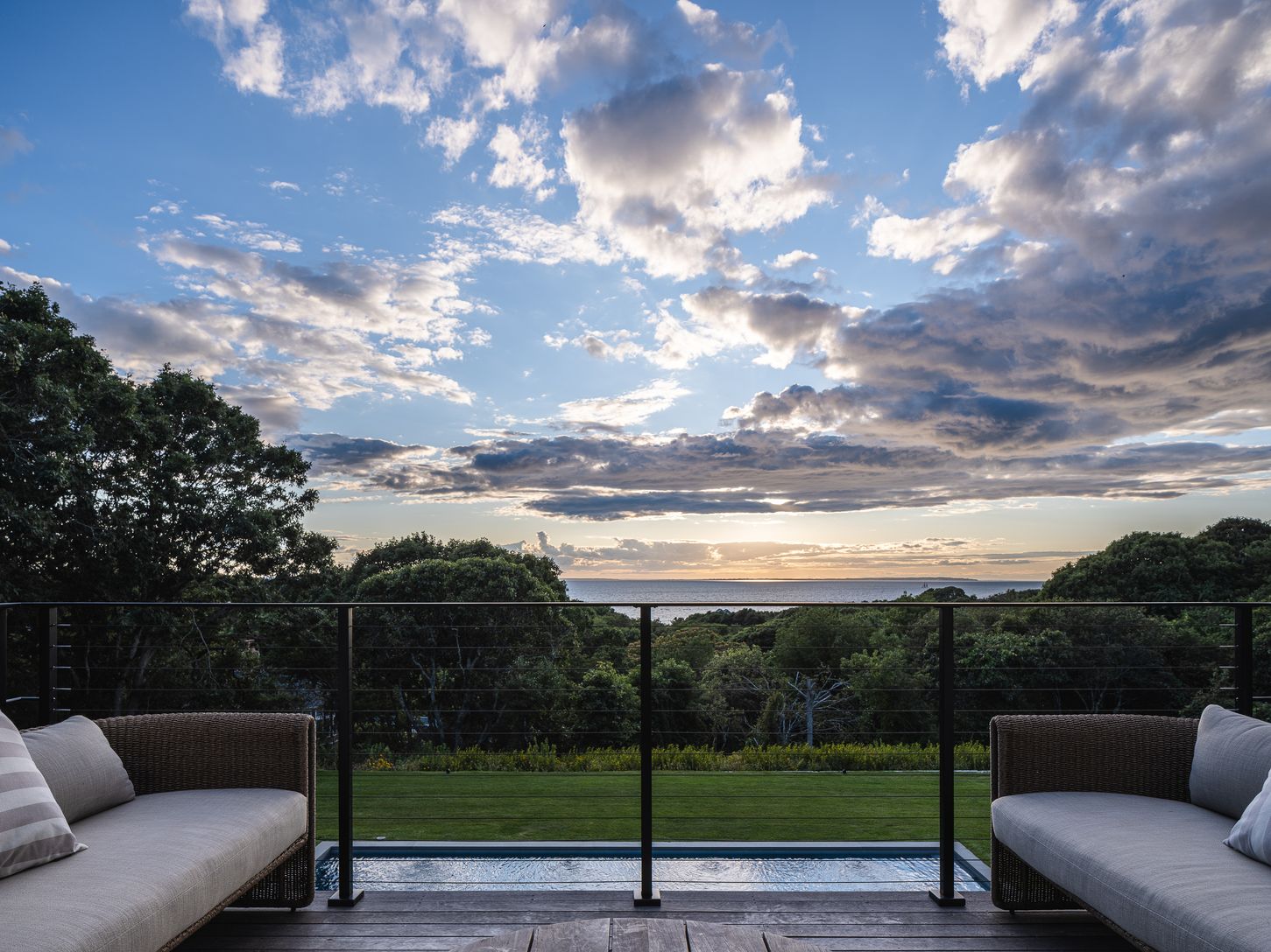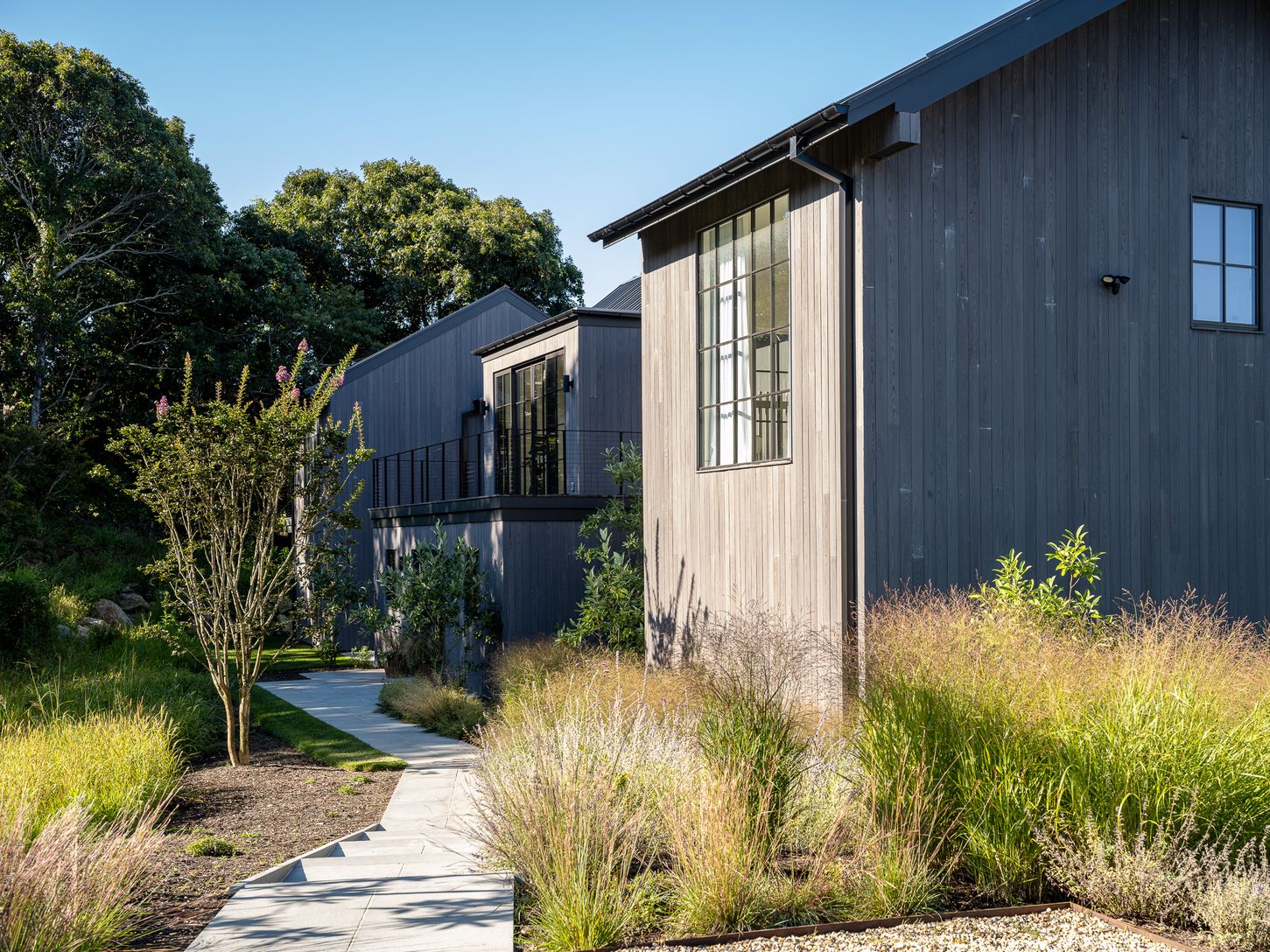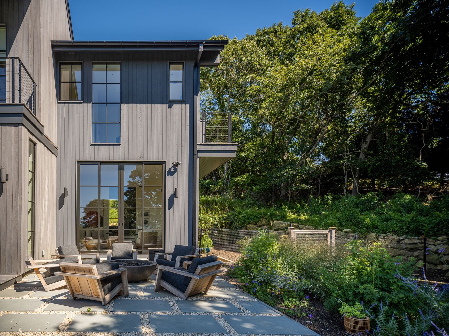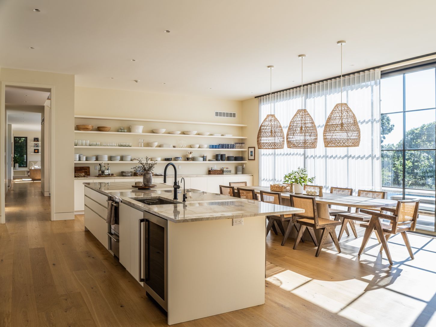 Designed by Michaelis Boyd, the home blends modern architecture with farmhouse warmth. Floor-to-ceiling glass frames sweeping sunset views across the bay to Gardiners Island, blurring indoor and outdoor living.