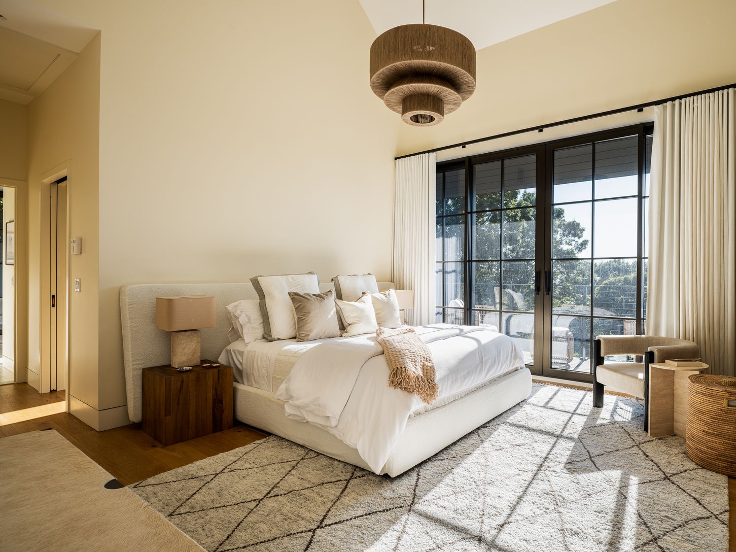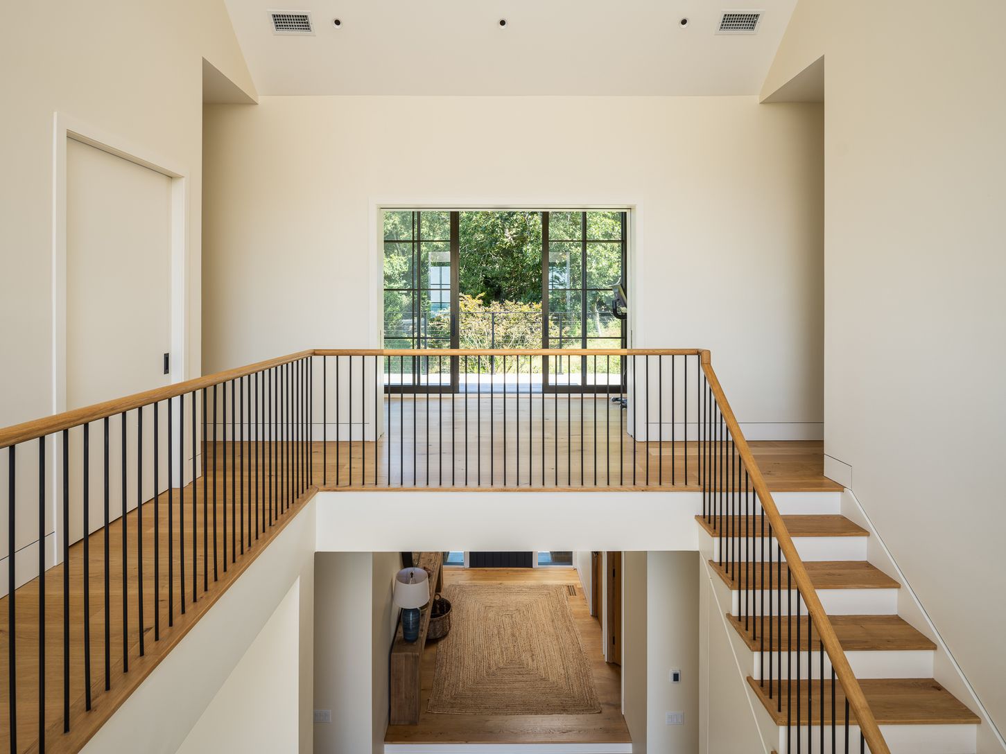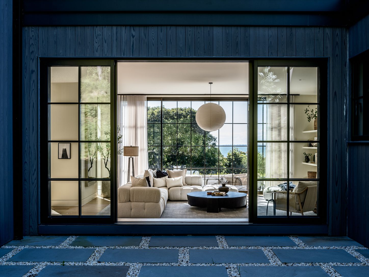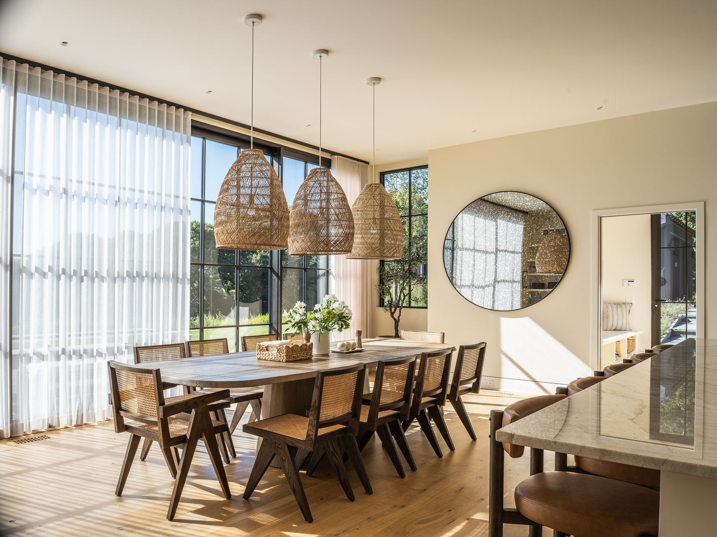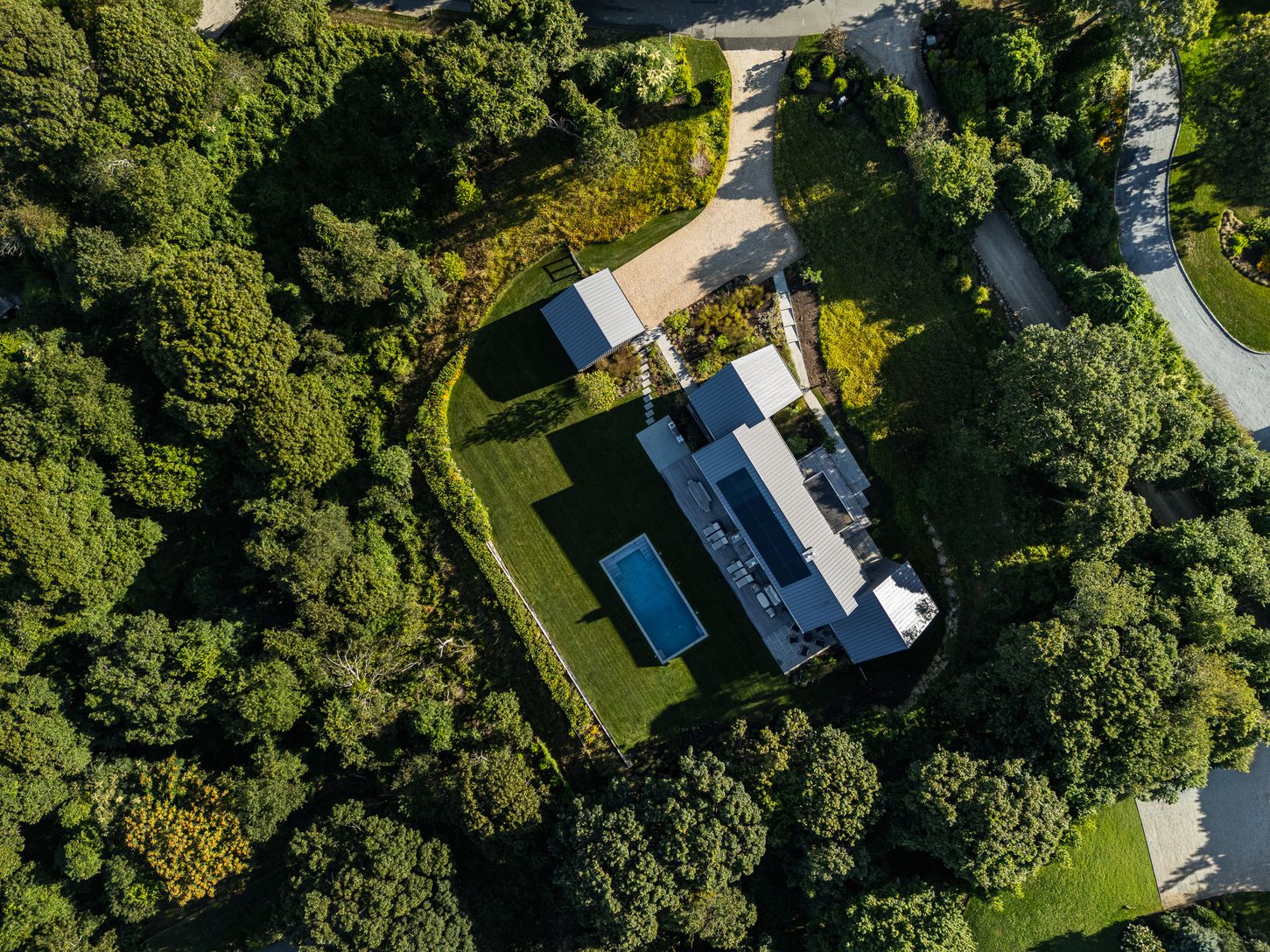 Designed by Michaelis Boyd, the home blends modern architecture with farmhouse warmth. Floor-to-ceiling glass frames sweeping sunset views across the bay to Gardiners Island, blurring indoor and outdoor living.