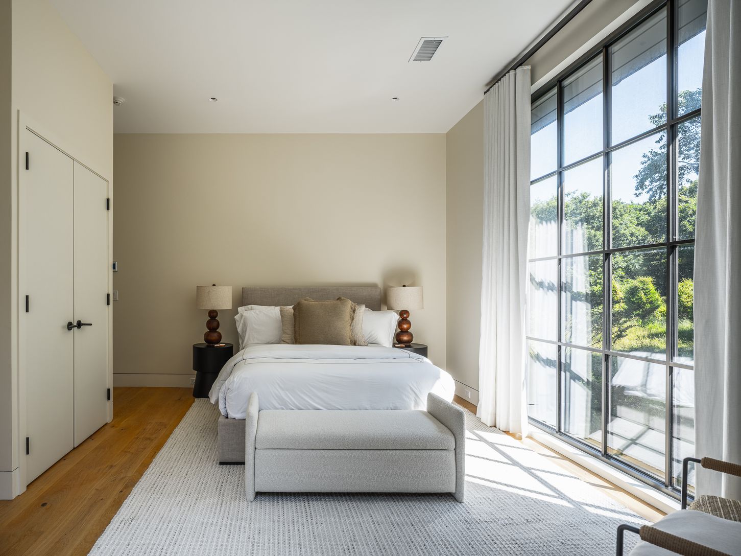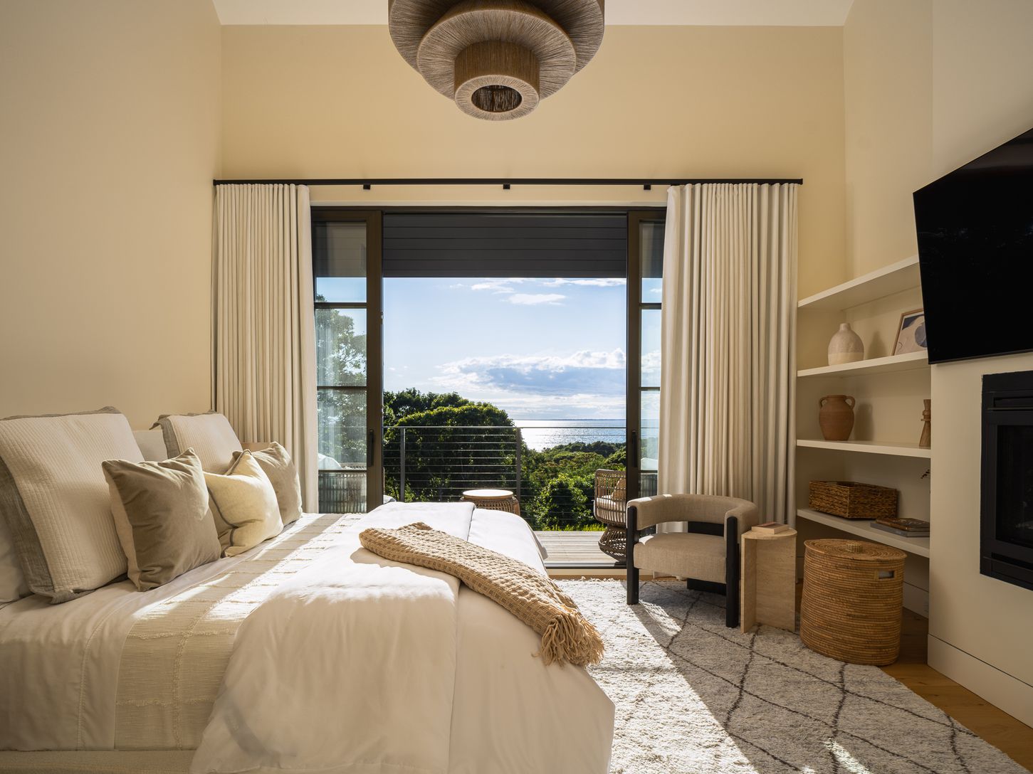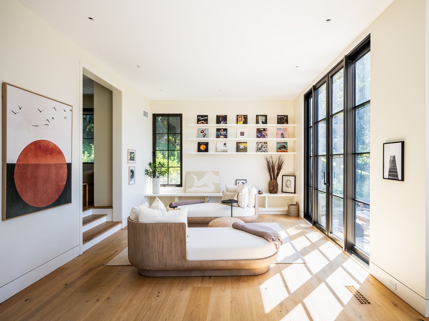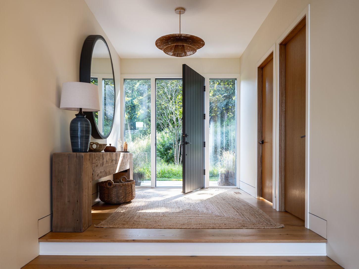 Designed by Michaelis Boyd, the home blends modern architecture with farmhouse warmth. Floor-to-ceiling glass frames sweeping sunset views across the bay to Gardiners Island, blurring indoor and outdoor living.