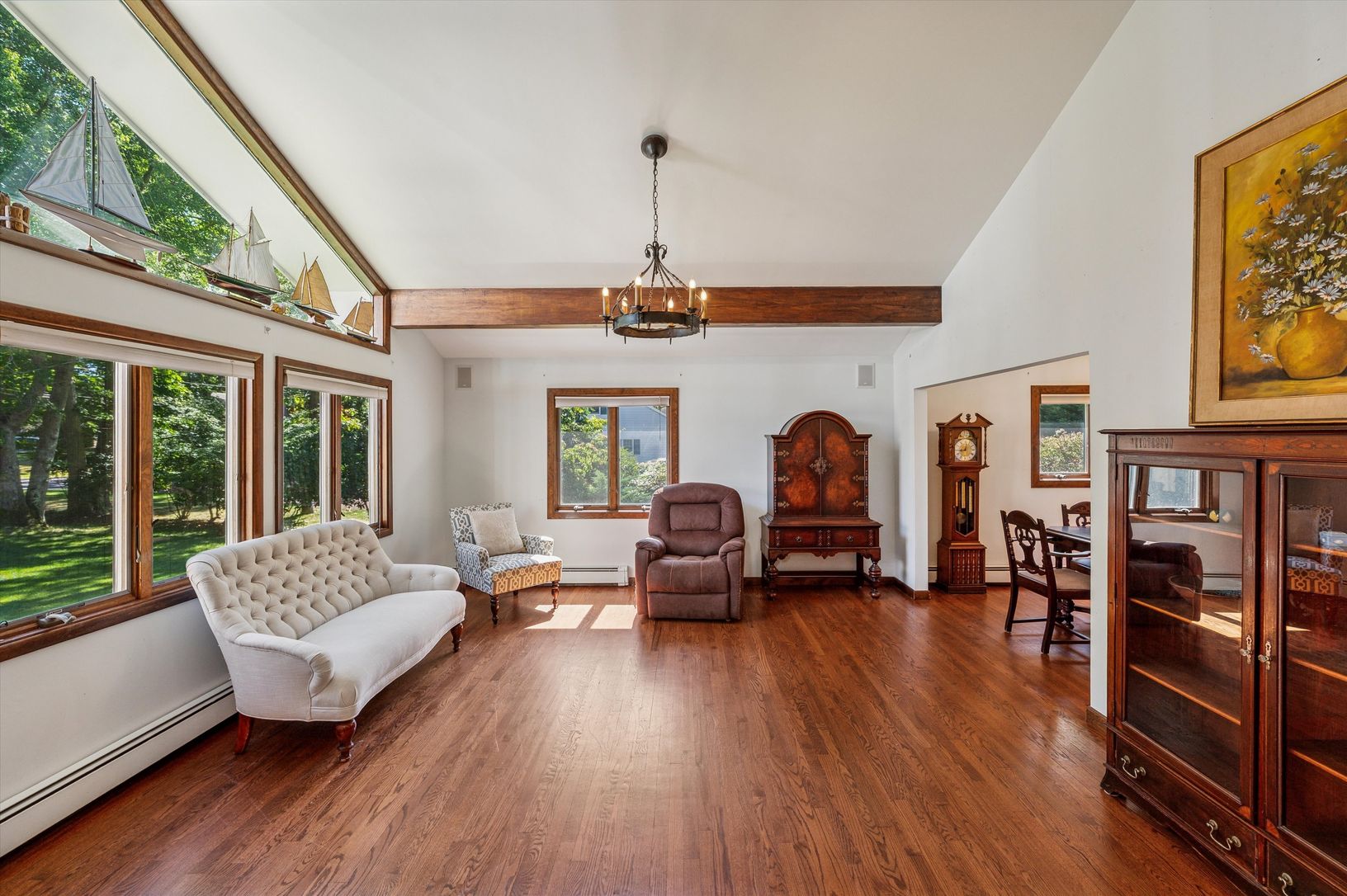 South of the highway in a private, sought-after Westhampton neighborhood, this lovingly maintained 3-bedroom, 3-bath home with office showcases pride of ownership. A pristine circular driveway, mature landscaping, and updated cedar plank exterior set the tone, leading inside to cathedral ceilings and an airy open layout with formal living and dining rooms. The light-filled kitchen opens to a spacious den with fireplace and sliders to dual ceda