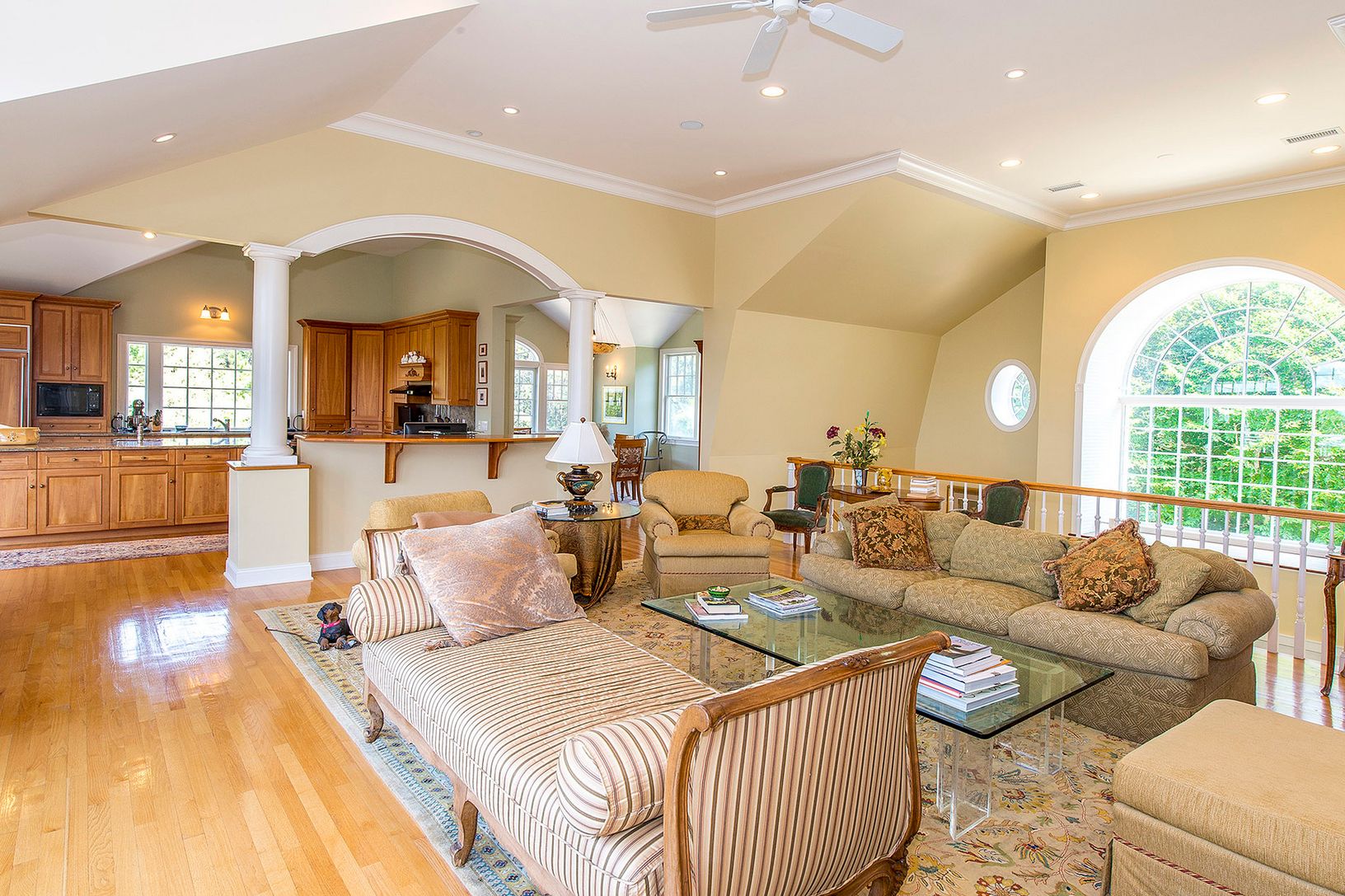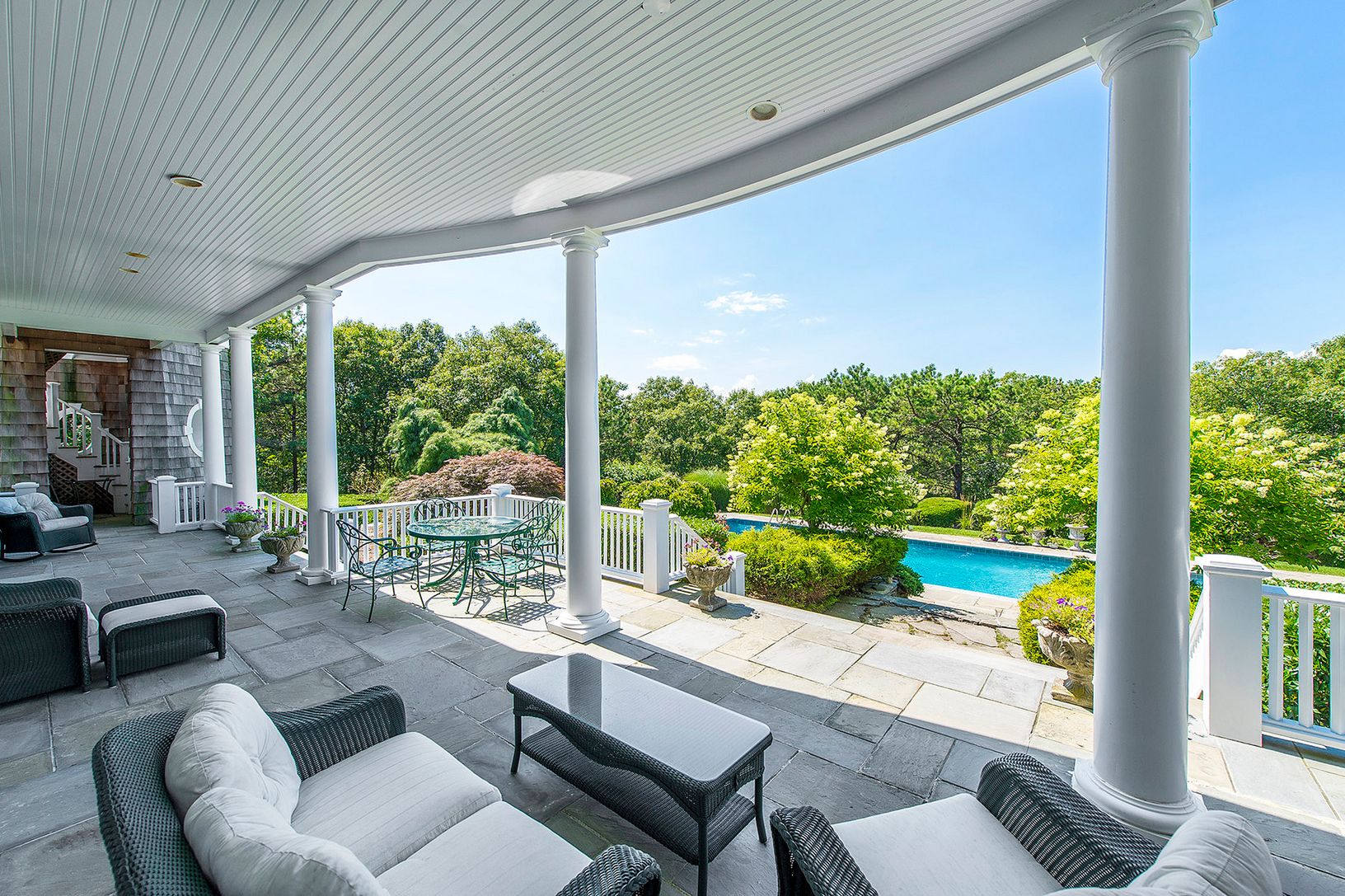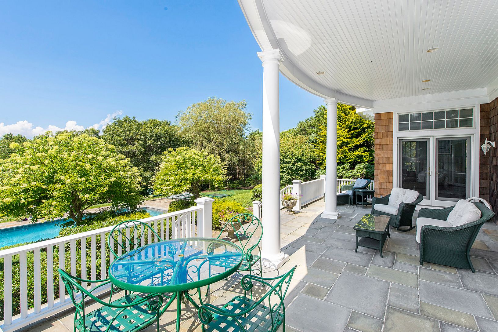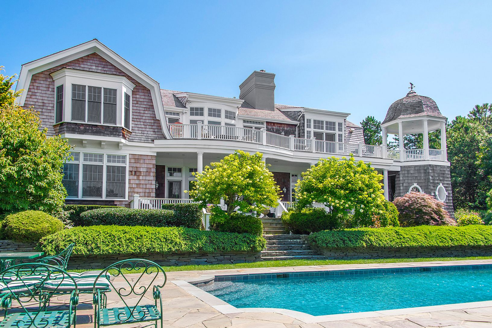 Stately Southampton traditional on 1.85 acres surrounded by 50 acres of county reserve. Enter through the double height foyer and ascend to see a magnificent 180 degree Peconic Bay view in this unique upside down construction. The upstairs boasts an open floor plan with gourmet kitchen, formal dining and great room as well as the oversized master suite. Three sets of French doors lead to a the second-story wrap-around deck providing great l