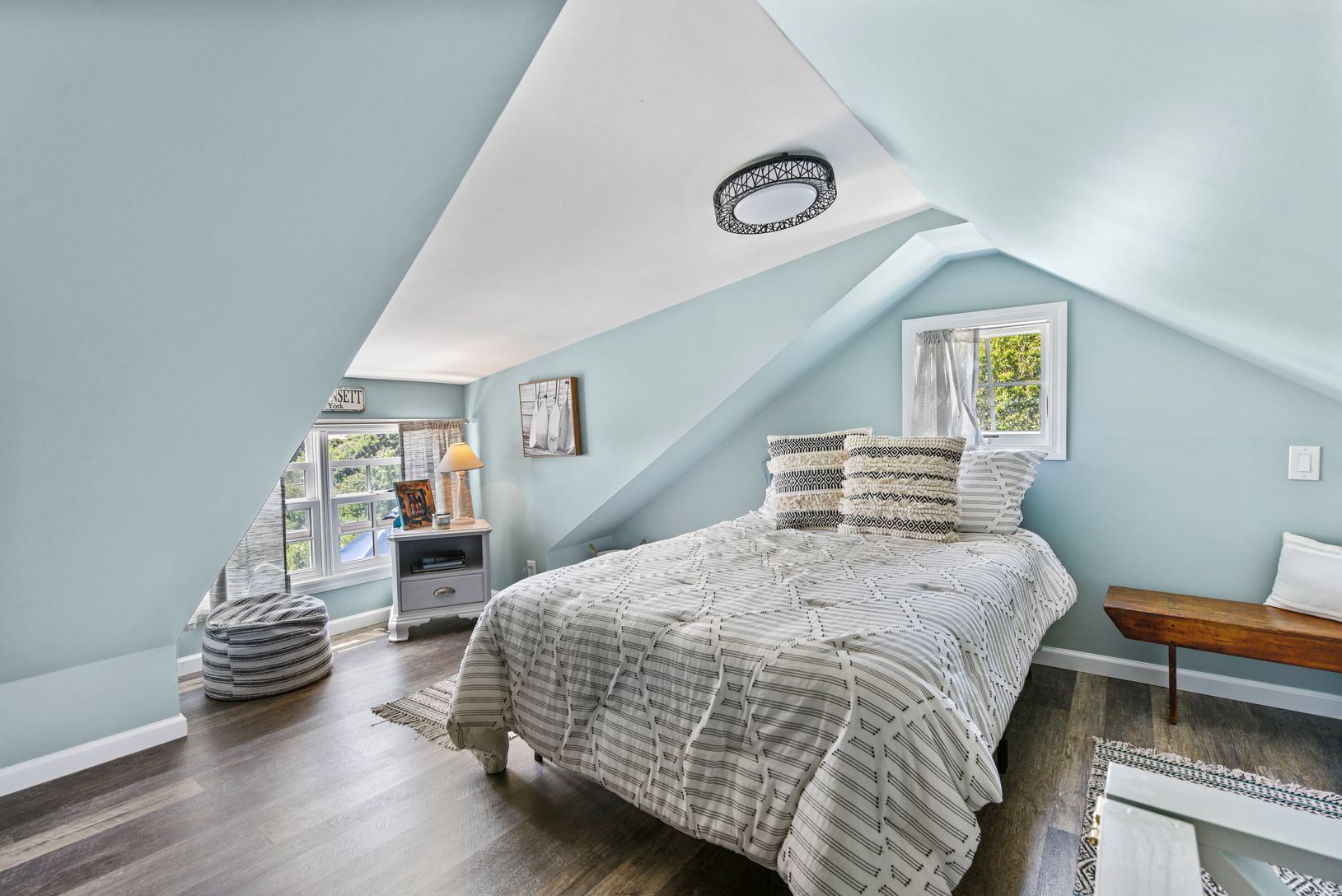 Perfectly situated between the Ocean beach and coveted Amagansett Village is this charming cedar shingle cottage perched high above the Dunes. Open space living leads out to gracious indoor outdoor deck space featuring outdoor living room, several seating areas, an outdoor shower, generous lawn for play all within a short stroll to the coveted private beach. The house features two main bedrooms, with a bonus sleeping loft~ attached garage room