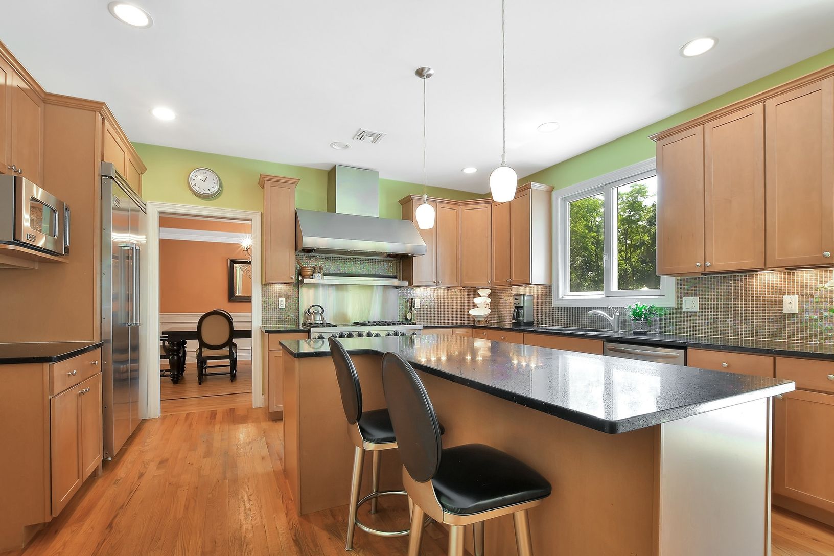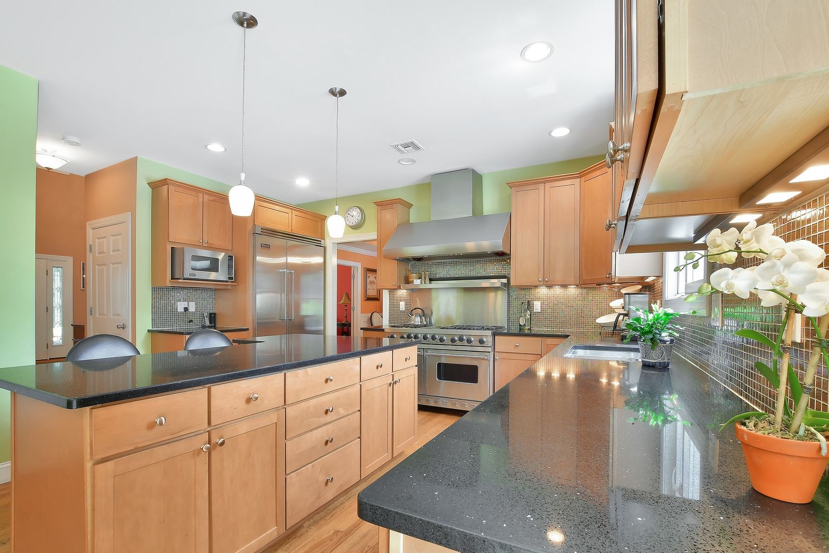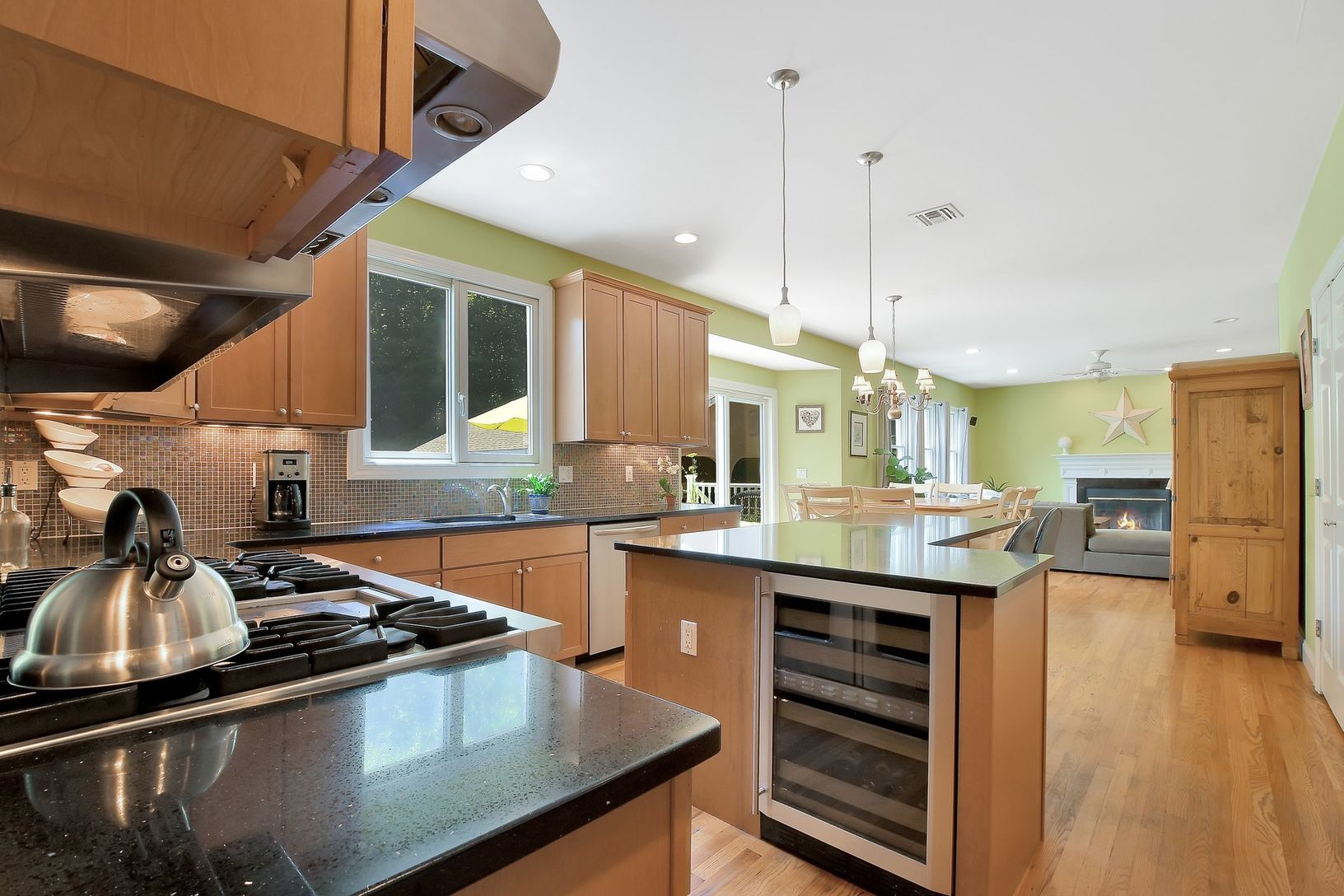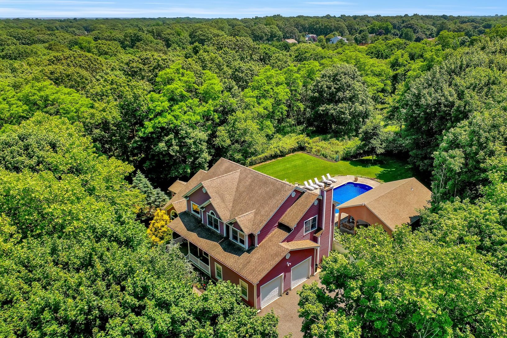 Surrounded by professionally landscaped grounds and buffered by hundreds of mature oak and maple trees this one of a kind post modern gem on 2.2 acres was born to shine. The large country-style front porch and grand entry foyer are a prelude for good things to come. The over-sized chef’s kitchen is a joy to behold and includes an l- shaped center island with wine fridge and breakfast seating, black granite tops, custom maple cabinets and comme
