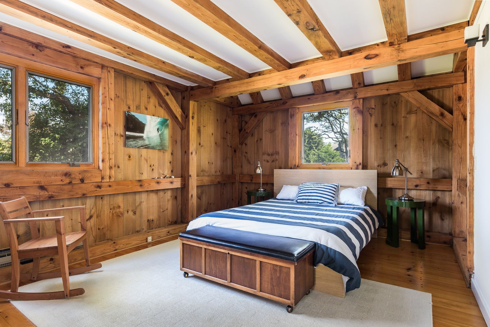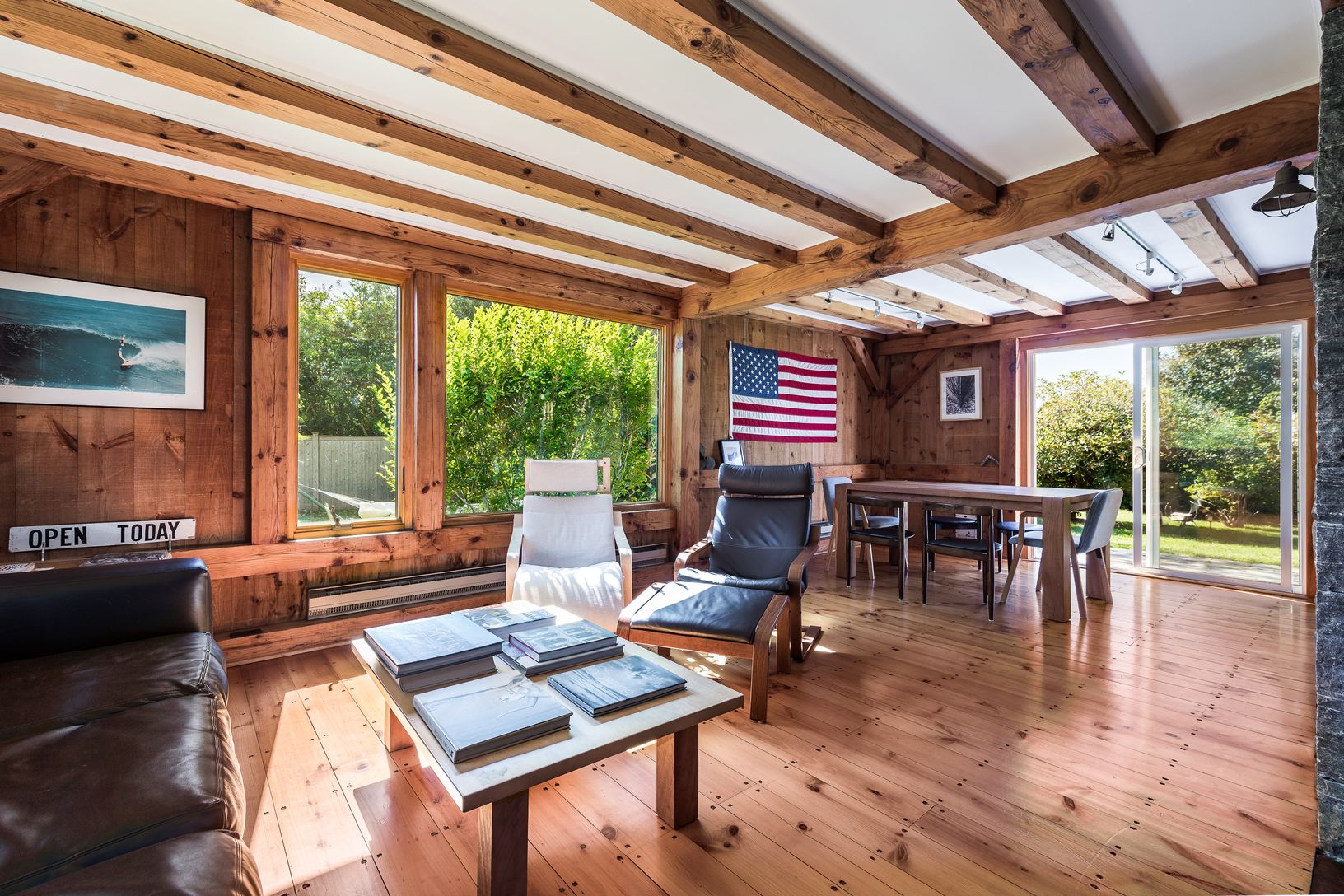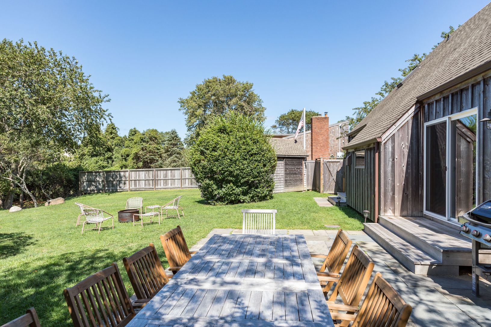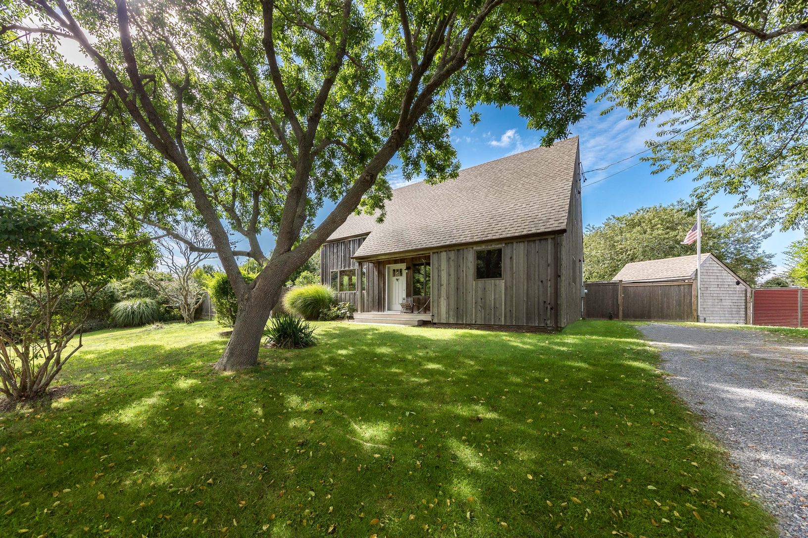 Centrally located in Montauk, this lovely home offers two bedrooms and two full bathrooms on a park-like property set back from the road. The spacious first floor living area is open and light filled with large picture windows and sliders to the rear of the property. There is a wood burning in the living room, while the dining area and kitchen are situated with easy patio access. This level has a full bathroom, guest bedroom, and a walk-in pan
