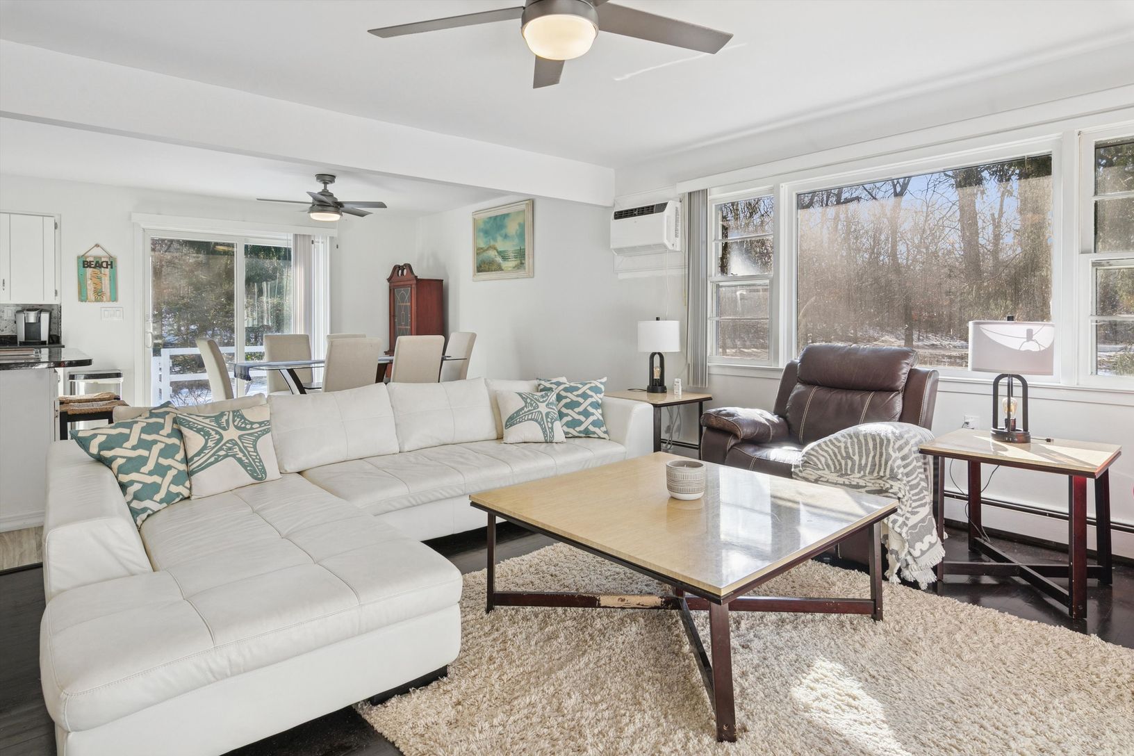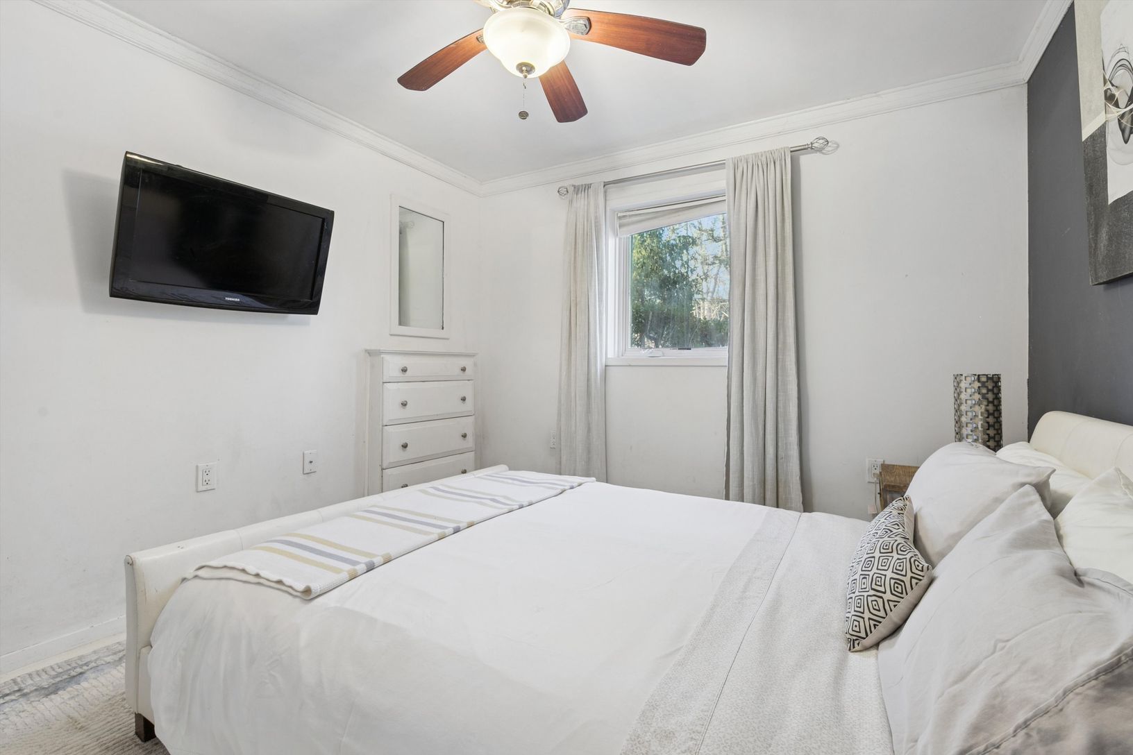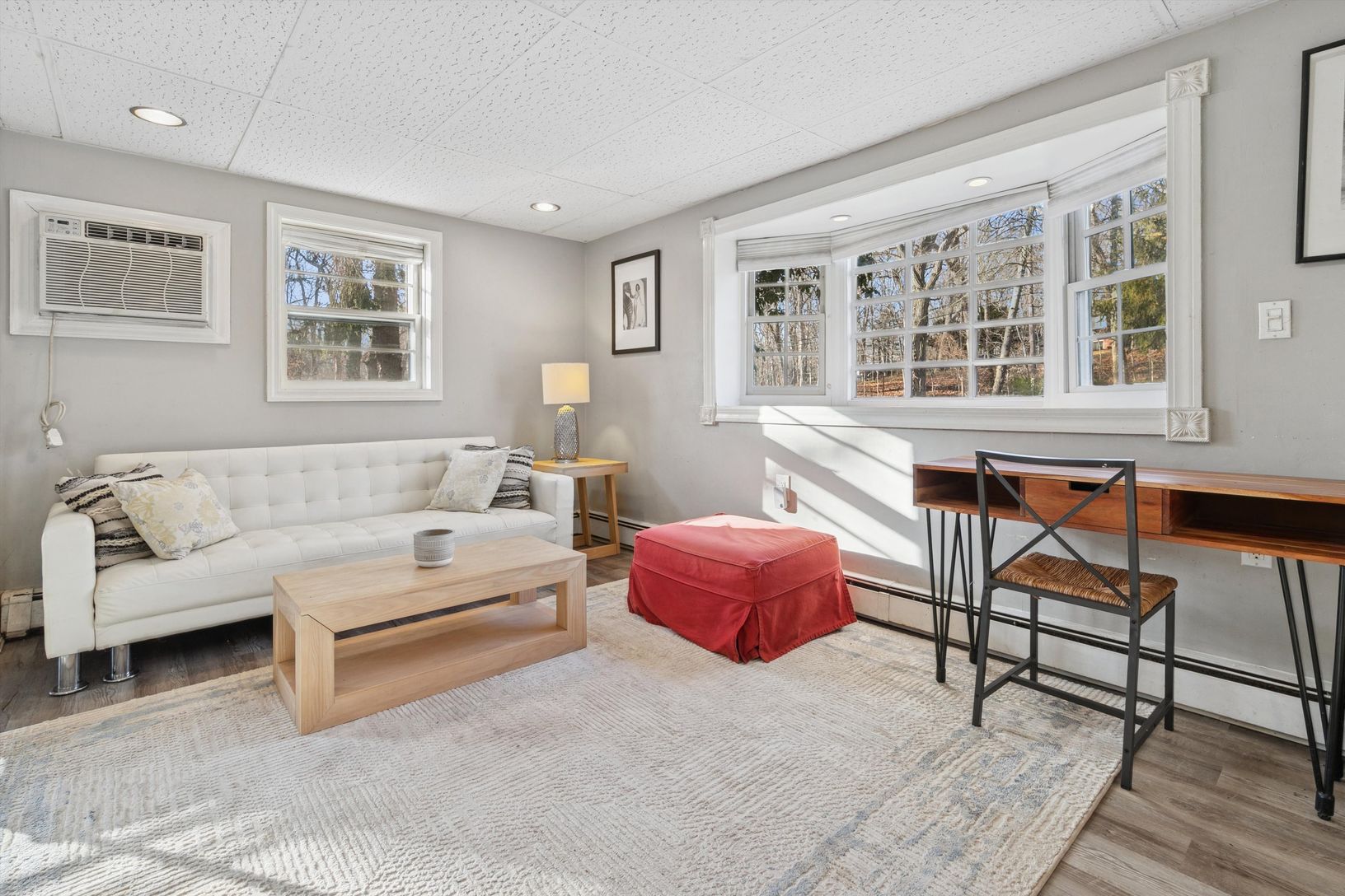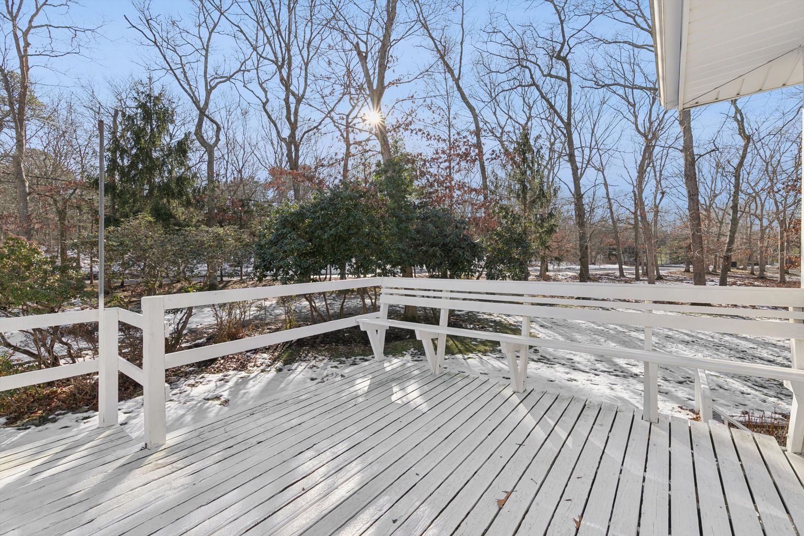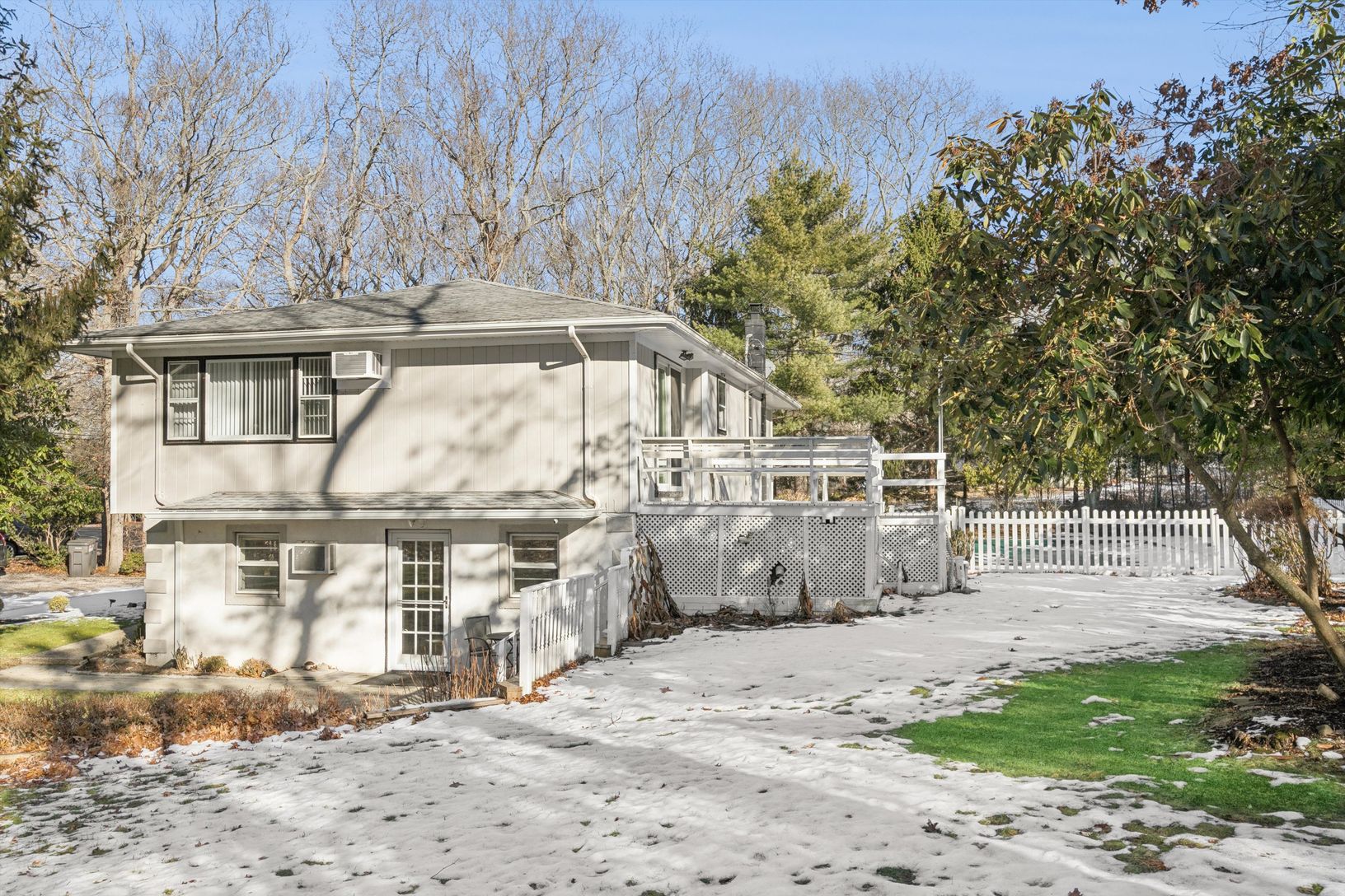 This Southampton summer rental at 1520 Majors Path is a stylish high ranch offering ample living space across two levels. Upstairs, you'll find an open-plan kitchen, dining, and living room area equipped with all necessary appliances, including a microwave and gas stove, which flows seamlessly out to the sunny deck and pool area. The hallway leads to a full bathroom with a tub and shower and two bedrooms: a guest room with a queen-size bed and