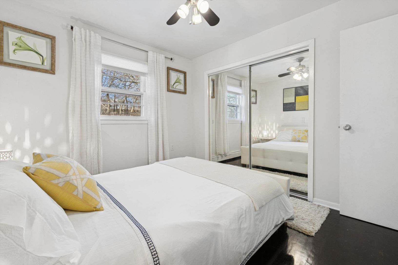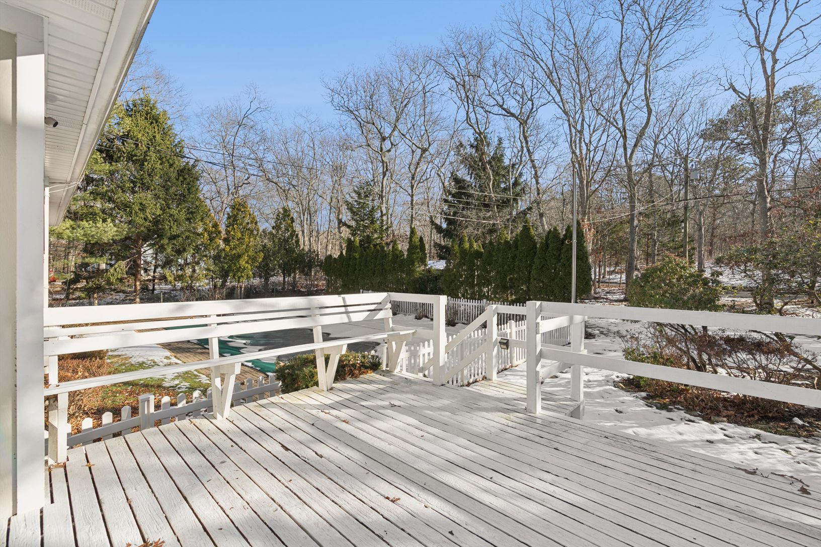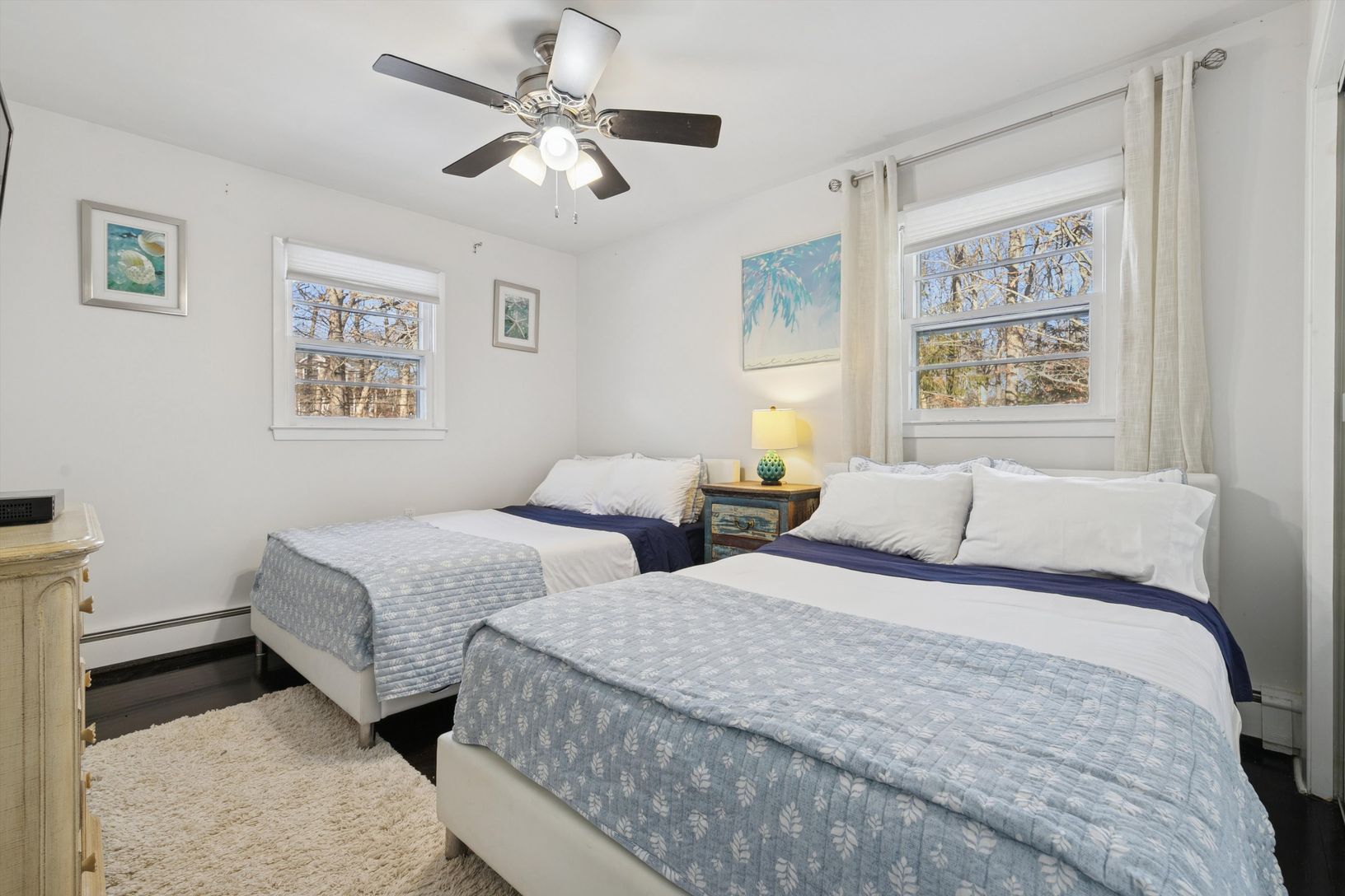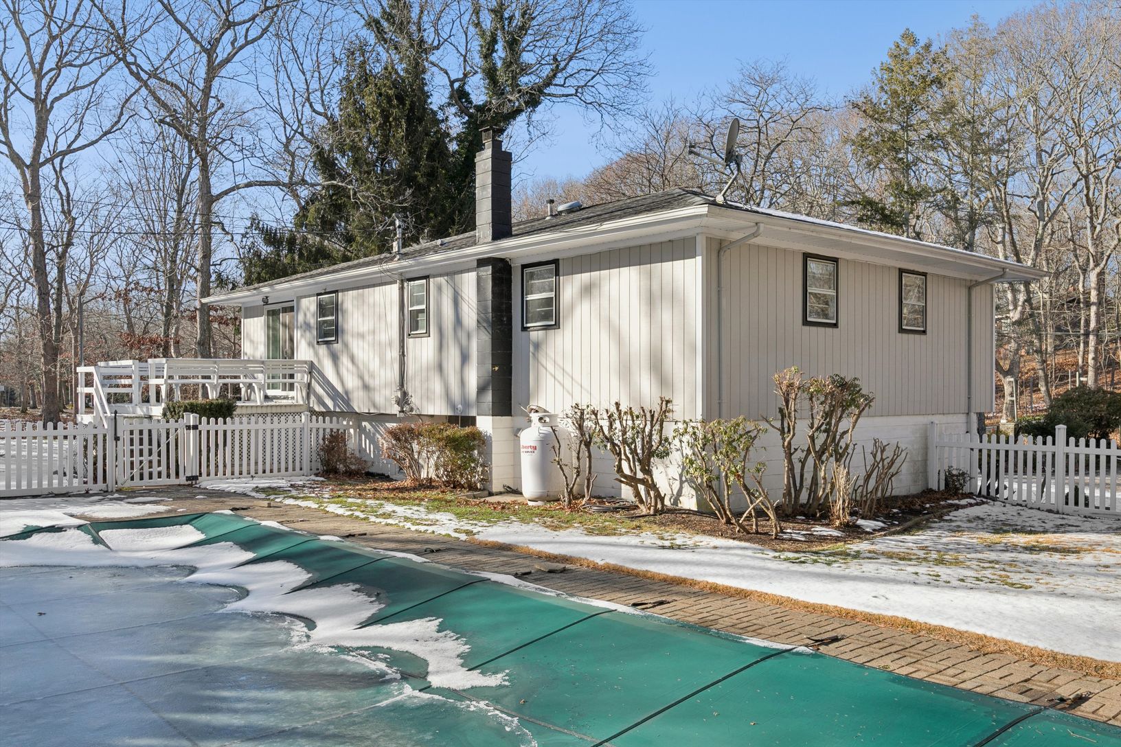 This Southampton summer rental at 1520 Majors Path is a stylish high ranch offering ample living space across two levels. Upstairs, you'll find an open-plan kitchen, dining, and living room area equipped with all necessary appliances, including a microwave and gas stove, which flows seamlessly out to the sunny deck and pool area. The hallway leads to a full bathroom with a tub and shower and two bedrooms: a guest room with a queen-size bed and