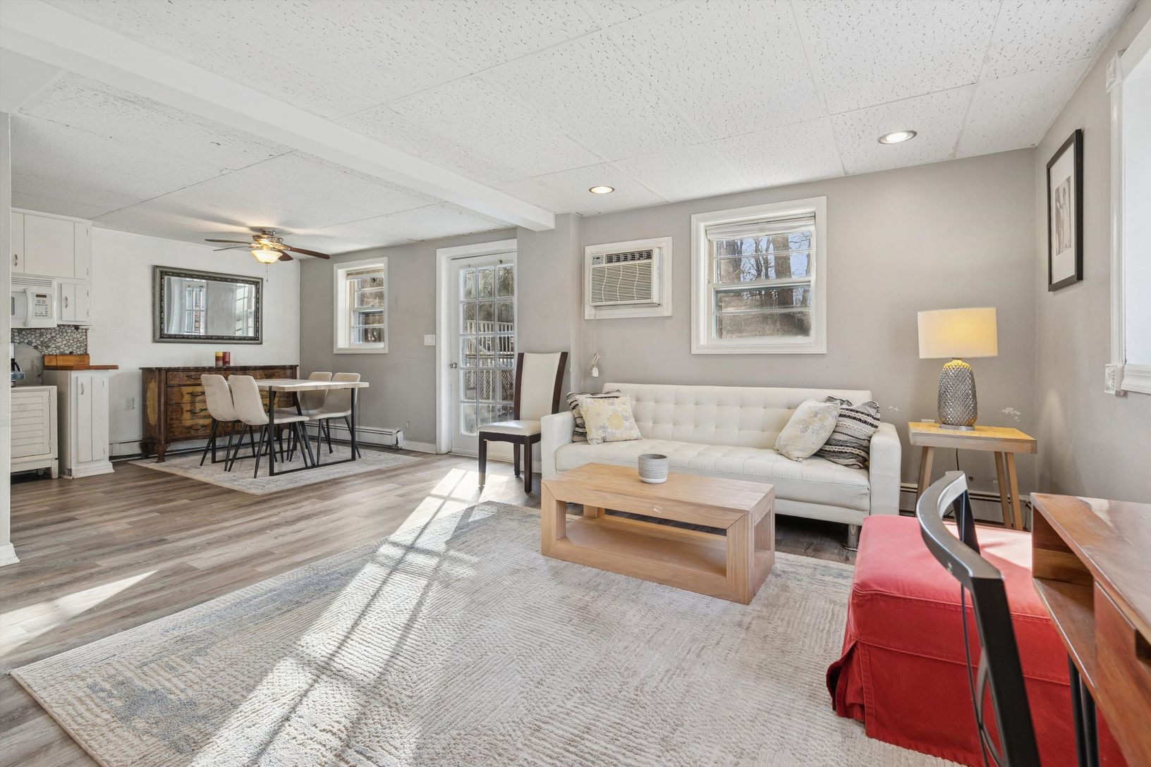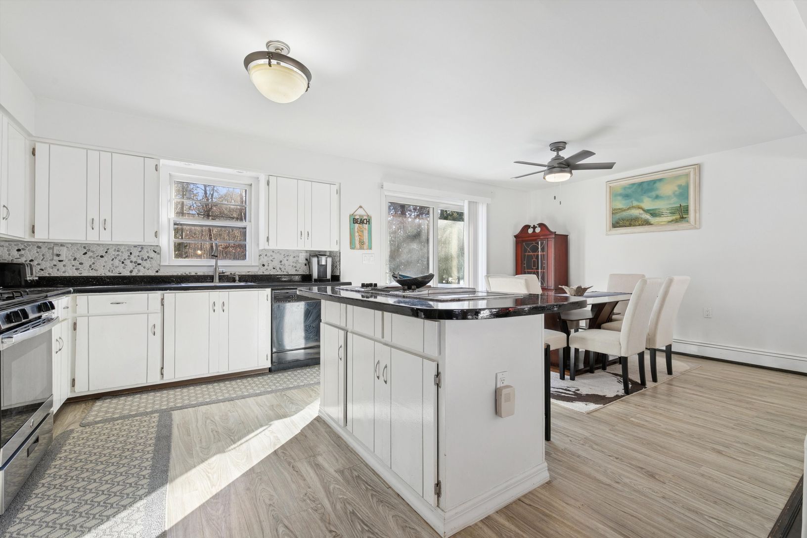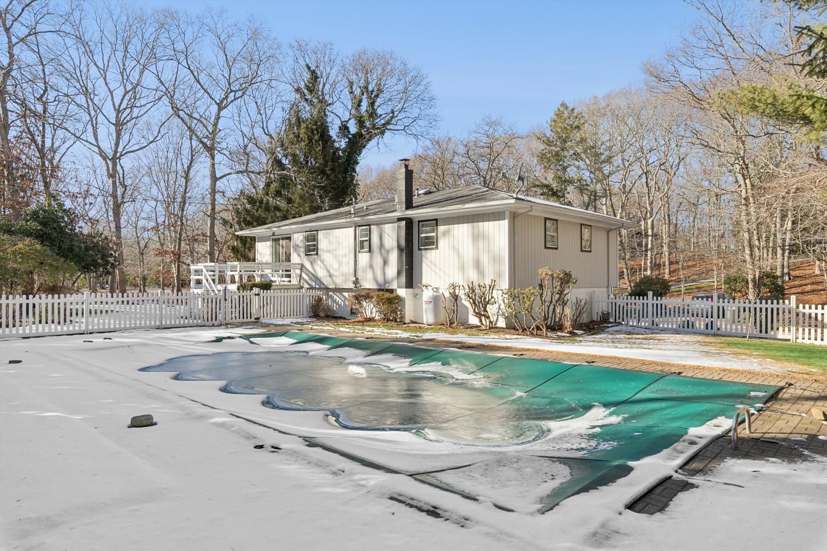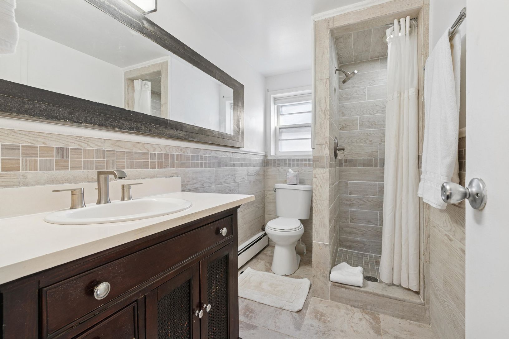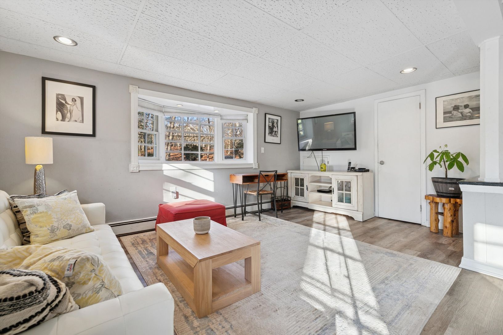 This Southampton summer rental at 1520 Majors Path is a stylish high ranch offering ample living space across two levels. Upstairs, you'll find an open-plan kitchen, dining, and living room area equipped with all necessary appliances, including a microwave and gas stove, which flows seamlessly out to the sunny deck and pool area. The hallway leads to a full bathroom with a tub and shower and two bedrooms: a guest room with a queen-size bed and