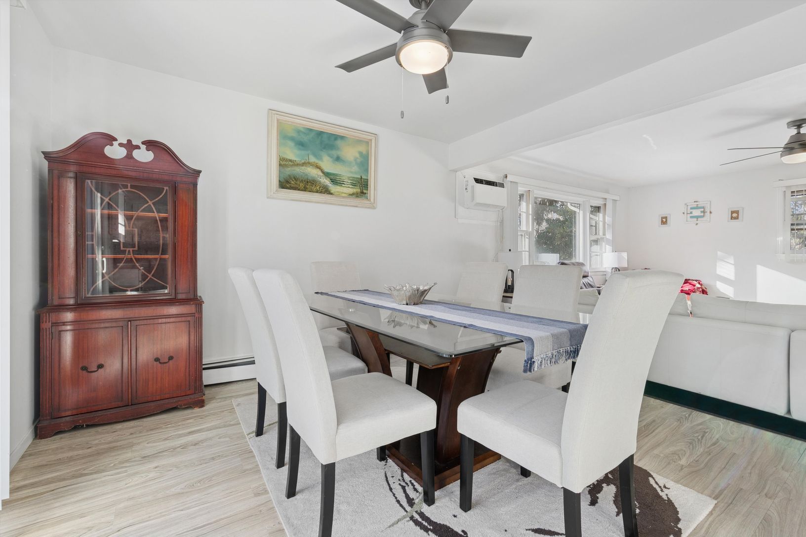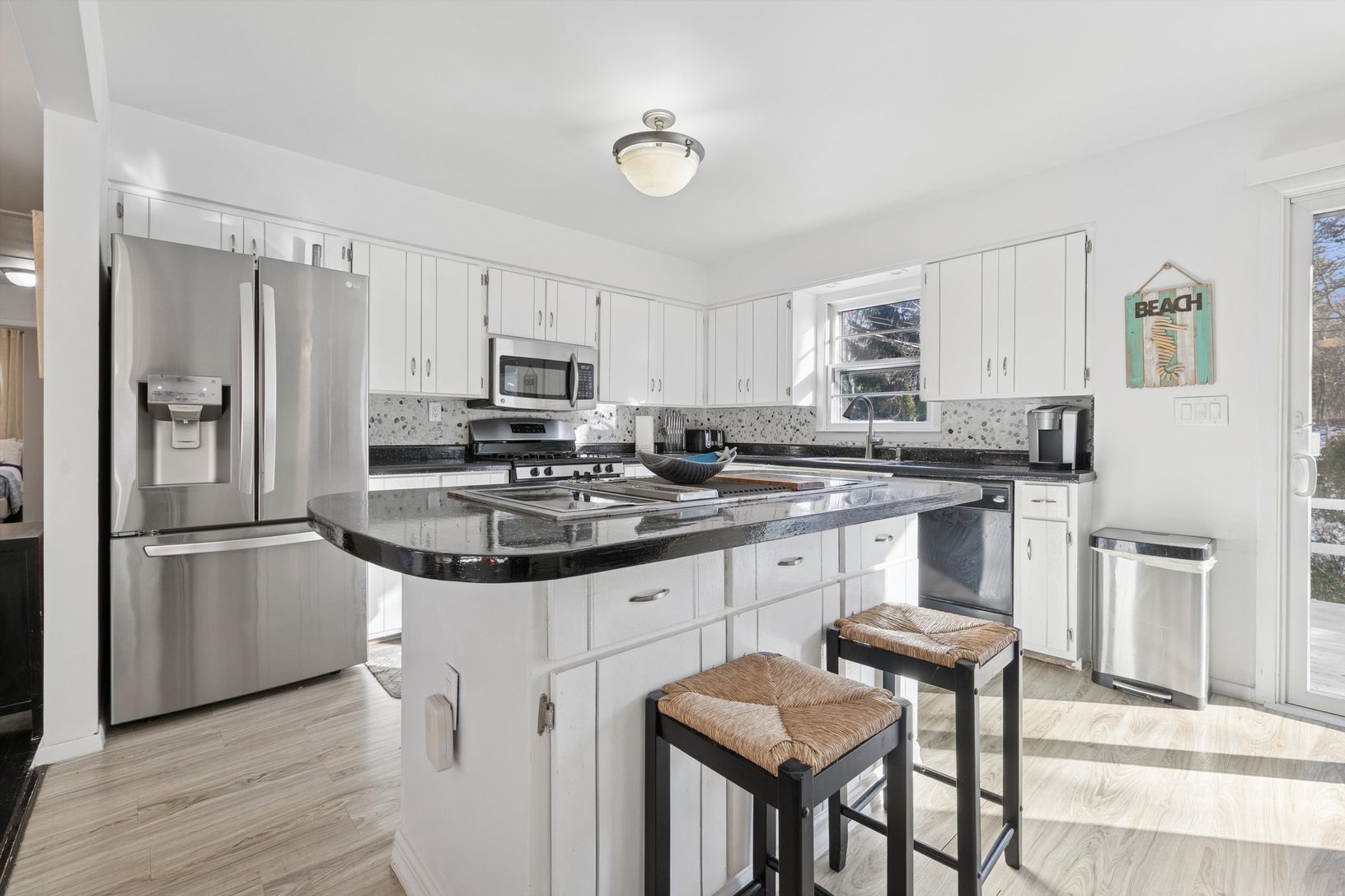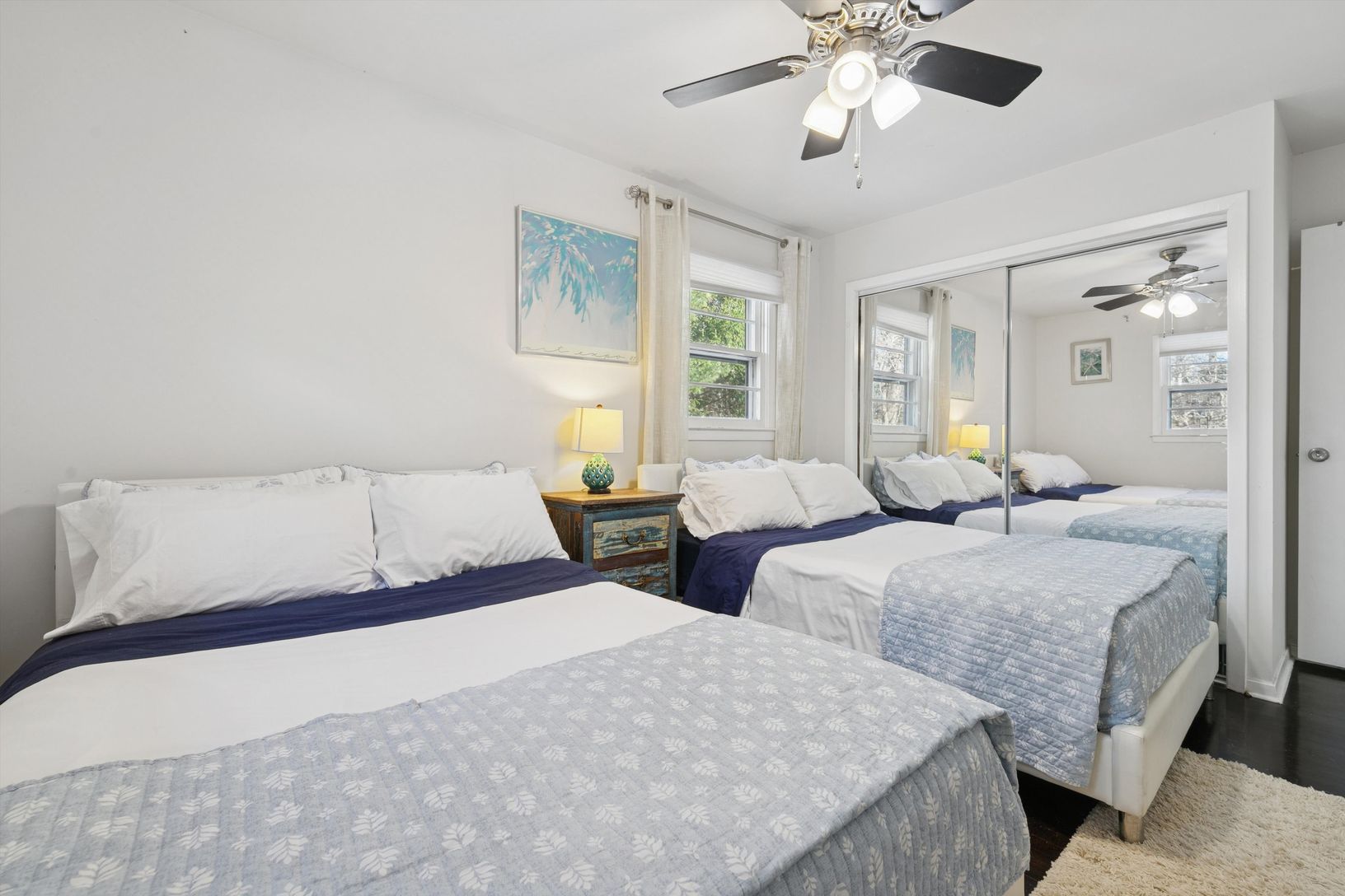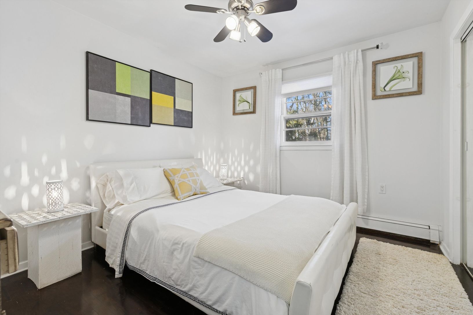 This Southampton summer rental at 1520 Majors Path is a stylish high ranch offering ample living space across two levels. Upstairs, you'll find an open-plan kitchen, dining, and living room area equipped with all necessary appliances, including a microwave and gas stove, which flows seamlessly out to the sunny deck and pool area. The hallway leads to a full bathroom with a tub and shower and two bedrooms: a guest room with a queen-size bed and