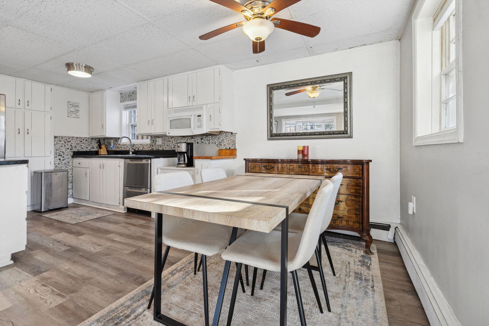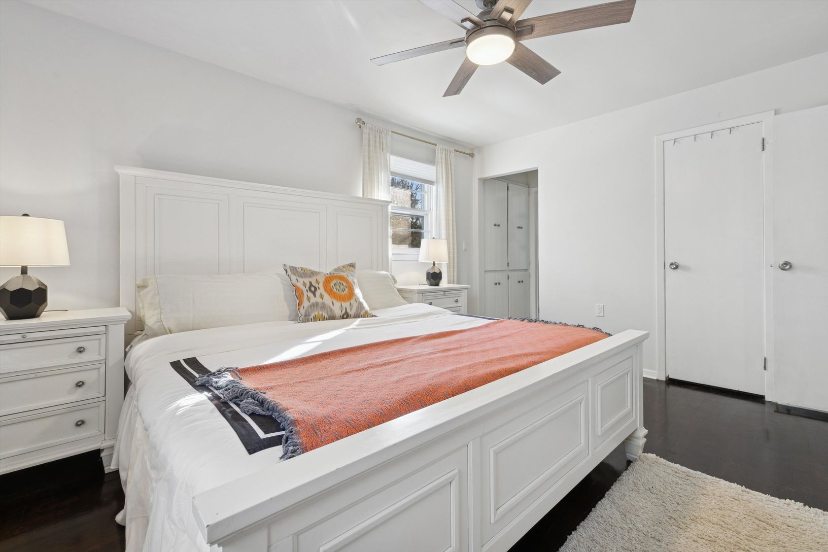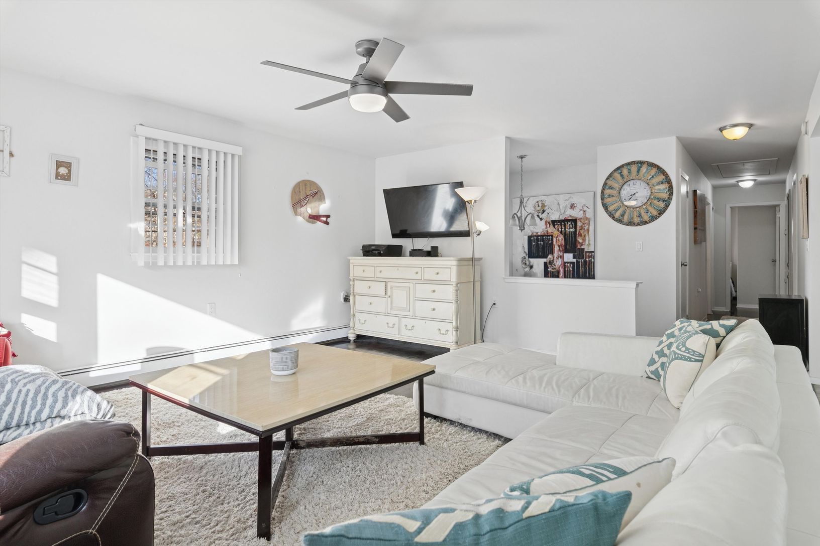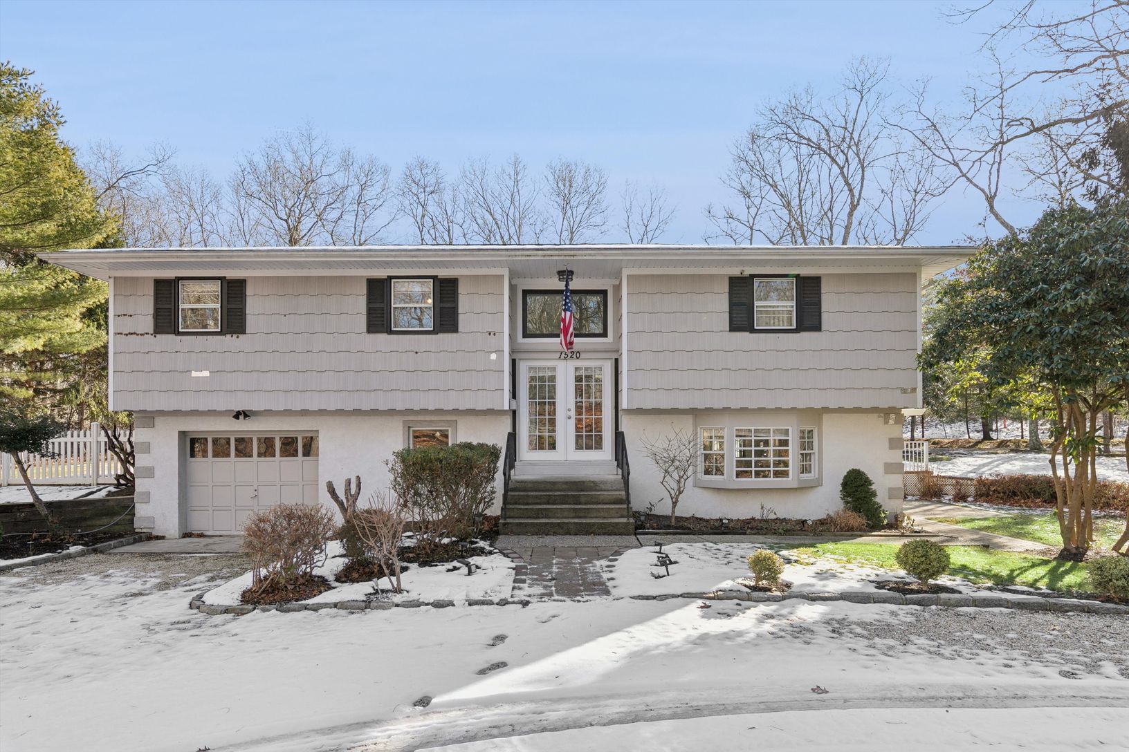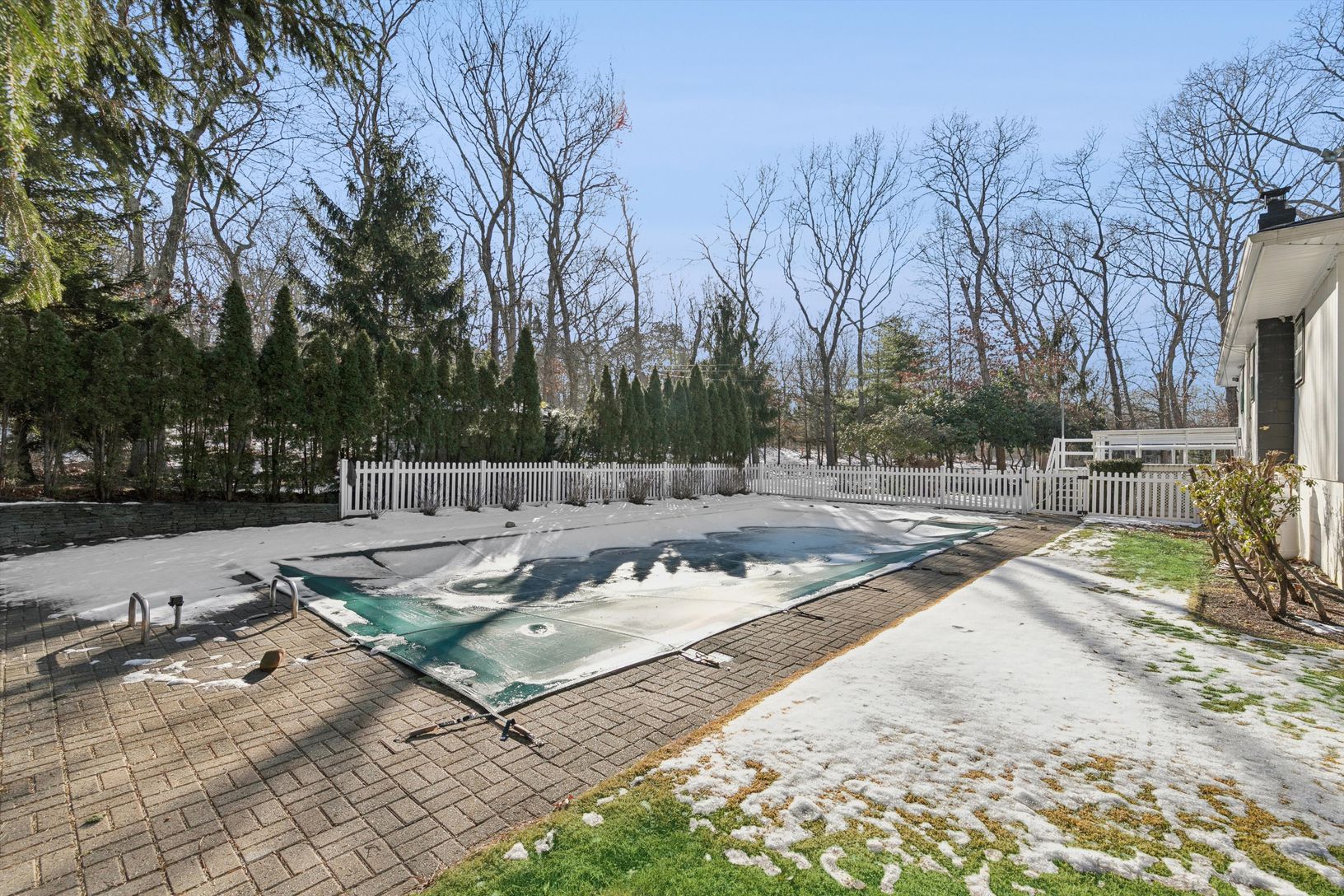 This Southampton summer rental at 1520 Majors Path is a stylish high ranch offering ample living space across two levels. Upstairs, you'll find an open-plan kitchen, dining, and living room area equipped with all necessary appliances, including a microwave and gas stove, which flows seamlessly out to the sunny deck and pool area. The hallway leads to a full bathroom with a tub and shower and two bedrooms: a guest room with a queen-size bed and