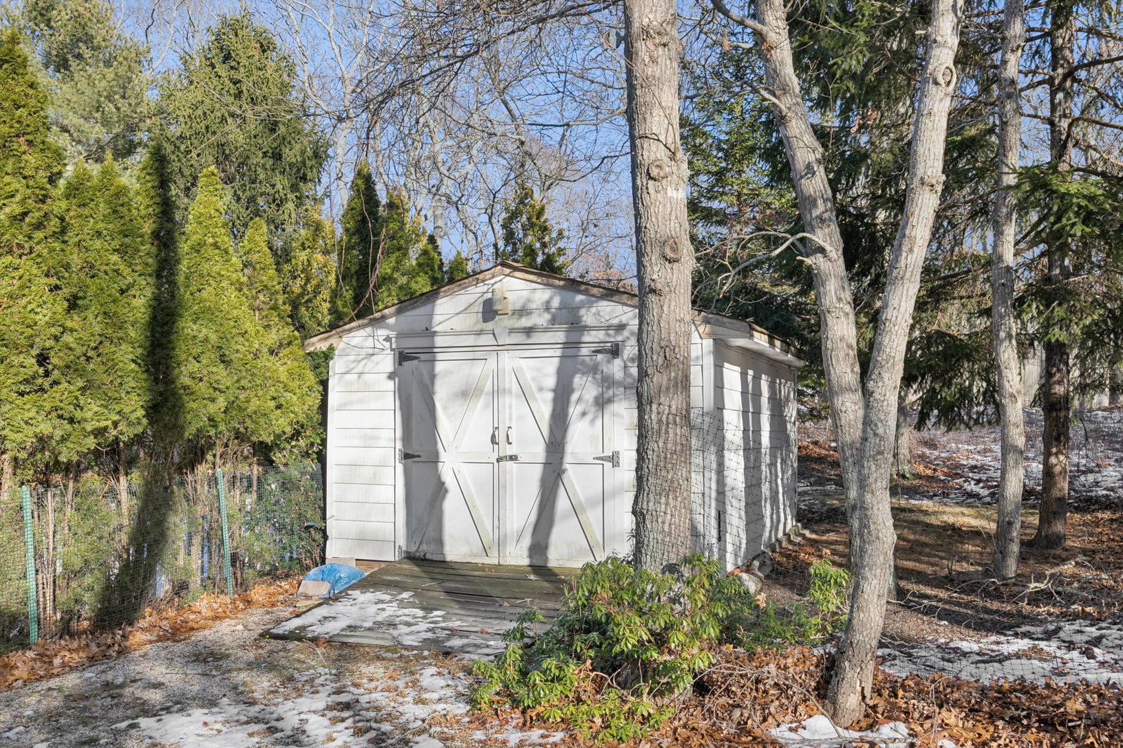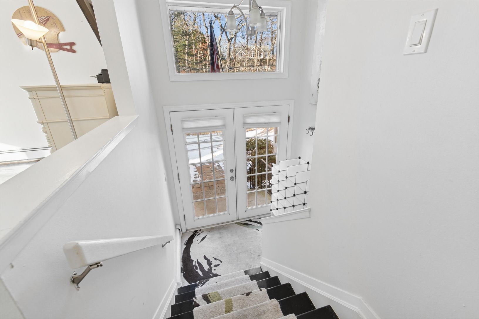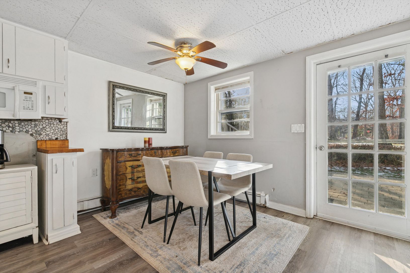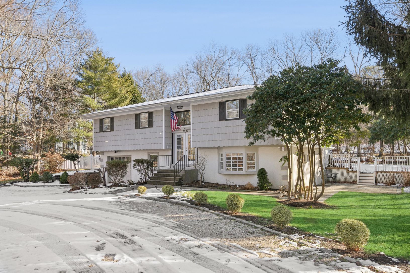This Southampton summer rental at 1520 Majors Path is a stylish high ranch offering ample living space across two levels. Upstairs, you'll find an open-plan kitchen, dining, and living room area equipped with all necessary appliances, including a microwave and gas stove, which flows seamlessly out to the sunny deck and pool area. The hallway leads to a full bathroom with a tub and shower and two bedrooms: a guest room with a queen-size bed and