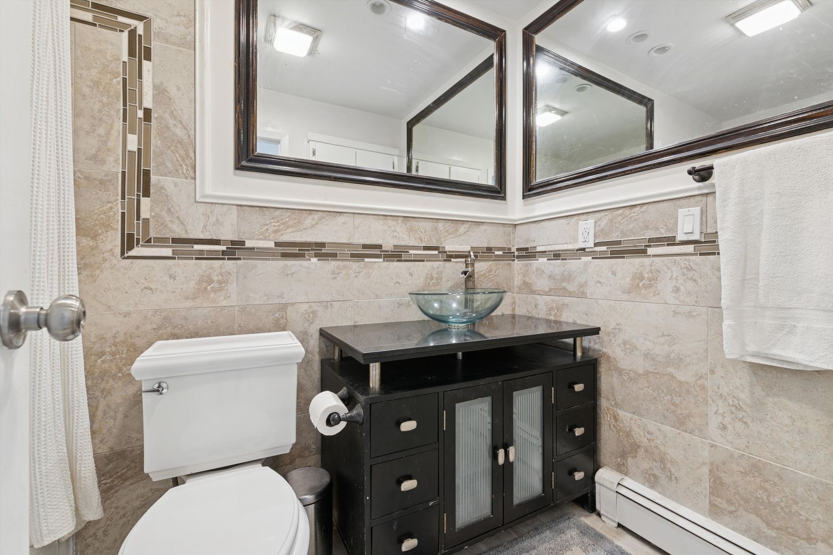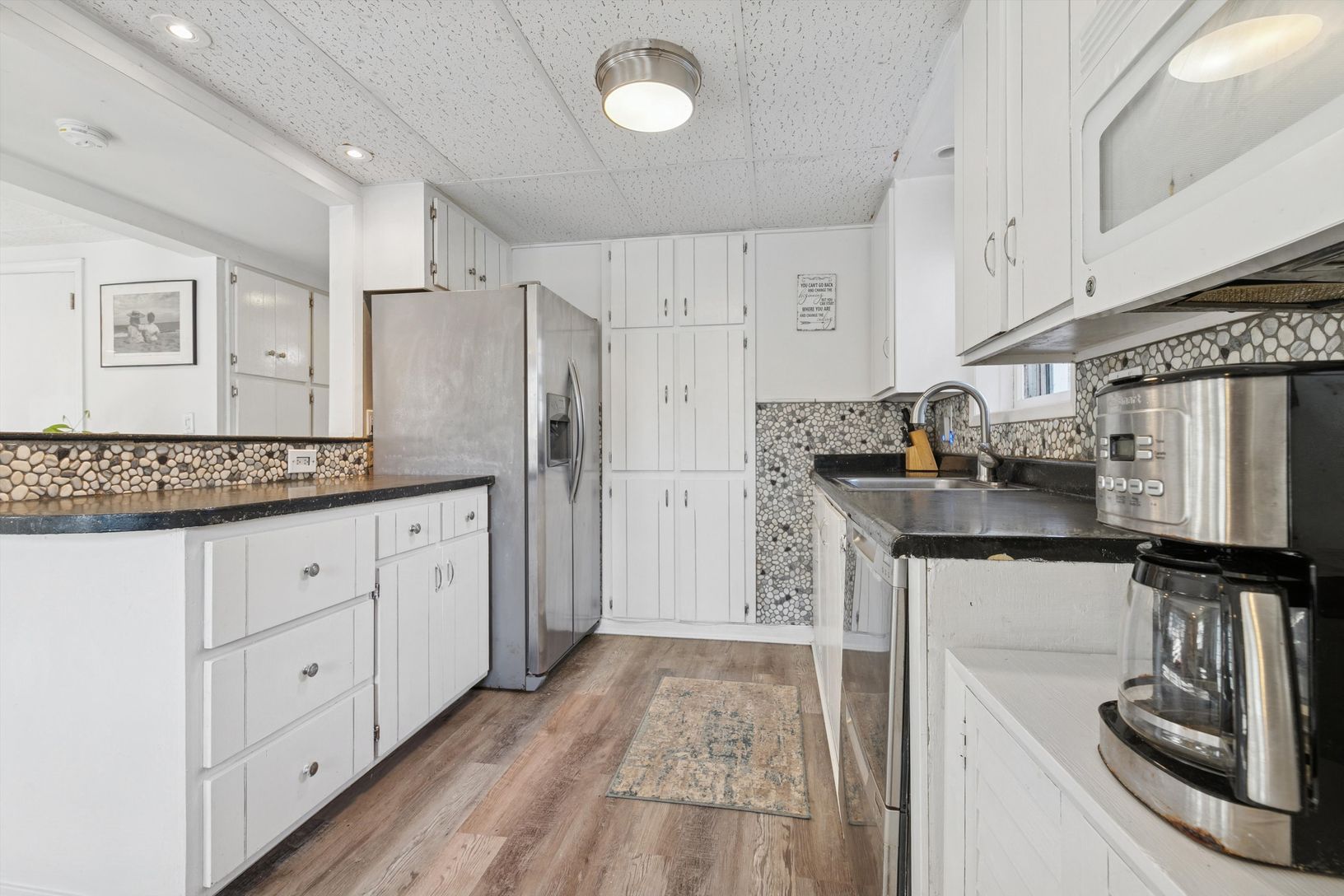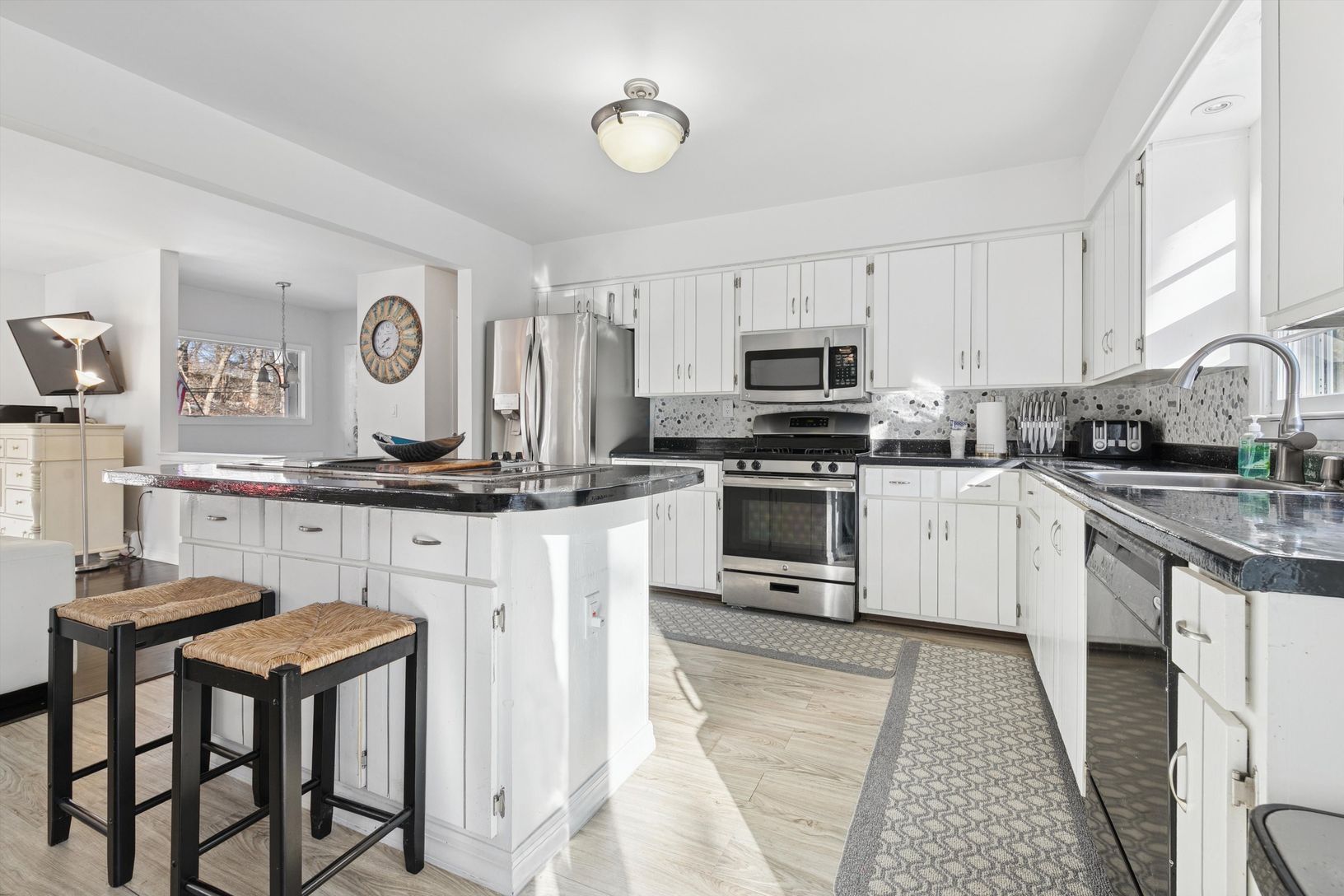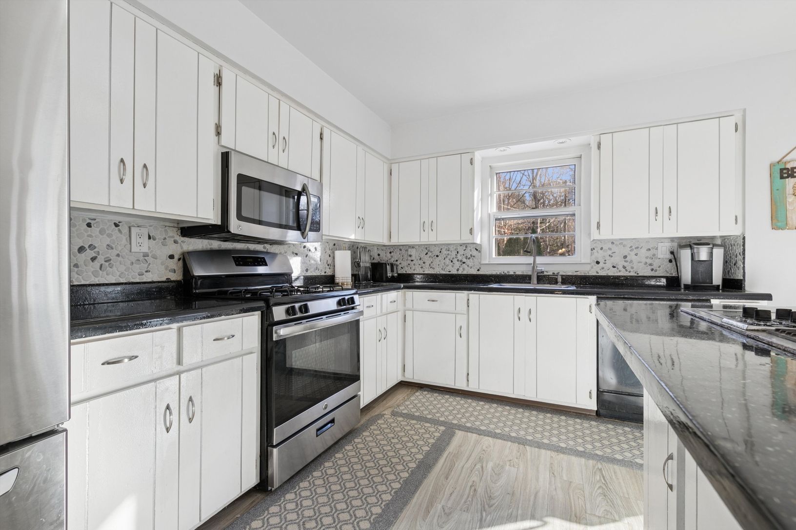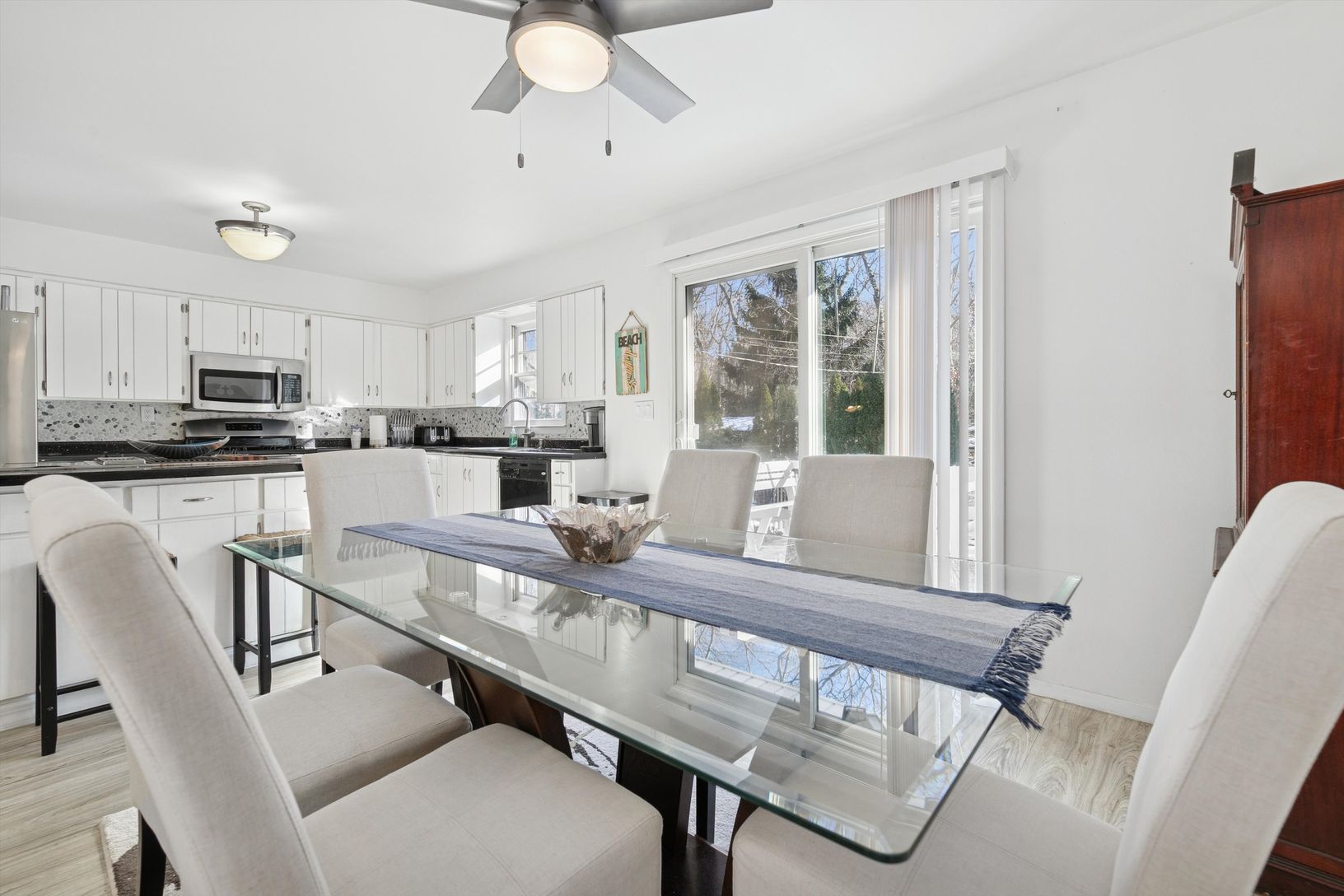 This Southampton summer rental at 1520 Majors Path is a stylish high ranch offering ample living space across two levels. Upstairs, you'll find an open-plan kitchen, dining, and living room area equipped with all necessary appliances, including a microwave and gas stove, which flows seamlessly out to the sunny deck and pool area. The hallway leads to a full bathroom with a tub and shower and two bedrooms: a guest room with a queen-size bed and