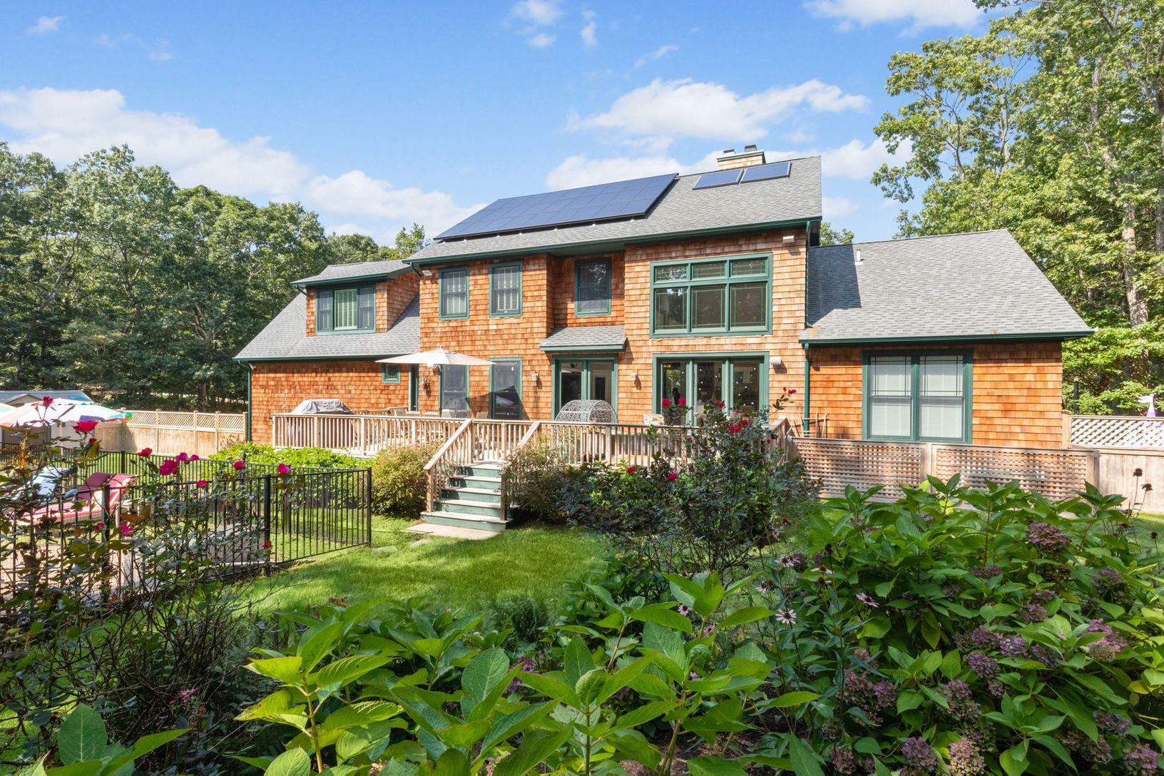 Located on a serene and beautifully landscaped acre, this well maintained traditional home provides every amenity one could ask for. The open floor plan offers a gourmet eat-in-kitchen, formal dining room, large butler's pantry with additional refrigerator, separate den, laundry room and powder room. The living room with a soaring cathedral ceiling and wood burning fireplace has a wall of windows overlooking the pool and perennial gardens and